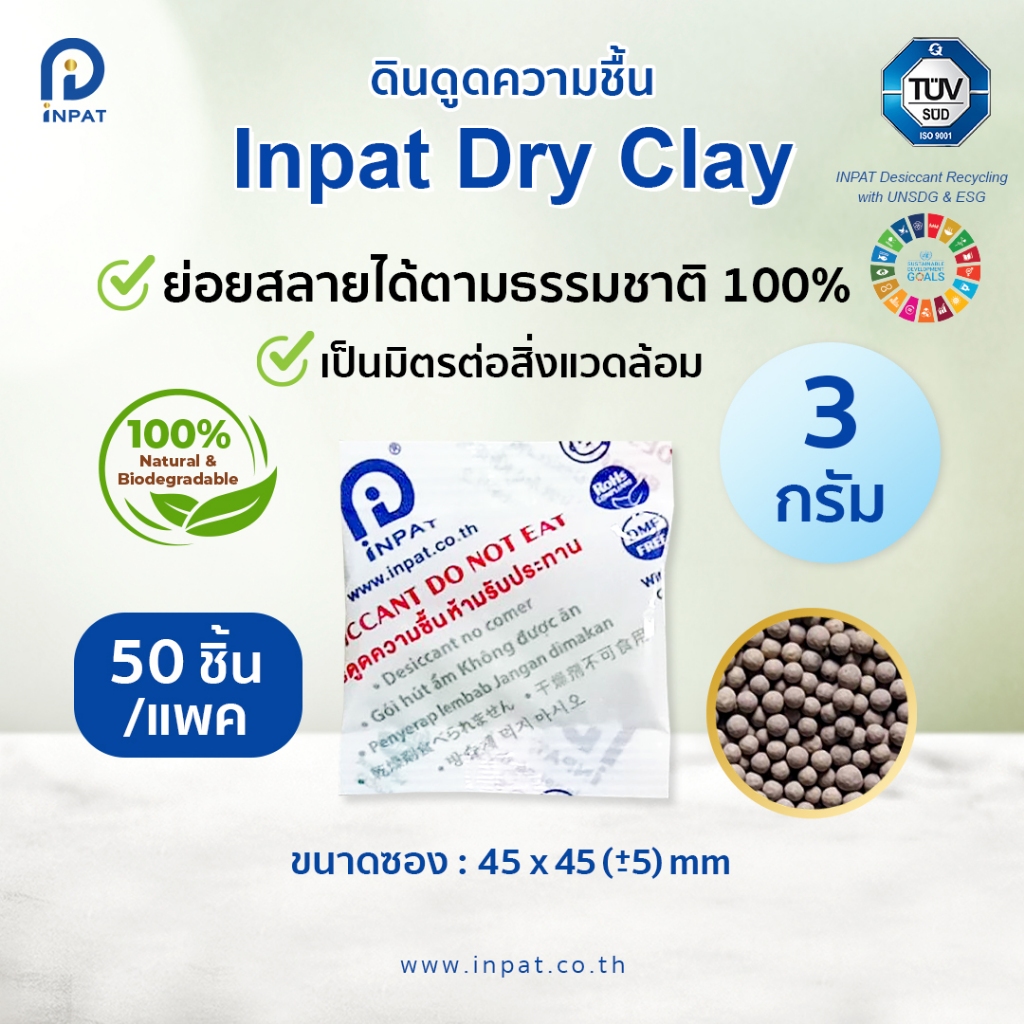 สารกันชื้น ดินดูดความชื้น 3 กรัม (50 ชิ้น/แพค) ย่อยสลายตามธรรมชาติได้ 100% - Inpat Dry Clay