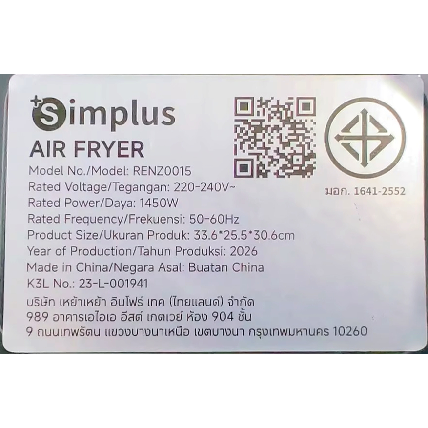 Simplus Air Fryer หม้อทอดไร้น้ำมัน ความจุ 5 ลิตร หน้าต่างกระจกใส หน้าจอสัมผัส LCD โฮโลแกรม การปรับอุณหภูมิบริเวณกว้าง Gen-S Series KQZG015