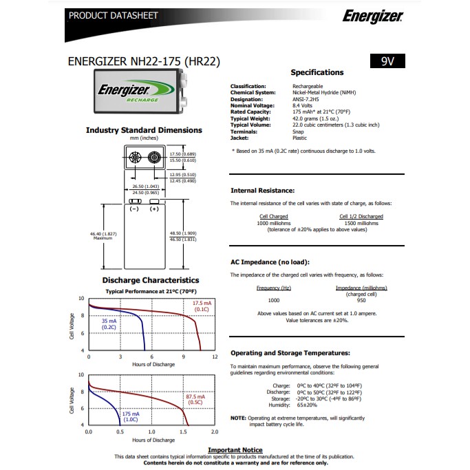 ถ่านรีชาร์จ Recharge 9V Energizer(USA)แท้ มีมอก. (NH22) Pack1 (มียี่ห้อSpaแทนค่ะ)