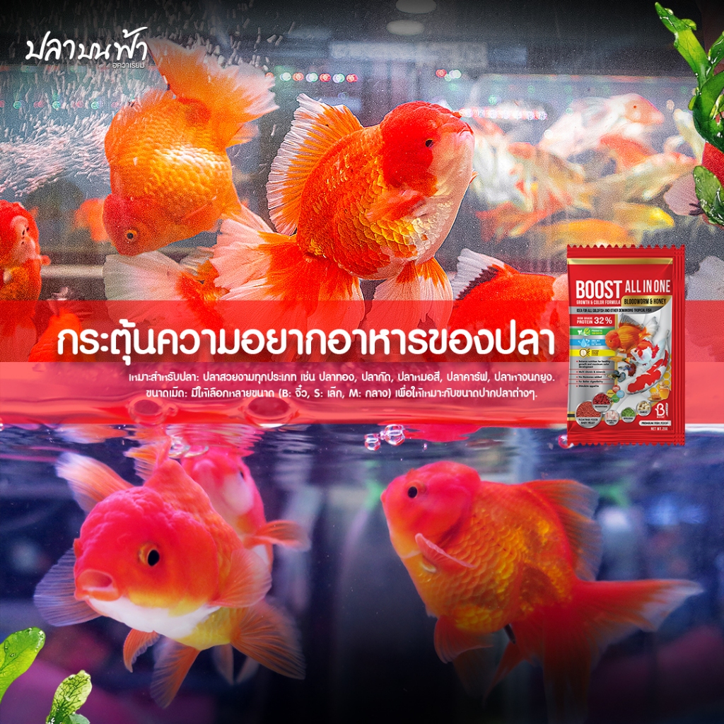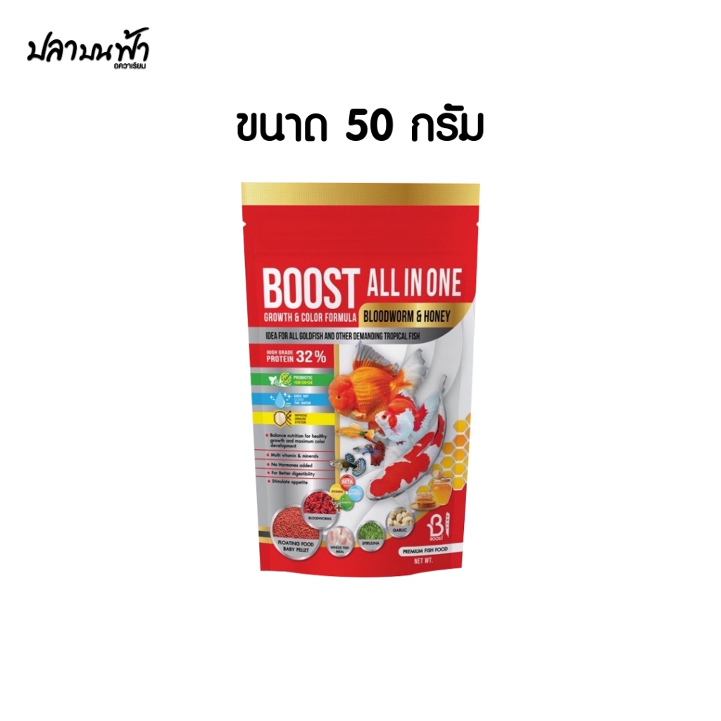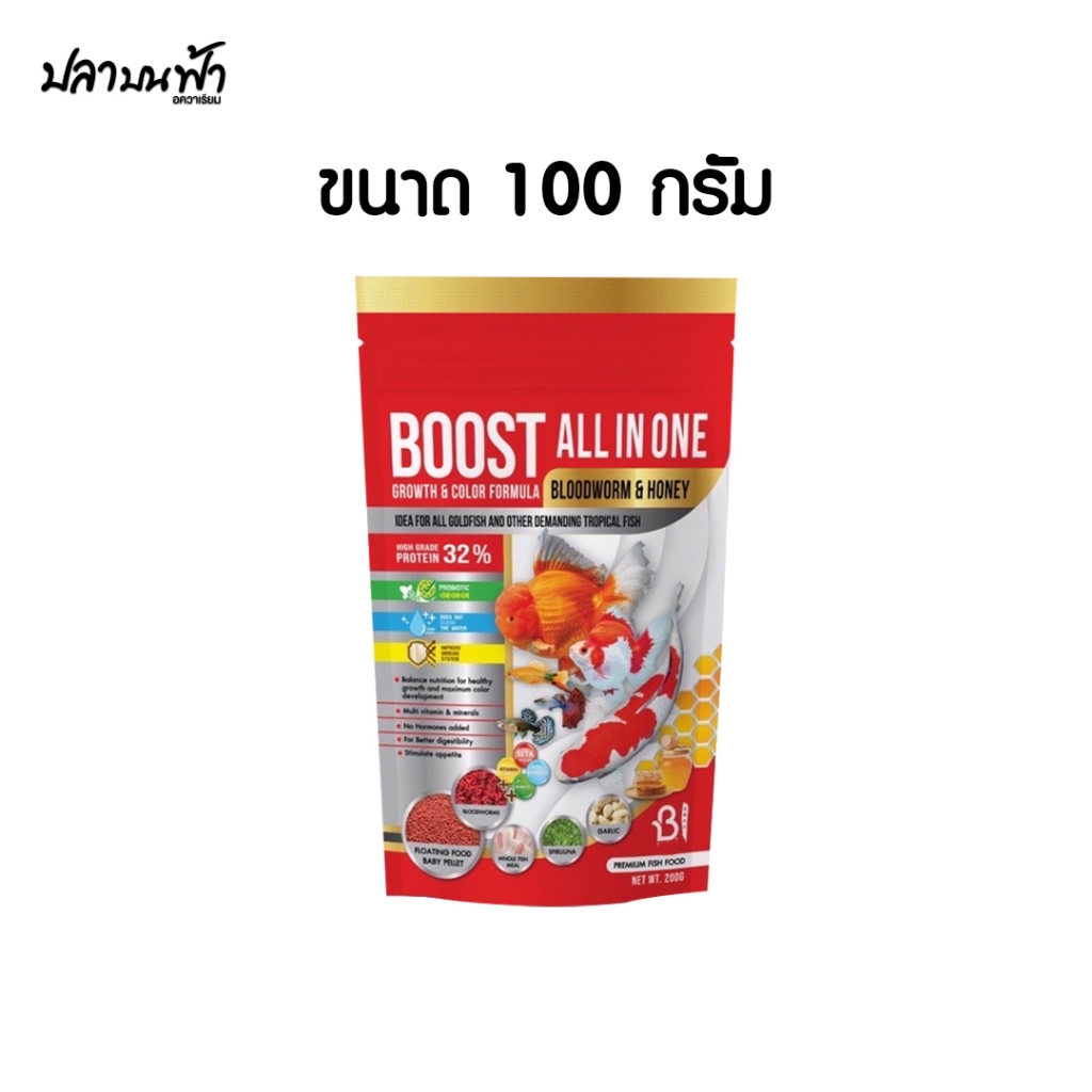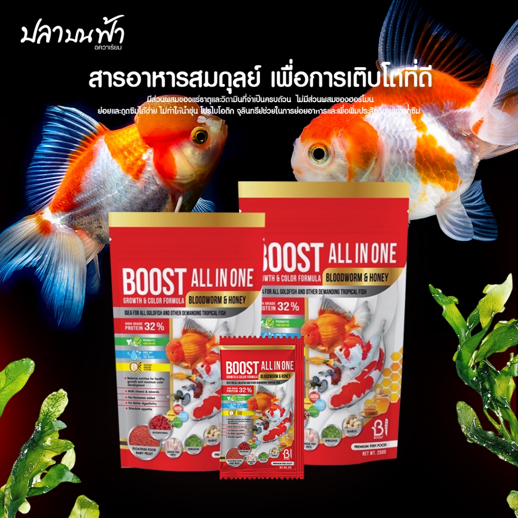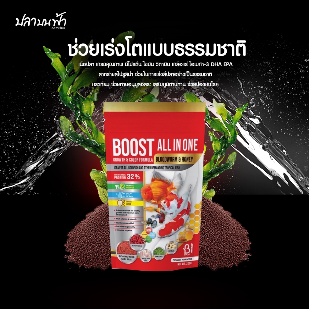 อาหารปลา BOOST All In One โปรตีนสูง เร่งสี เร่งโต ด้วยคุณค่าจากหนอนแดง และน้ำผึ้ง ทำให้ปลามีสีสันสวยงามตามธรรมชาติ