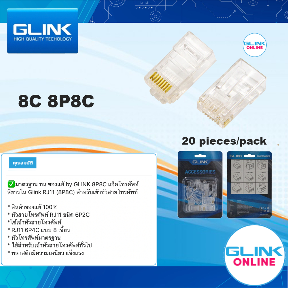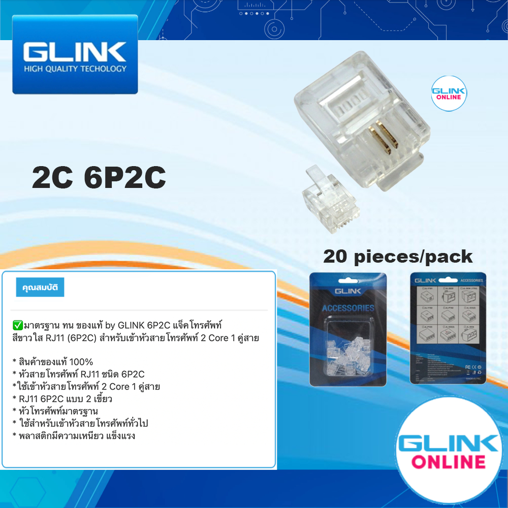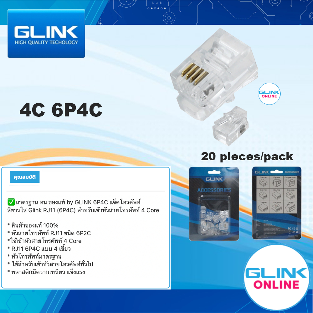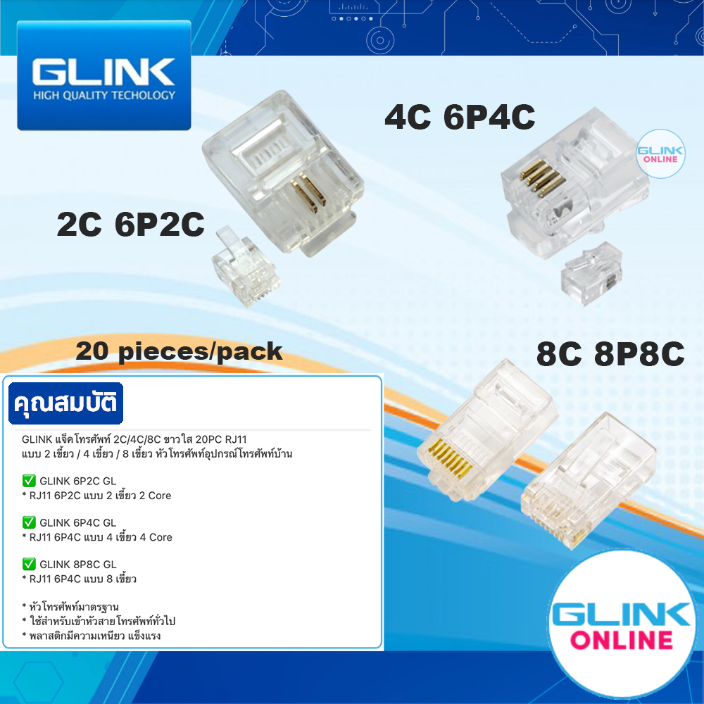 ✅มาตรฐาน GLINK หัว แจ็คโทรศัพท์ 2C / 4C / 8C ขาวใส 20PC หัว RJ11 แบบ 2เขี้ยว 4เขี้ยว 8เขี้ยว หัวแจ็ค อุปกรณ์โทรศัพท์ 111
