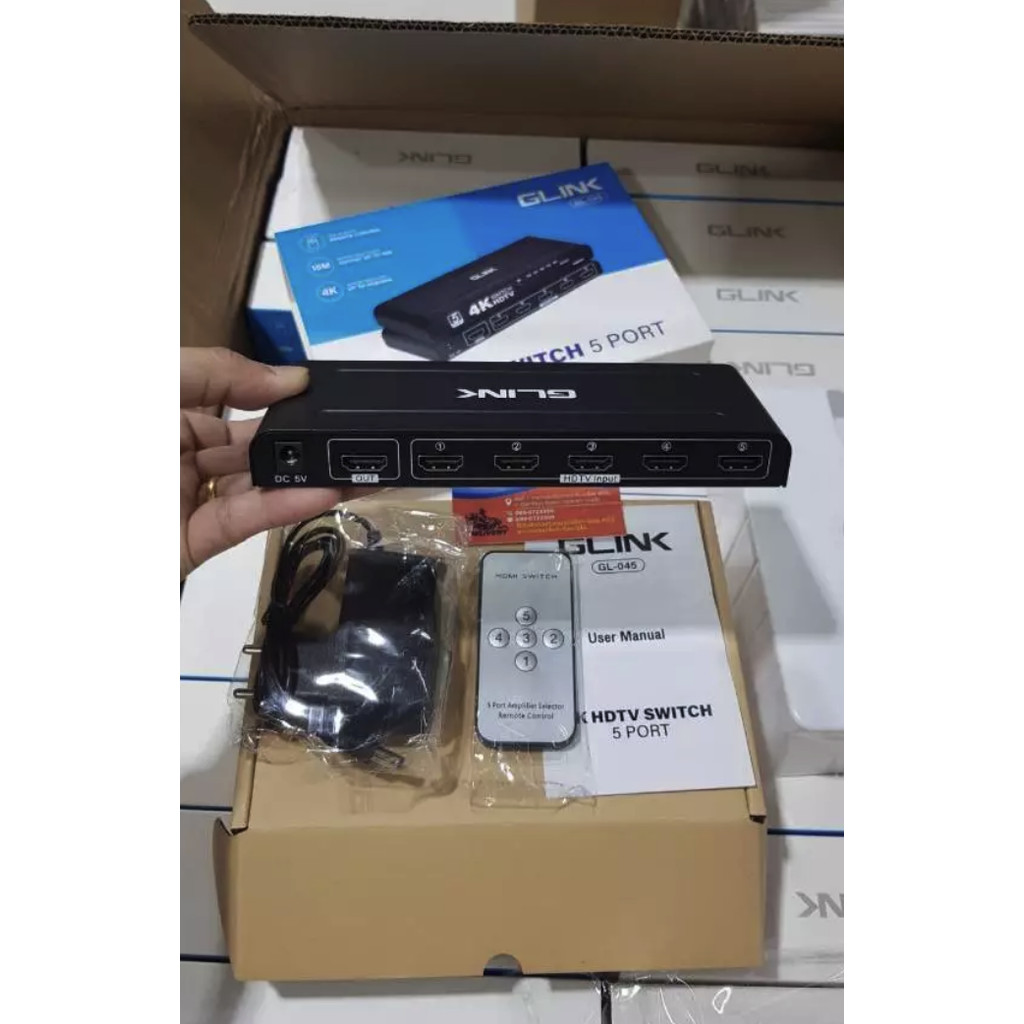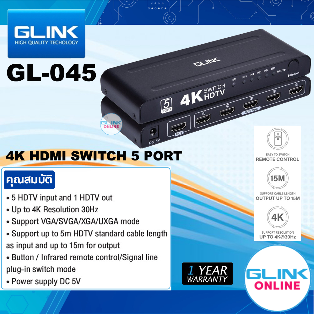 ✅มาตรฐาน GLINK GL-045 4K HDMI SWITCH KVM เข้า5 สลับ ออก1 GL045 รีโมทคอนโทรล ตัวสลับ ตัวแปลง 5 in 1 out HDMI Switcher