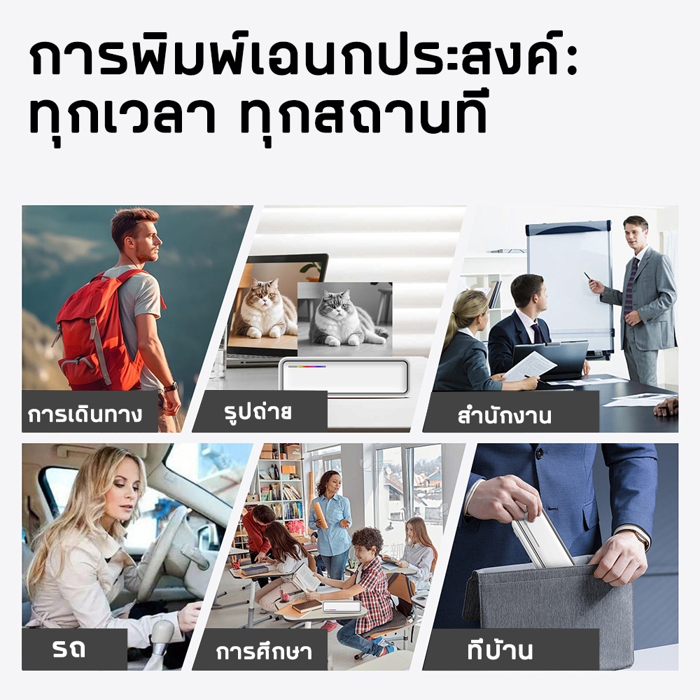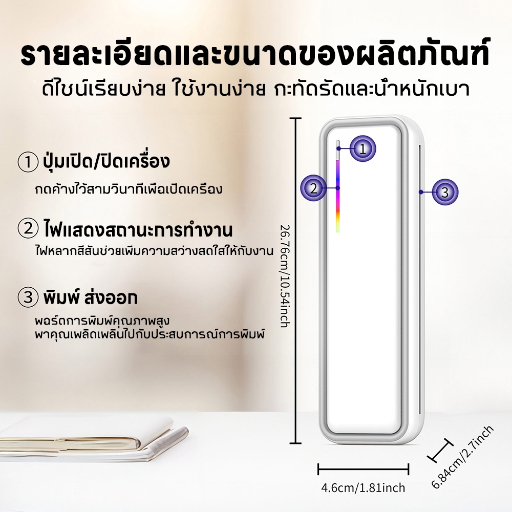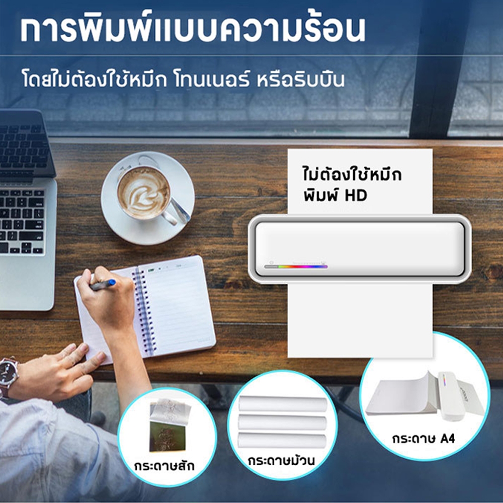 เครื่องปริ้น A4 เครื่องพิมพ์บลูทูธแบบพกพา เครื่องปริ้นพกพาไร้หมึก รองรับกระดาษม้วน/กระดาษสัก/กระดาษมาร์คดำ Phone/PC