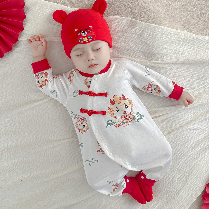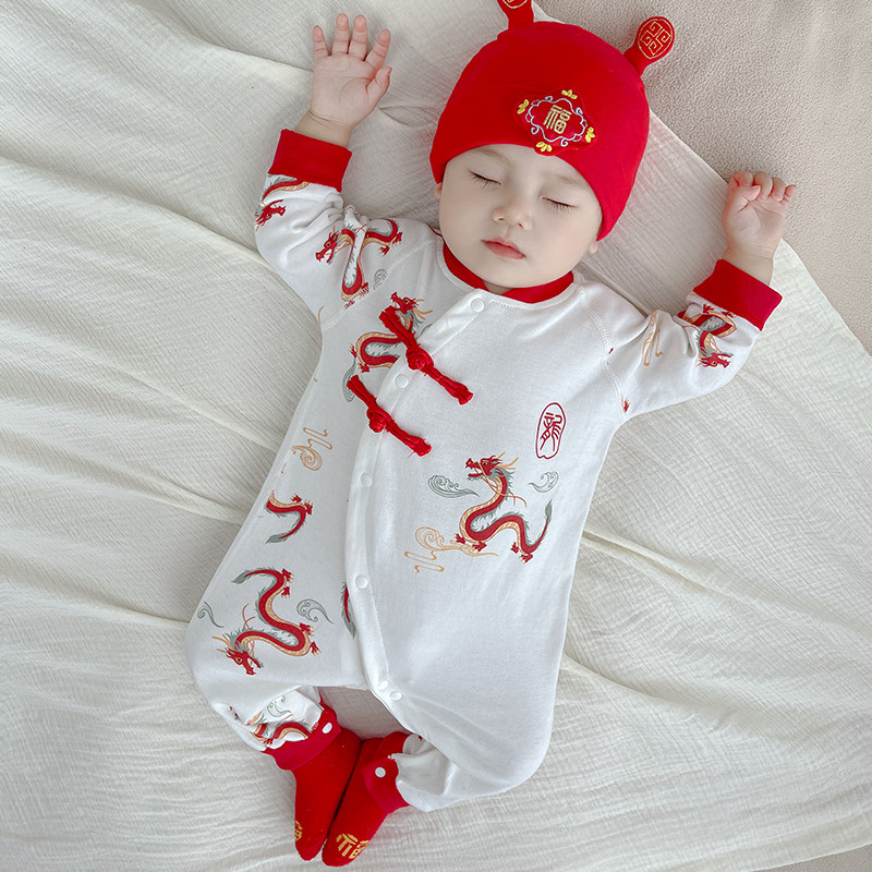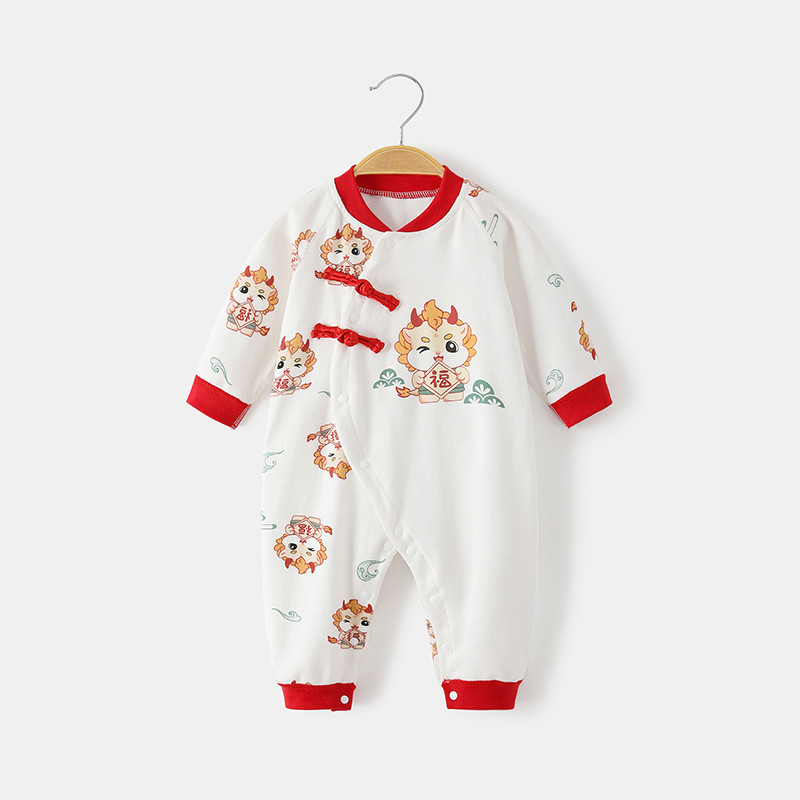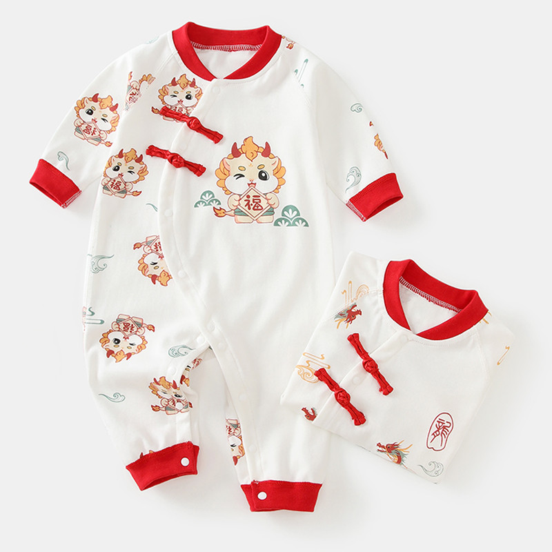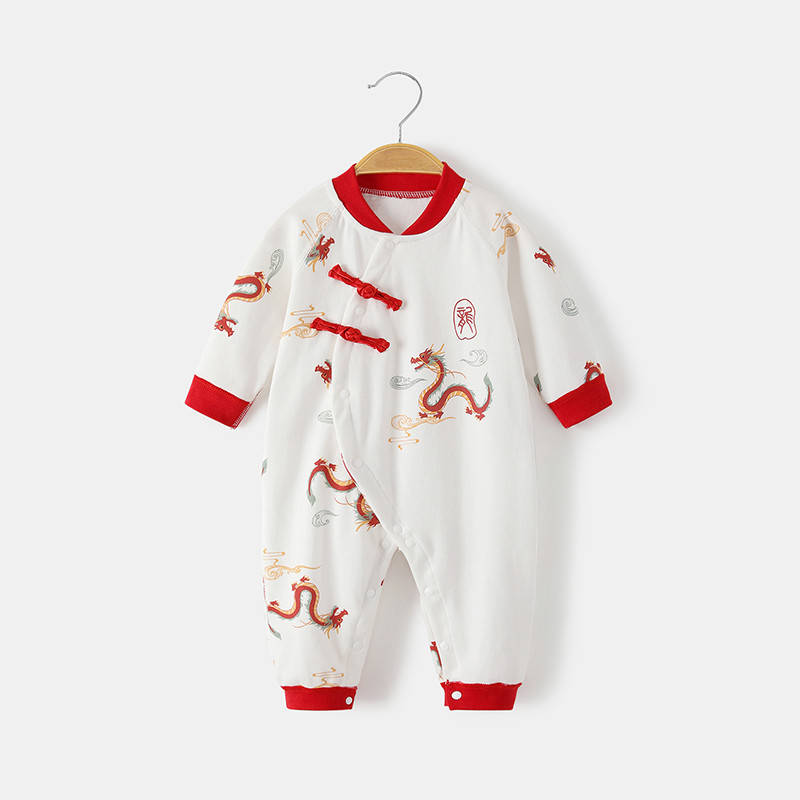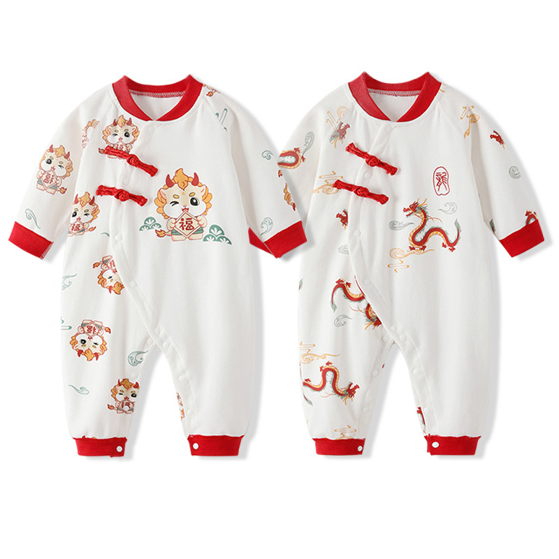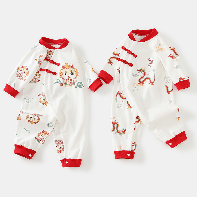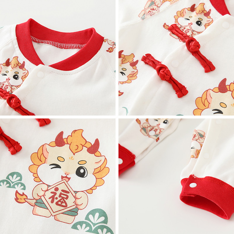 สไตล์เทศกาลฤดูใบไม้ผลิผ้าฝ้าย 100% ชุดจั๊มสูทเด็กเสื้อผ้าเด็กสีแดงวันหยุดเสื้อผ้าสไตล์จีนมังกร