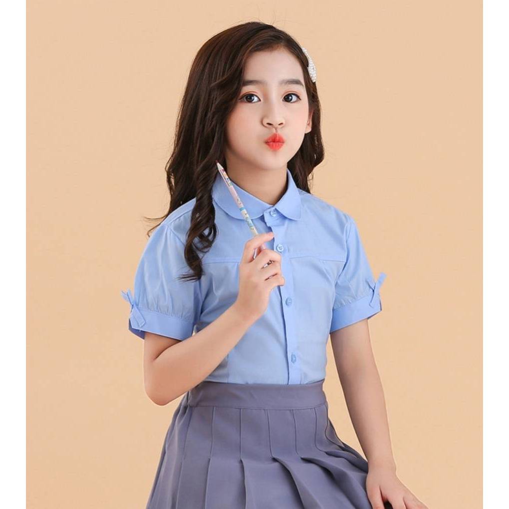 M0171 เสื้อเชิ้ตเด็กหญิงแขนสั้น เสื้อเชิ้ตเด็กหญิงคอบัว เชิ้ตเด็กหญิงสีขาว แต่งลูกไม้น่ารัก