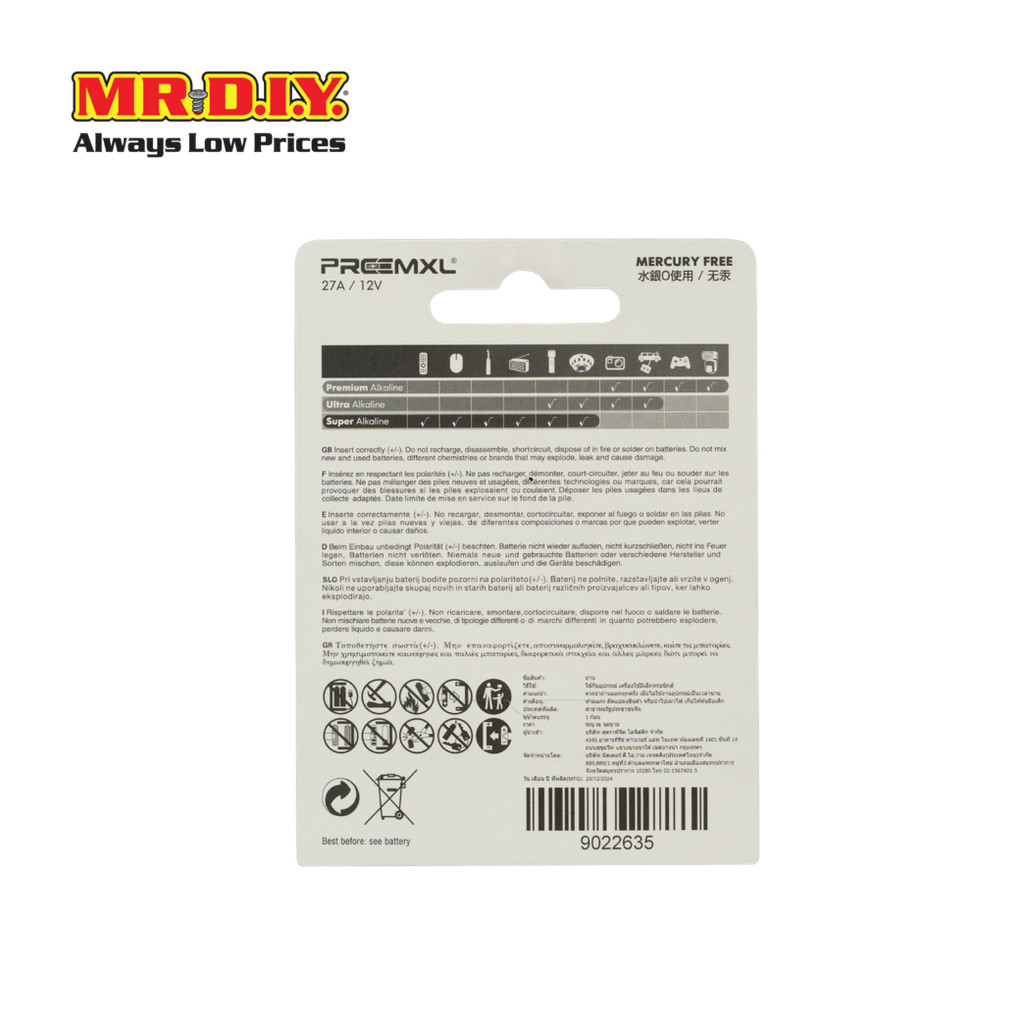 [แพ็ก 2 แผง] PREMXL ถ่าน Super Alkaline 27A 12V จำนวน 1 ก้อน/แผง