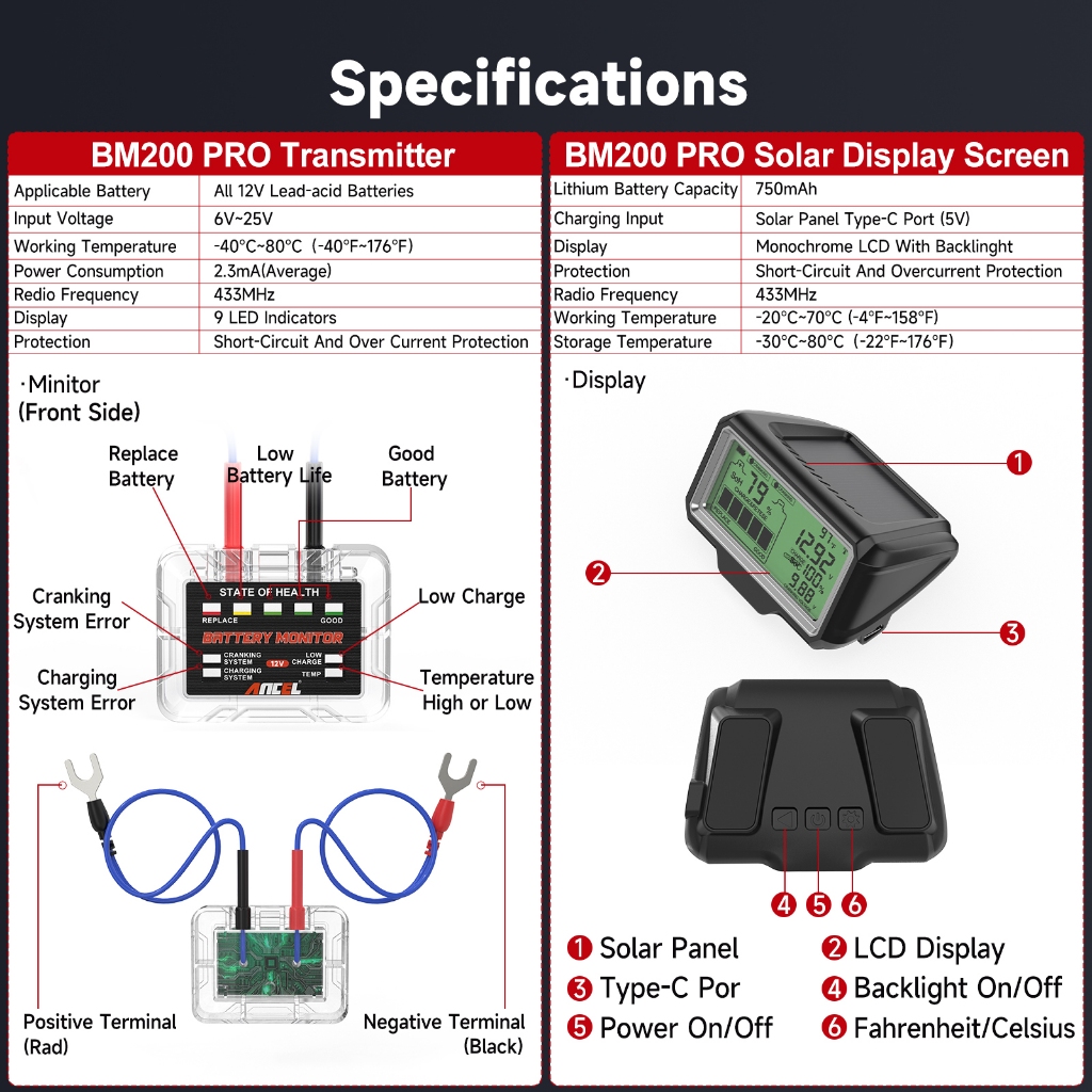 ANCEL BM200 PRO เครื่องทดสอบแบตเตอรี่ 12V เครื่องวิเคราะห์สุขภาพแบตเตอรี่ soc soh พร้อมหน้าจอ HUD สำหรับรถยนต์ มอเตอร์ไซค์