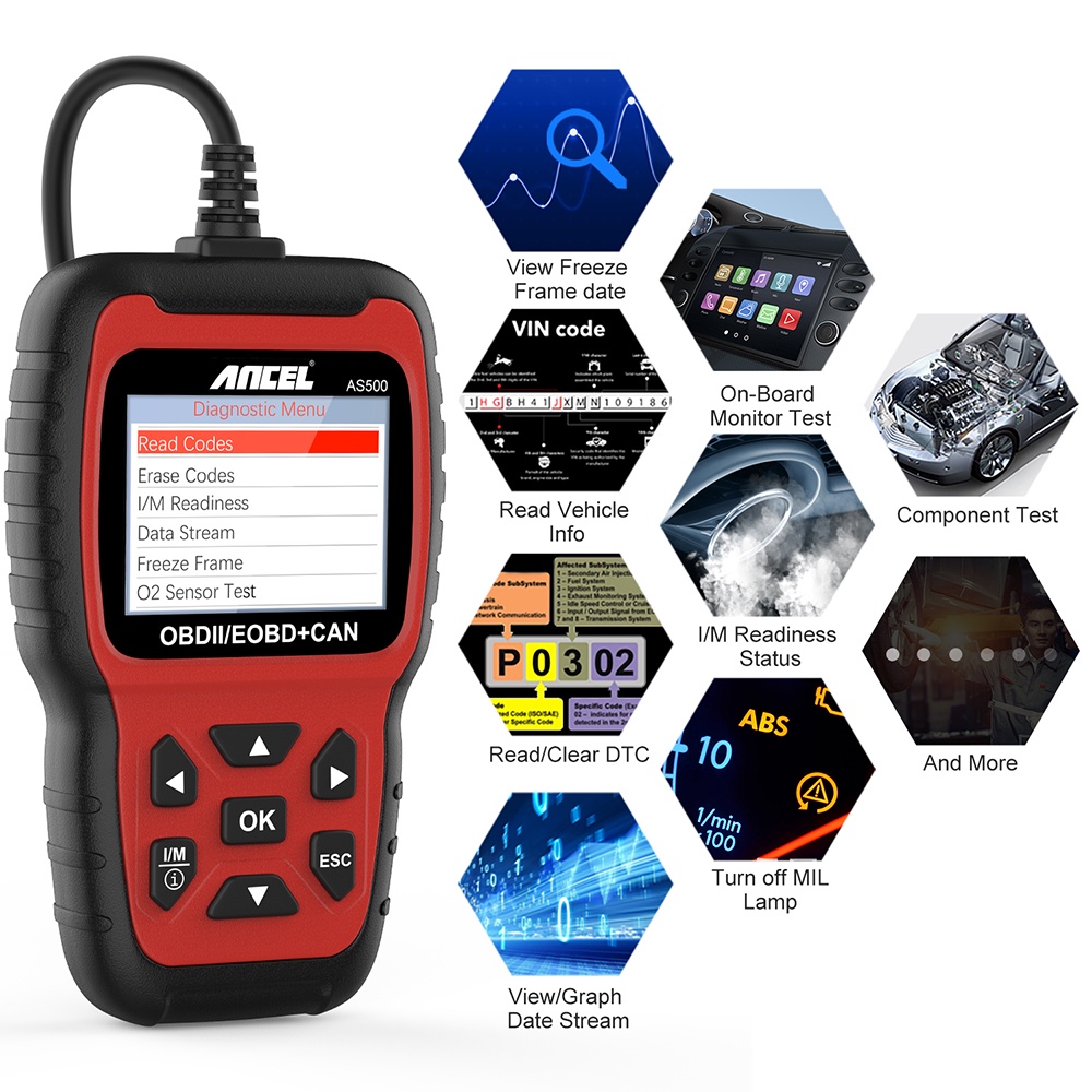 Ancel AS500 OBD2 Scanner เครื่องมือวินิจฉัยรถยนต์ เครื่องอ่านโค้ดรถยนต์ เช็คเครื่องยนต์ ลบโค้ดผิด ทดสอบแบตเตอรี่