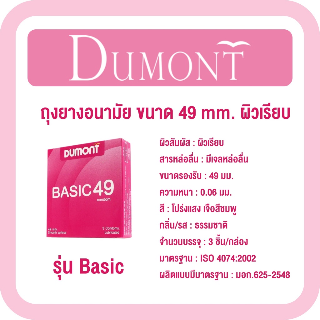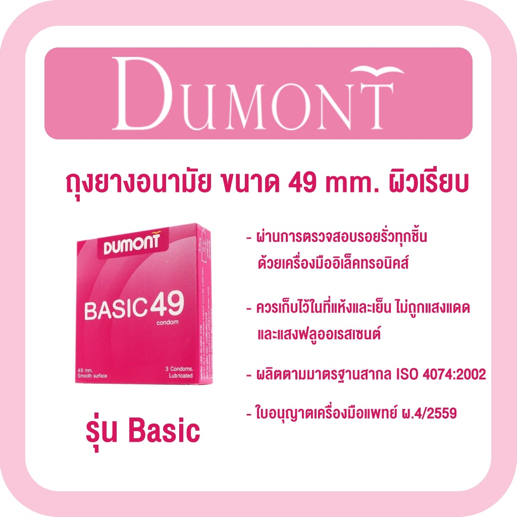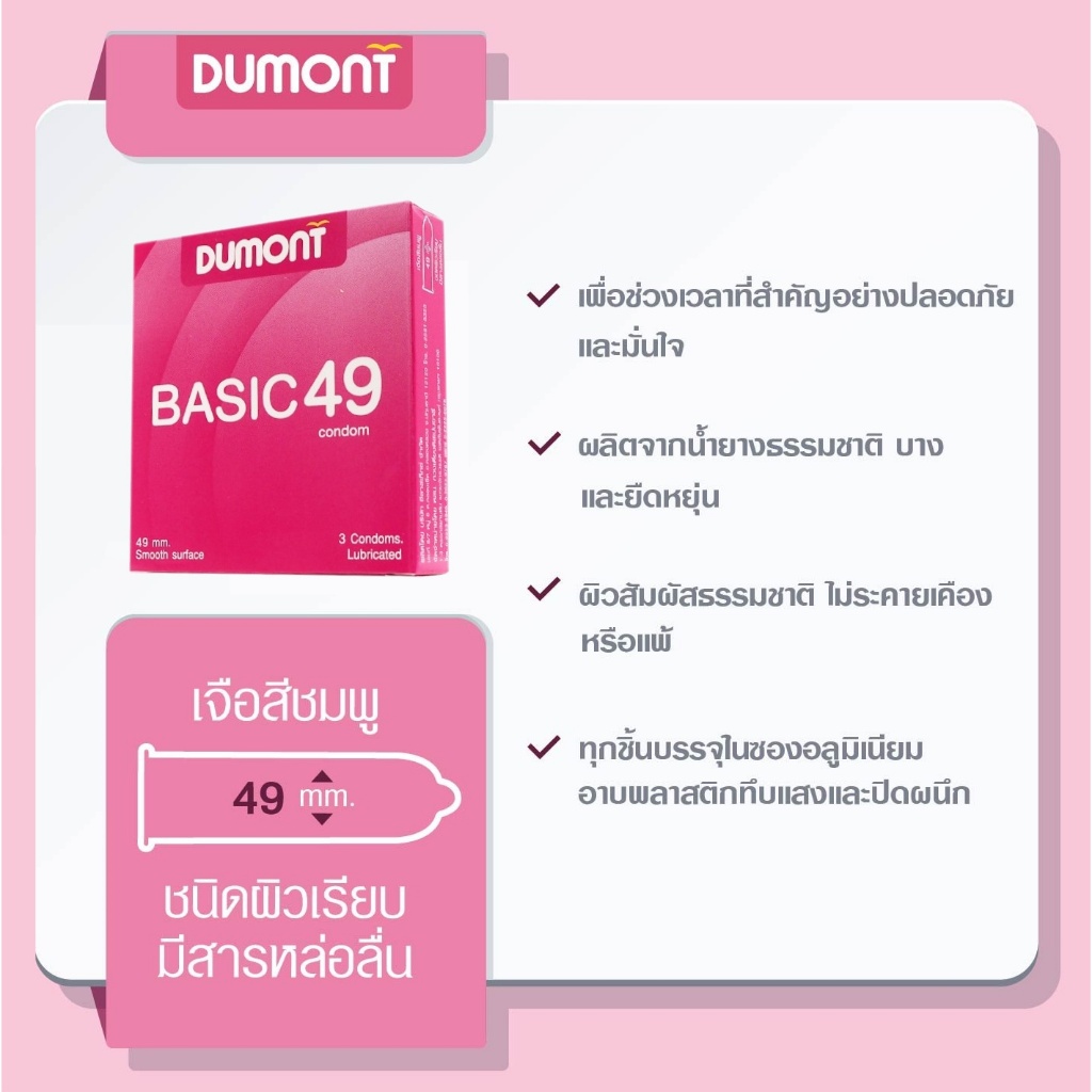 Dumont ดูมองต์ ถุงยางอนามัย ขนาด 49 mm. ผิวเรียบ [รุ่น Basic] [3 ชิ้น] [1 กล่อง] ถุงยาง 49 ดูมองต์เบสิค