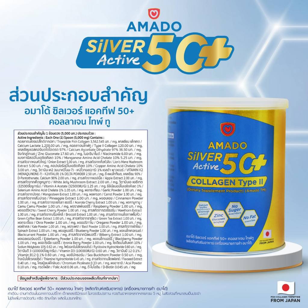 Amado Silver Active 50+ Collagen Type II อมาโด้ ซิลเวอร์ แอคทีฟ 50+ คอลลาเจน ไทพ์ ทู [100 g.] [1 กระปุก] แคลเซียม กระดูก