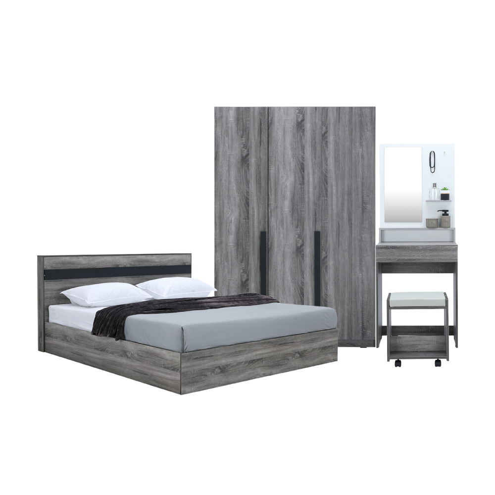 HomeHuk ชุดห้องนอน รุ่นมินิโอ (เตียง, ตู้เสื้อผ้า 3 บาน, โต๊ะเครื่องแป้งพร้อมสตูล)