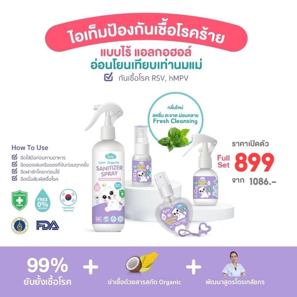 (กันโควิด, RSV, ไข้หวัดใหญ่) เซทคุ้มครบ Lynn Organic Non- Alcohol Sanitizer อ่อนโยนเทียบเท่านมแม่