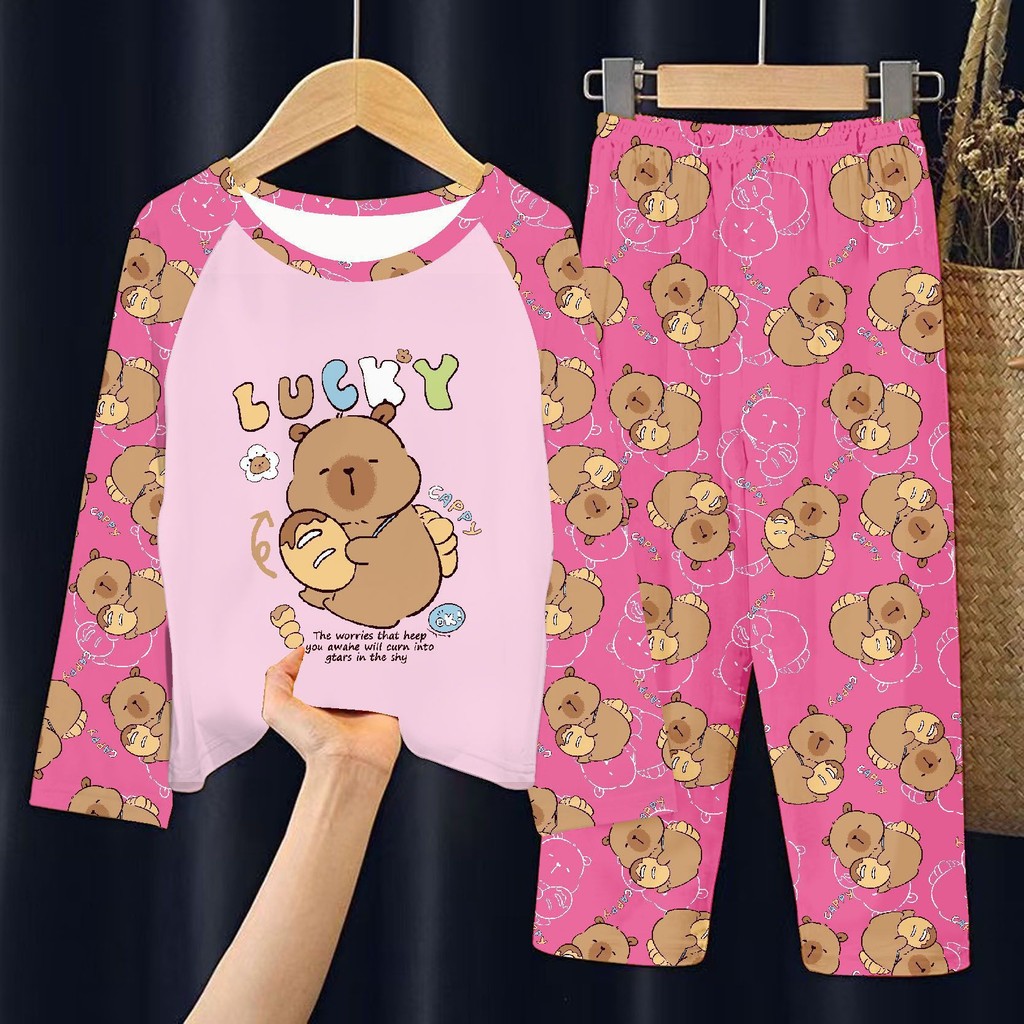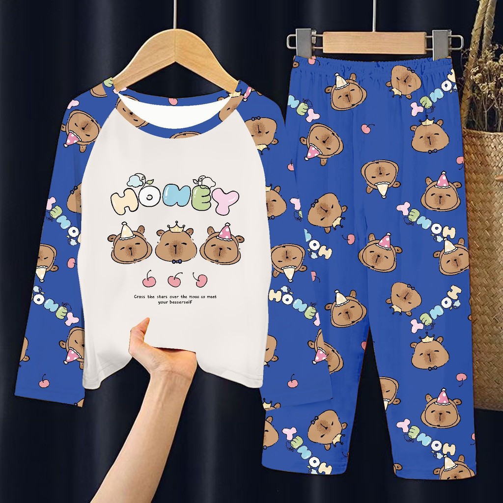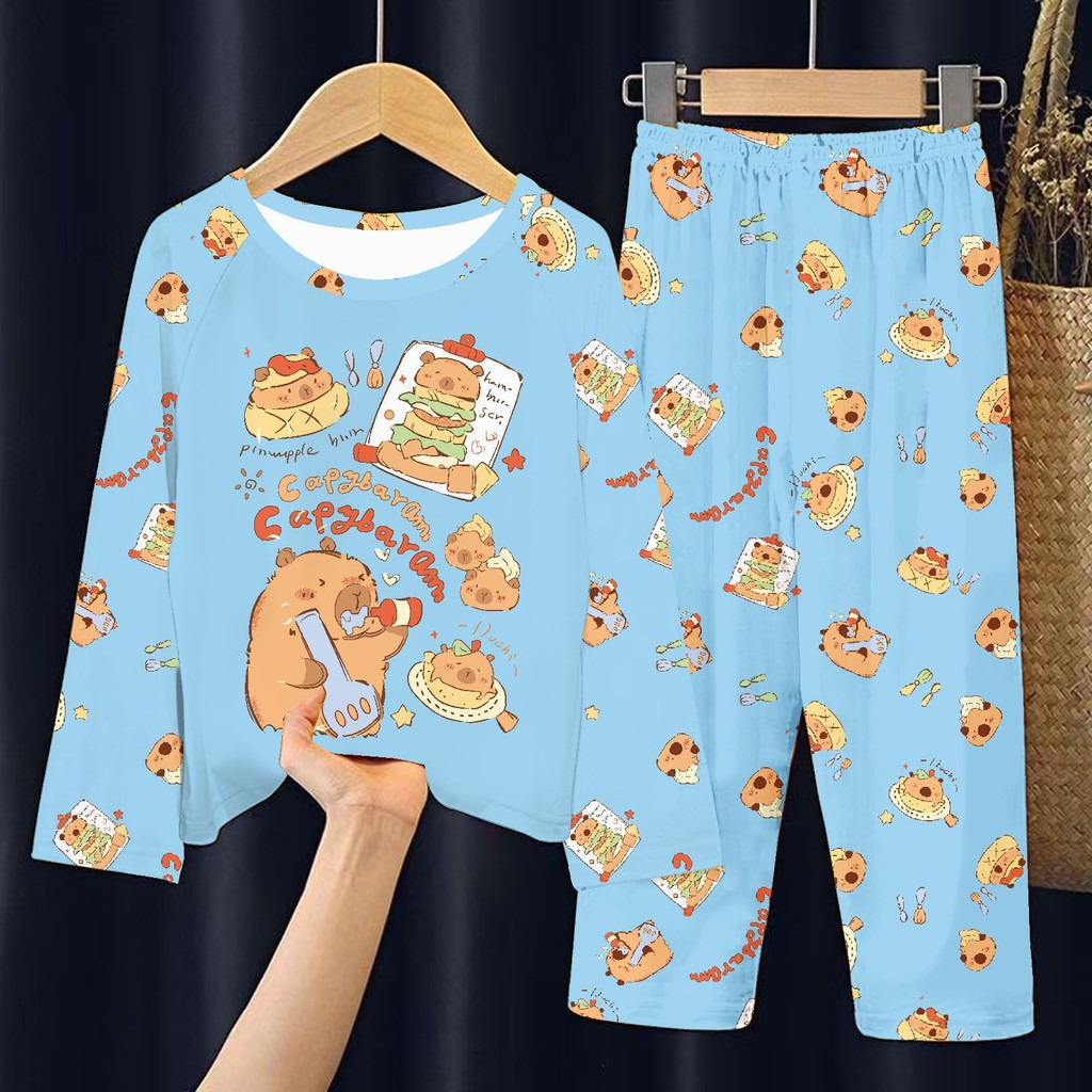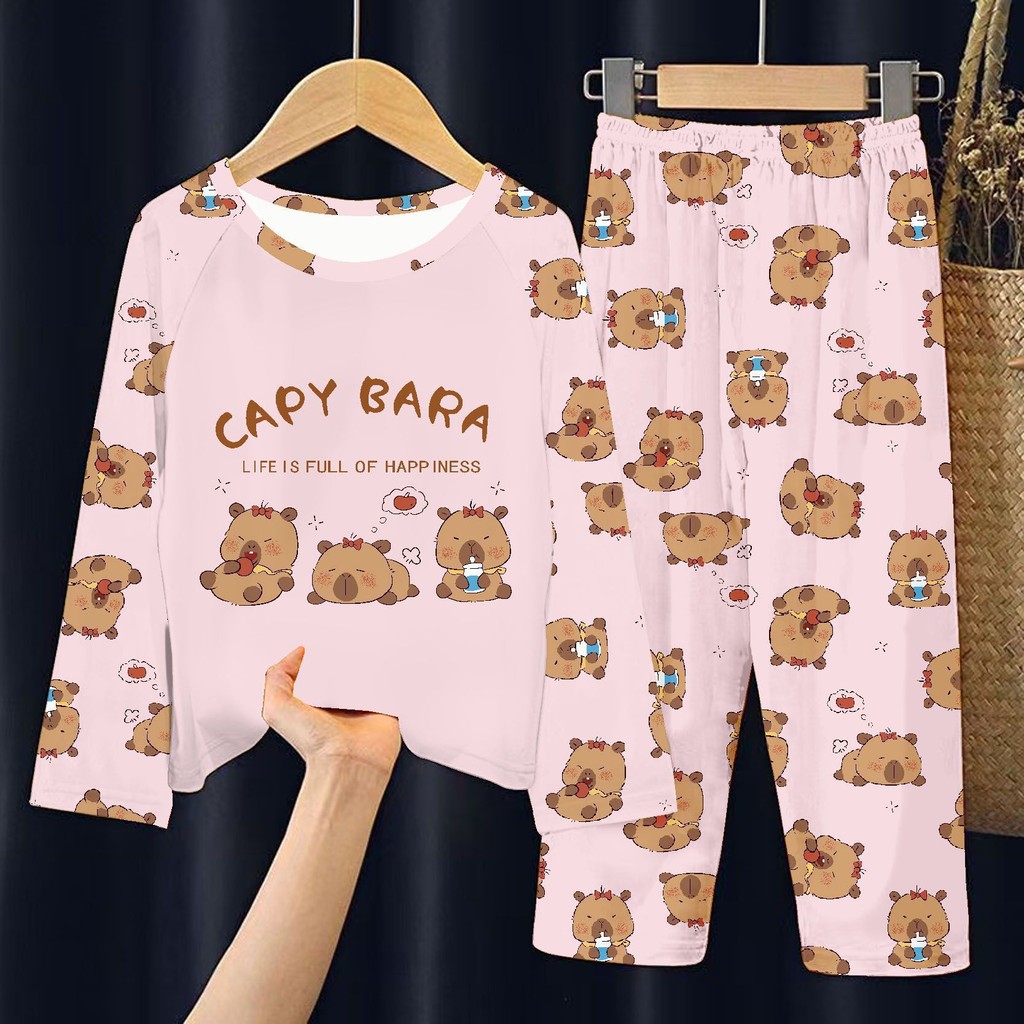 ชุดนอนแขนยาวสำหรับเด็ก การ์ตูนคาปิบาระ ดีไซน์น่ารักสำหรับฤดูร้อน