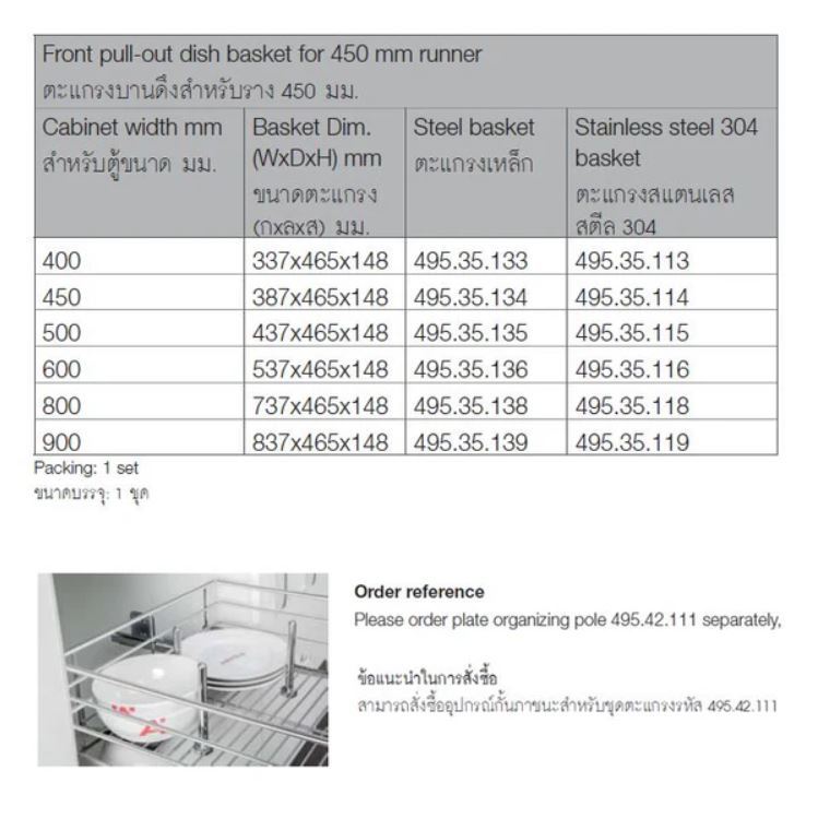 (Hafele) ชุดตะแกรงดึง แบบดึงหน้าบานสำหรับตู้ขนาด 400-900 มม. มี 6 Size