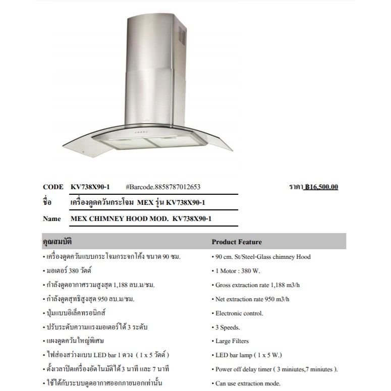 (Mex) เครื่องดูดควันกระโจมกระจกโค้ง ขนาด 90 ซม. รุ่น KV738X90-1