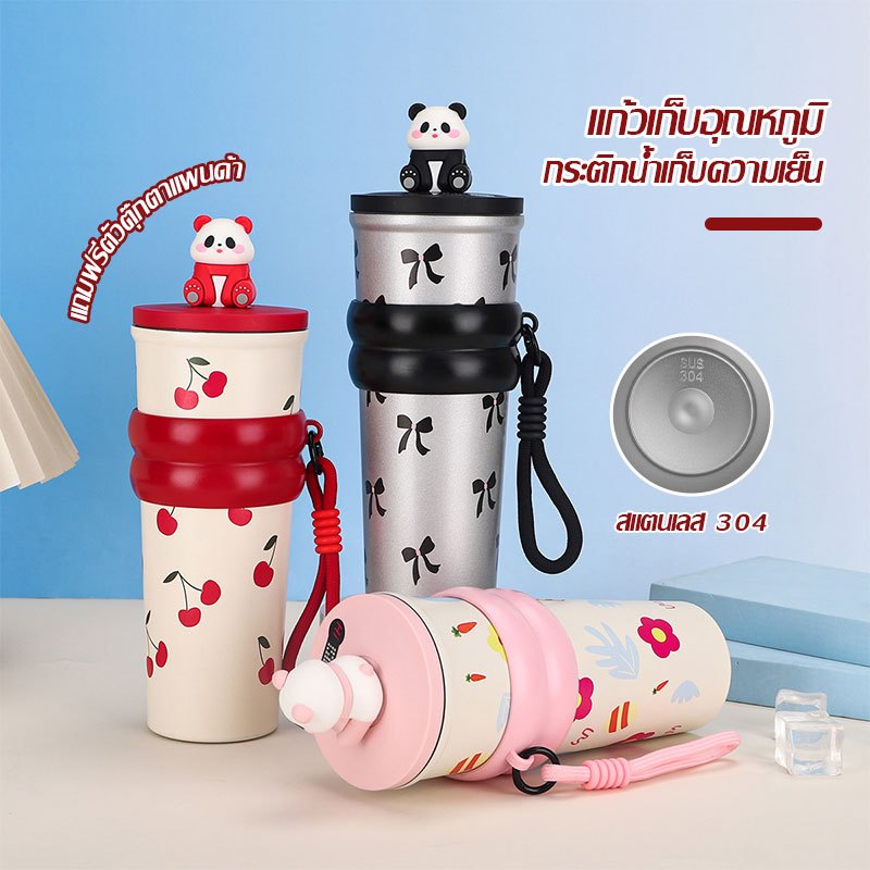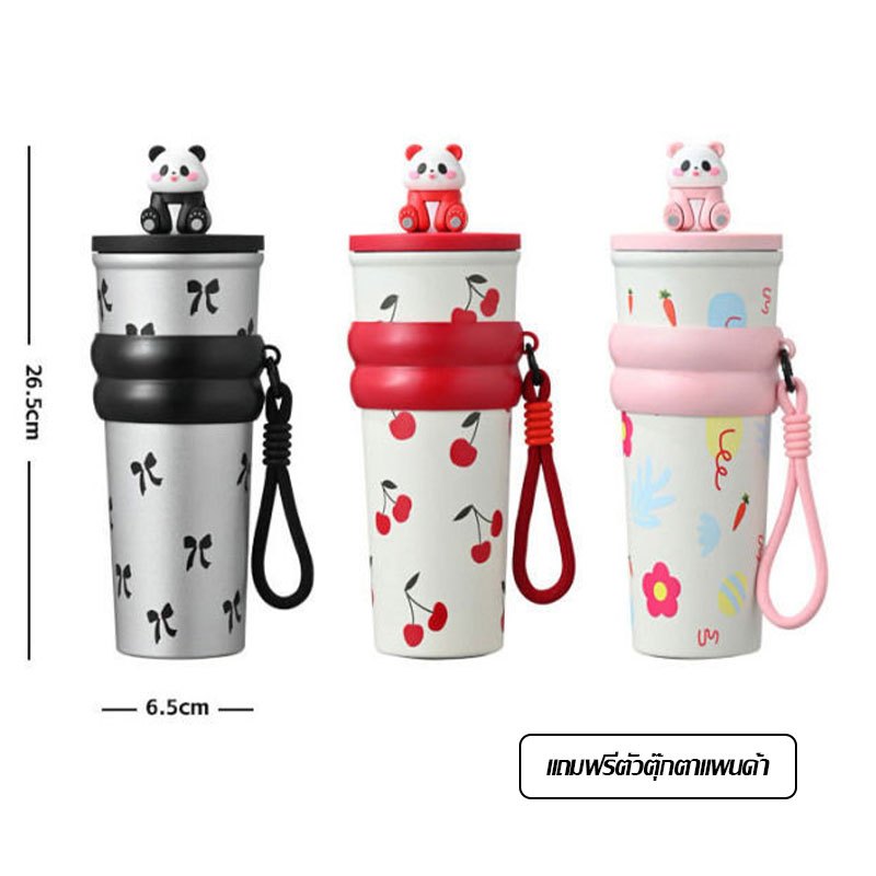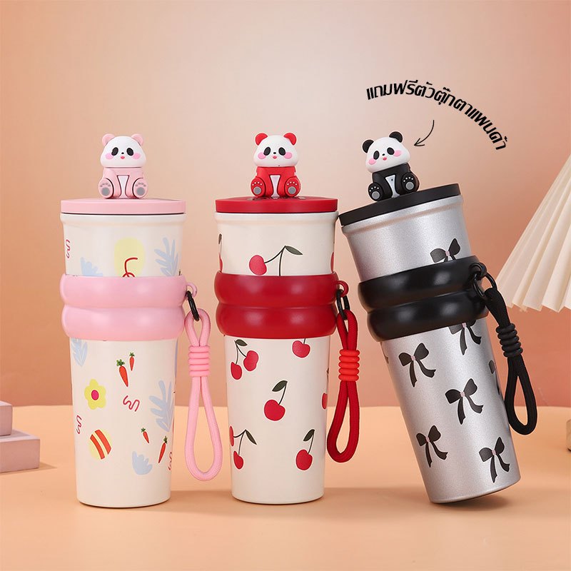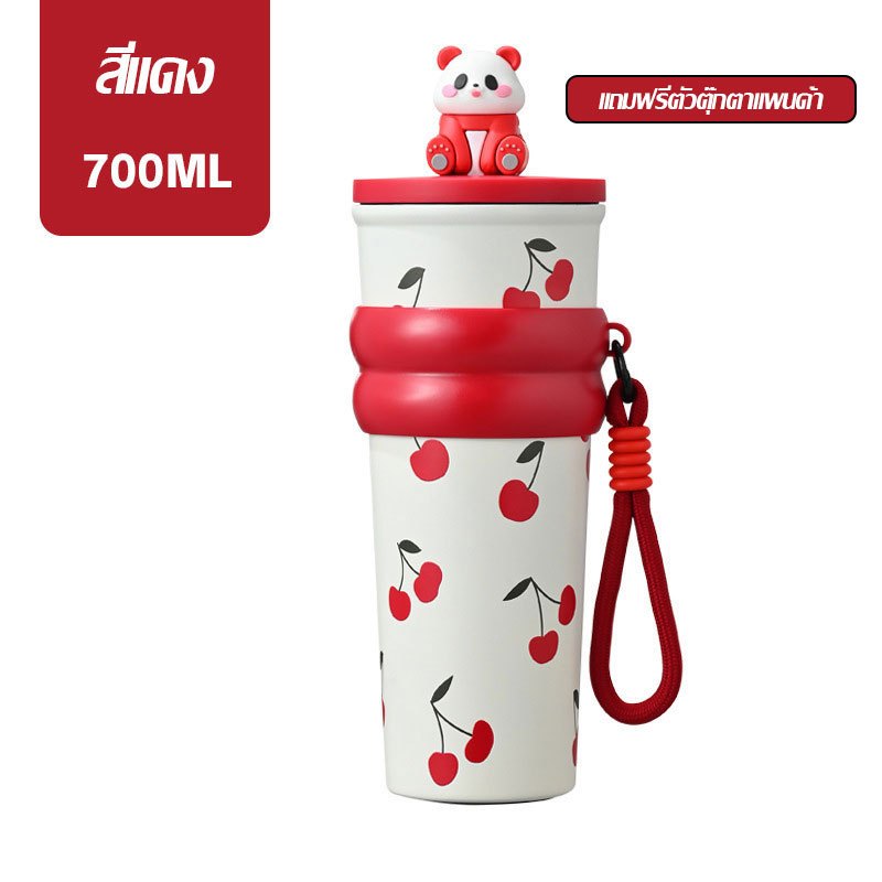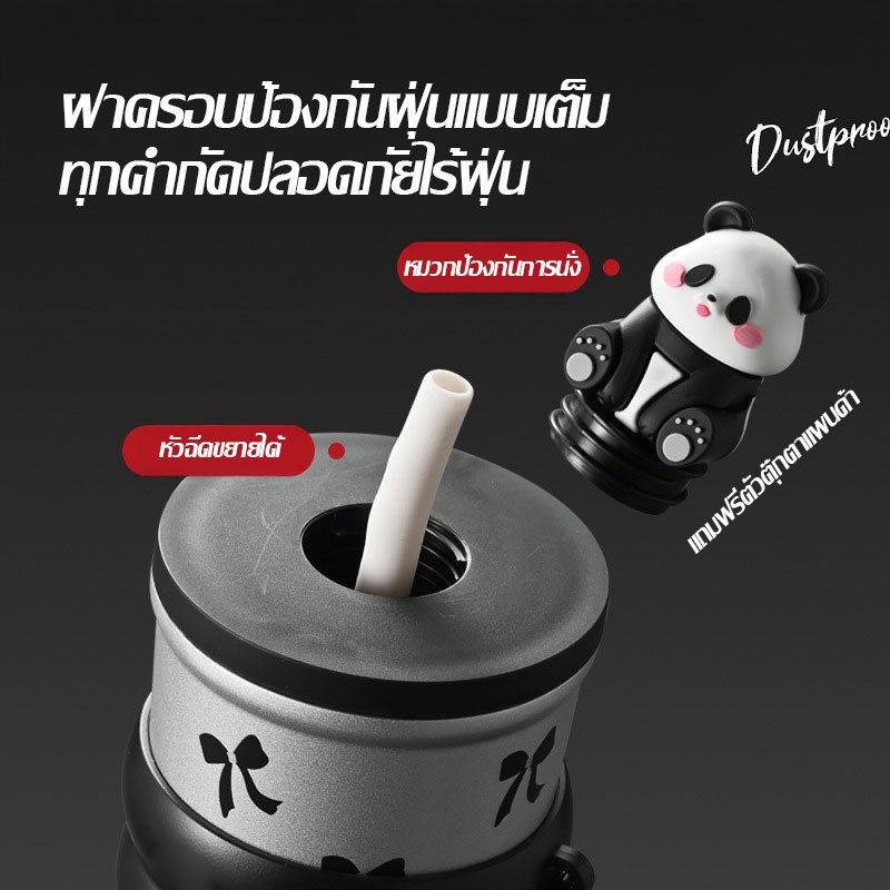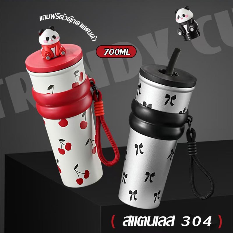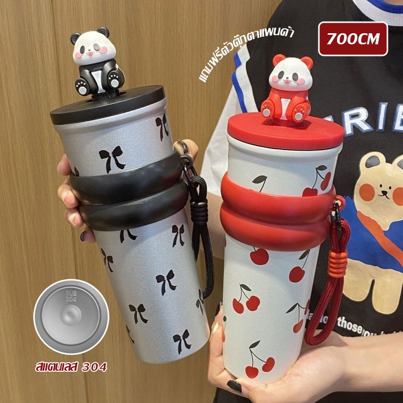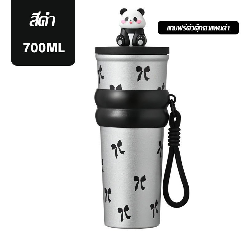การ์ตูน Panda แก้วน้ำสแตนเลส 304 ถ้วยน้ำสำนักงาน มีหลอดดูด พับเก็บได้ เก็บร้อนและเย็น 700ml ถ้วยฉนวนแบบพกพา(1639)