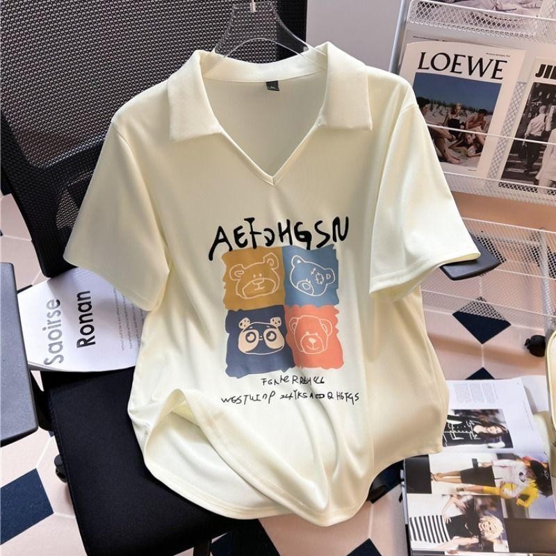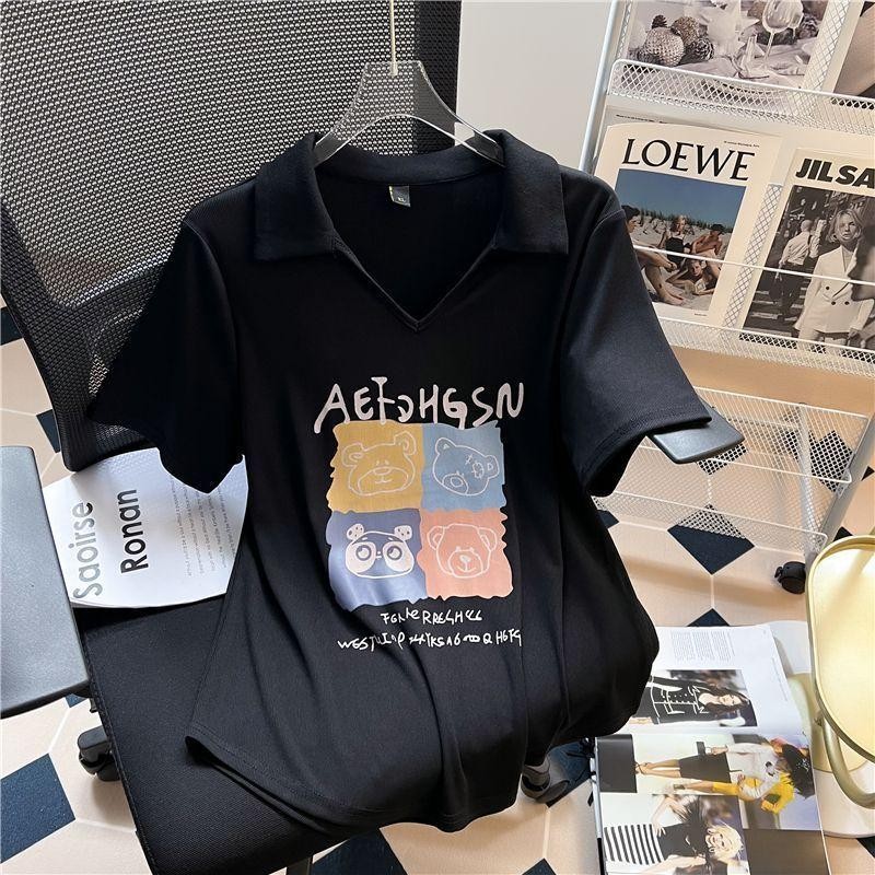 [เสื้อยืด ขนาดใหญ่เกินไป] (40-150กิโลกรัม) ผู้หญิงสลิมฟิตเสื้อโปโลฤดูร้อนพิมพ์เสื้อขนาดบวกเสื้อยืดชุดลําลอง