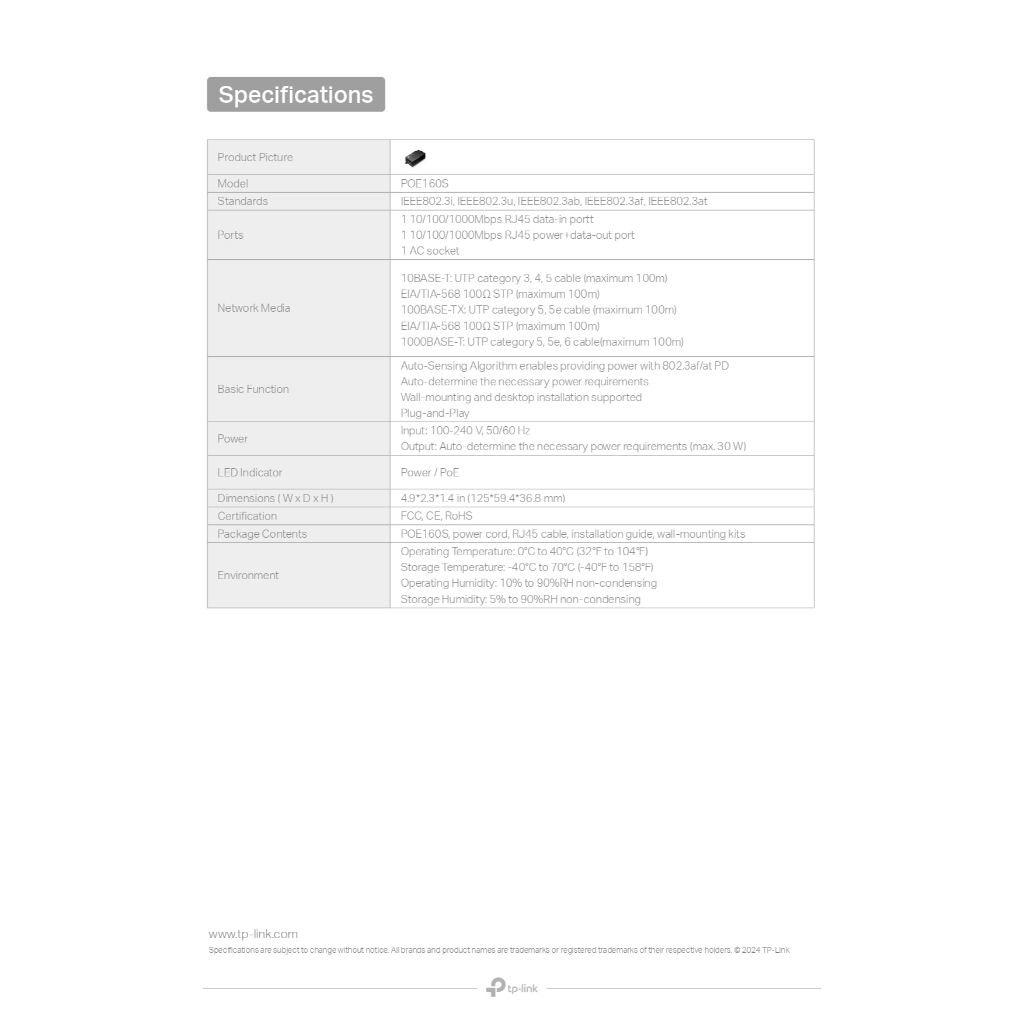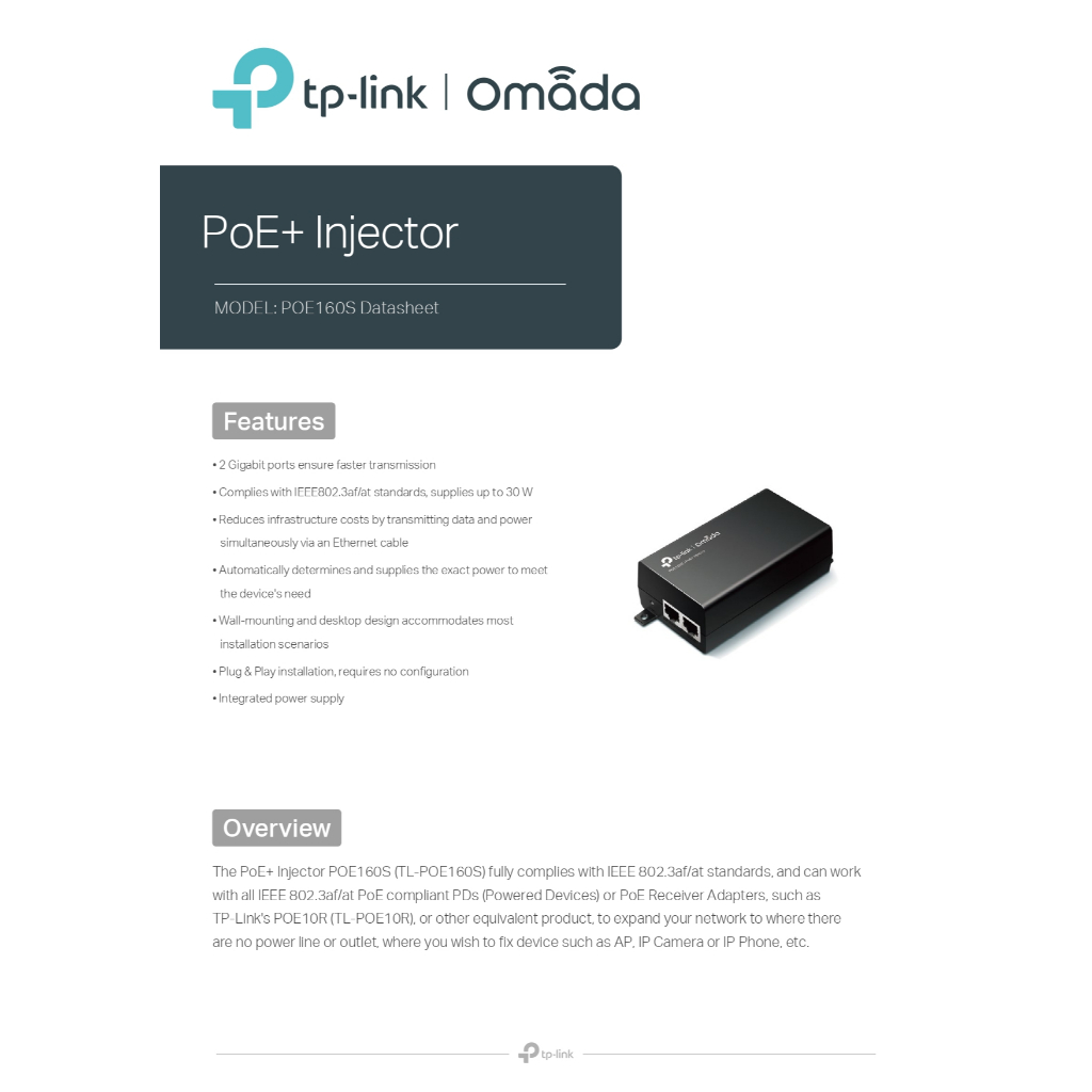 ส่งด่วน TP-LINK POE160S Gigabit PoE+ (TL-POE160S) Injector Power Over Ethernet Adapter 30W 48V