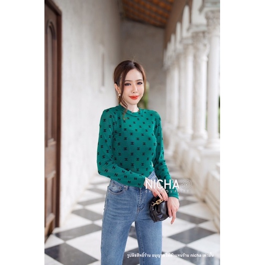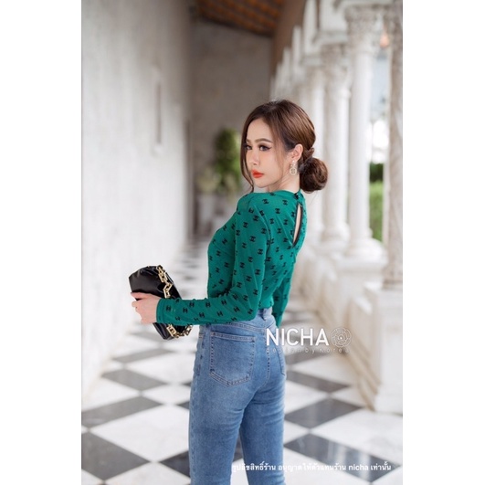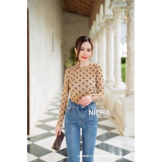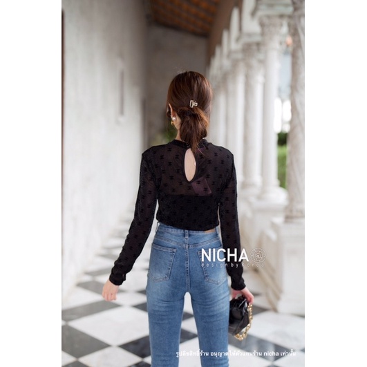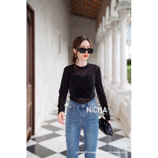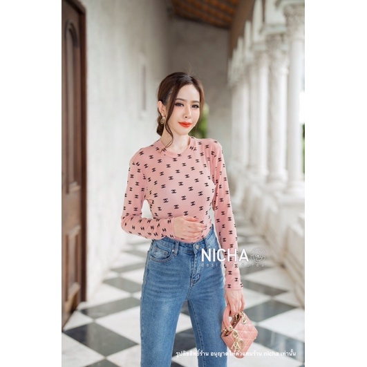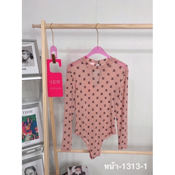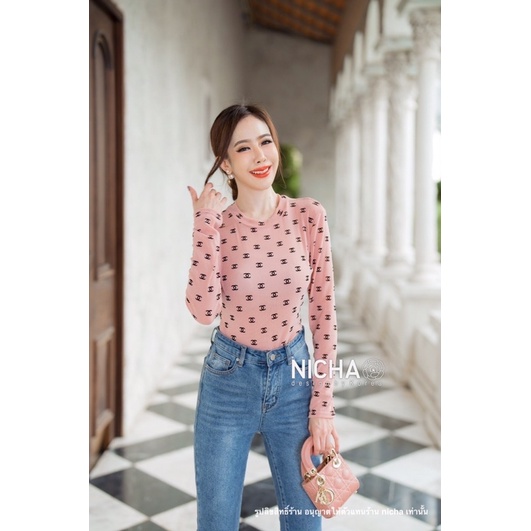 NICHA online🛒 Bodysuit แขนยาวคอเต่าหยดน้ำหลัง ผ้าซีทรู มีกริตเตอร์ สวยแพงพิมพ์ด้วยผ้ากัมมะหยีCHANEL สวยหรู