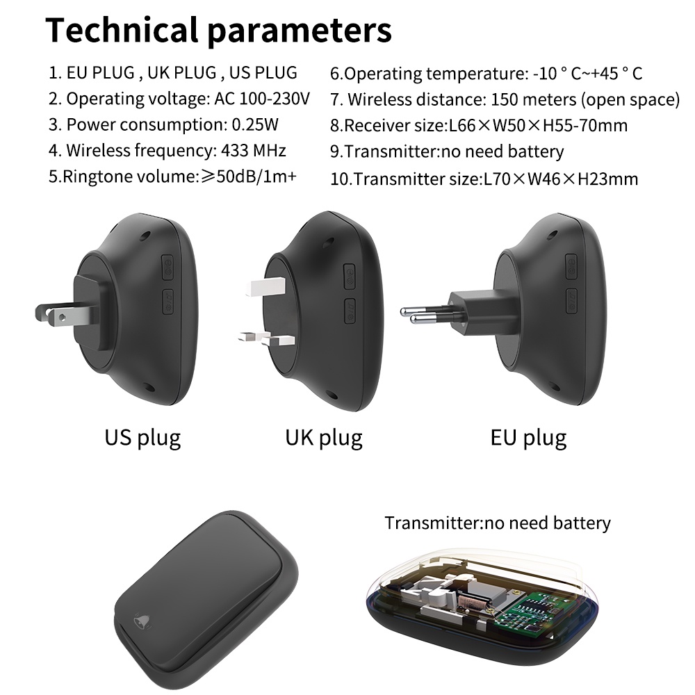 กริ่งไร้สายกันน้ำไม่ใช้ถ่าน ผลังงานจากแรงกด สัญญานไกล Self-Powered Wireless Doorbell US plug