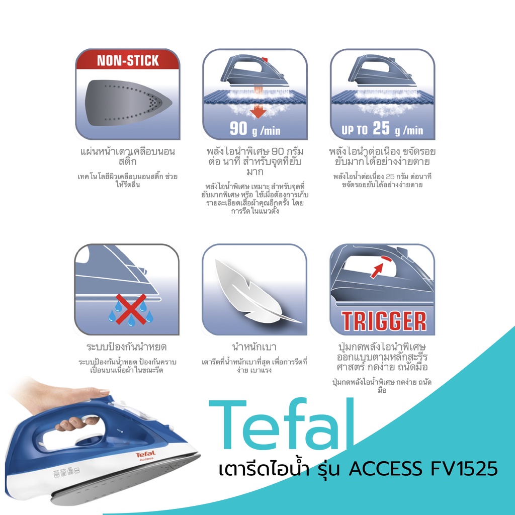 TEFAL เตารีดไอน้ำ รุ่น FV1525 หน้าเตารีดเคลือบ Non-Stick 2,000 วัตต์ (รับประกัน 2 ปี)