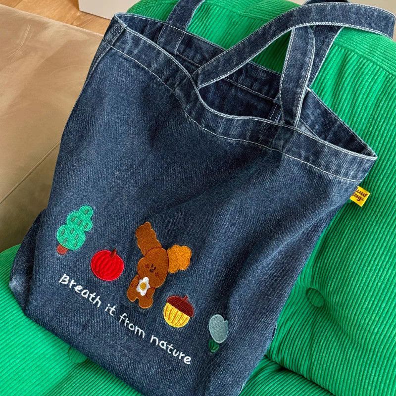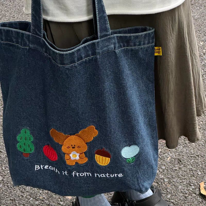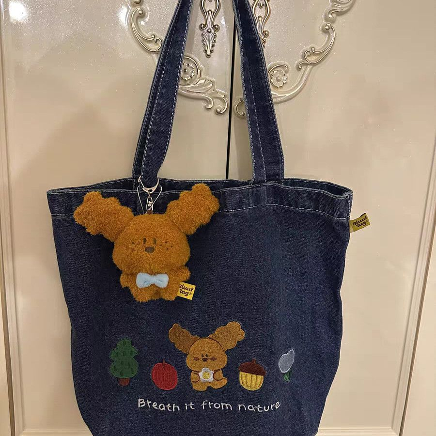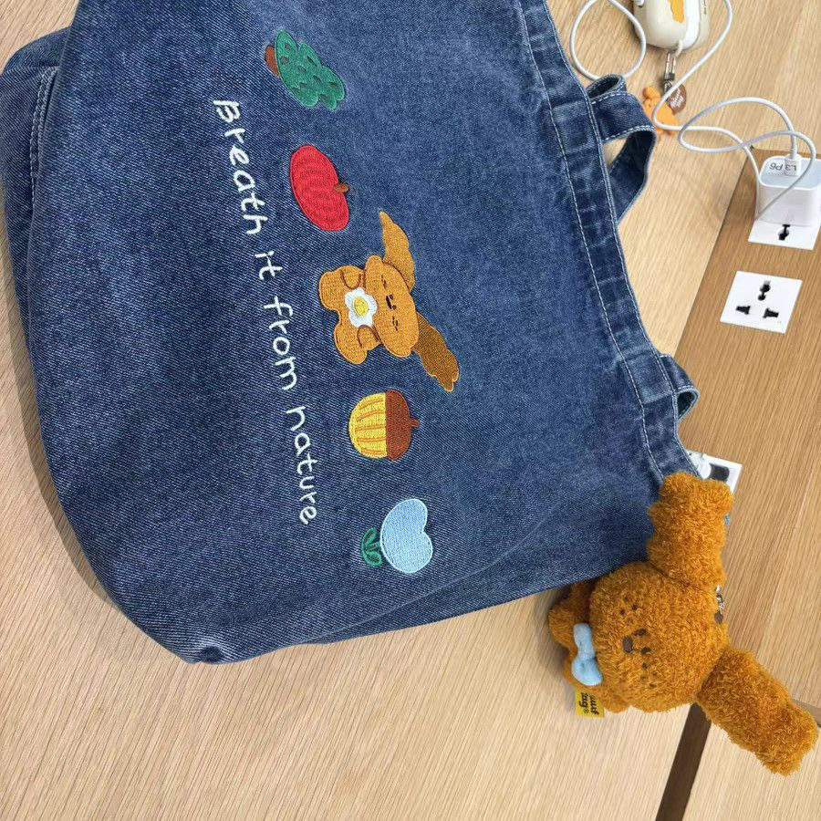 เวอร์ชั่นเกาหลีที่เรียบง่ายและน่ารักลูกสุนัขเย็บปักถักร้อยกระเป๋าผ้าใบยีนส์ย้อนยุคแฟชั่นผู้หญิงนักเรียนสไตล์ลําลองทุกวันสื่อสารความจุขนาดใ