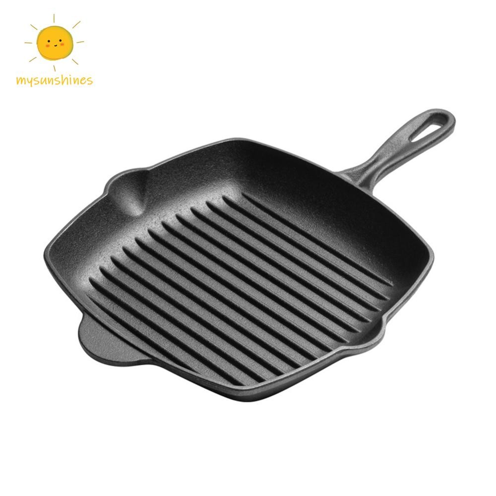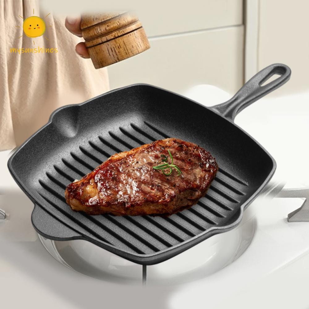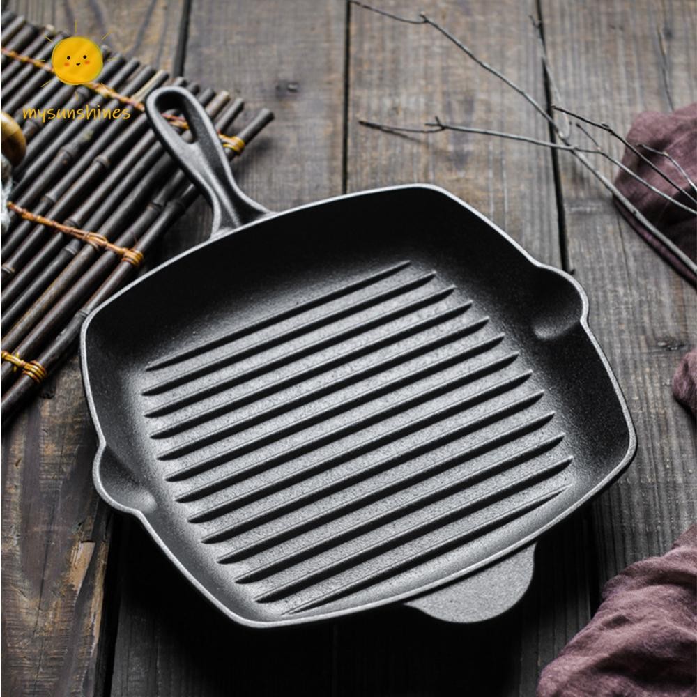 ☀MS กระทะเหล็กหล่อไม่เคลือบครัวเรือนกระทะสเต็กสี่เหลี่ยมห นา-ด้านล่างสเต็ก Skillet กลางแจ้งบาร์บีคิวแพนเค้ก Saucepan