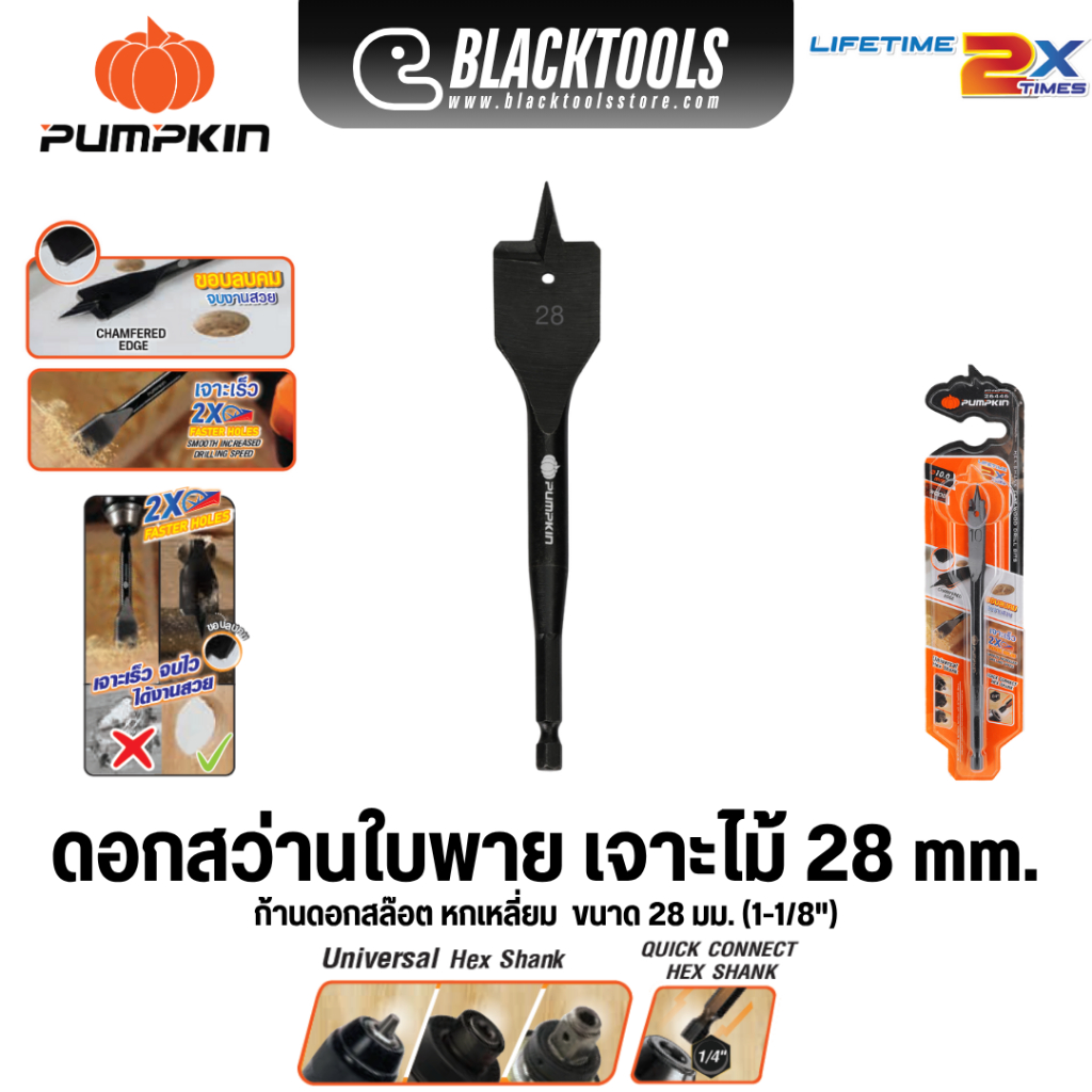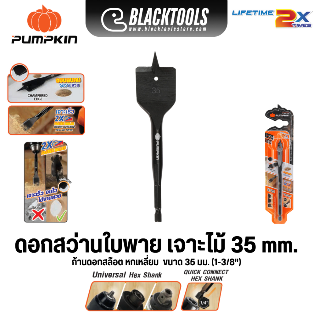 PUMPKIN ดอกสว่านใบพาย เจาะไม้ ก้านหกเหลี่ยม HEX ทุกขนาด 26445-26454 BLACKTOOLS