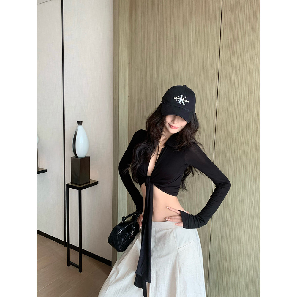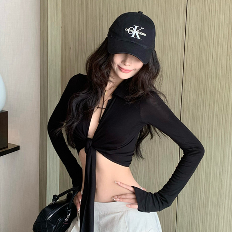 Pudding'พร้อมส่ง' FY2989 เสื้อแขนยาว เสื้อครอปสั้น แขนยาว ดีเทลผูกเอวด้านหน้า สีพื้น เซ็กซี่เบาๆ