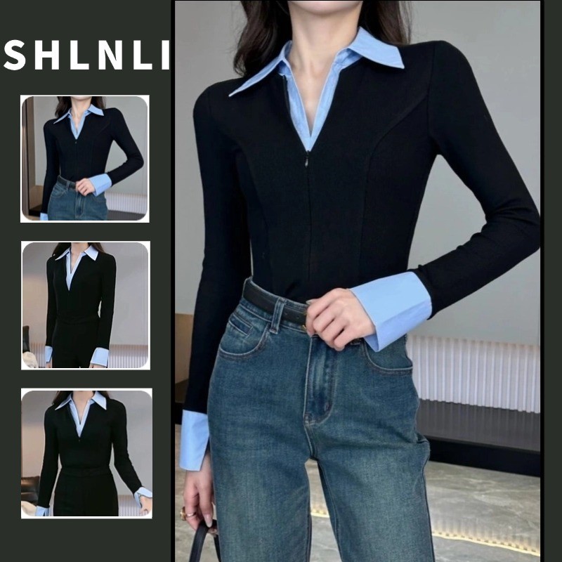 ฤดูใบไม้ผลิของผู้หญิงฤดูร้อนสไตล์เกาหลีปลอมสองชิ้นเสื้อโปโลแขนยาวเย็บปะติดปะต่อกันสลิมฟิตย้อนยุคด้านบน