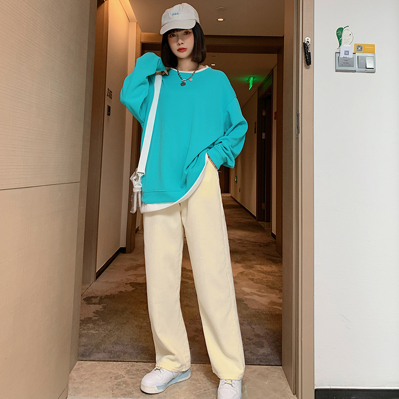 ส่งไวจากไทย พร้อมส่ง S-4XL ฤดูใบไม้ร่วงใหม่กางเกงสตรีผ้าลูกฟูกเอวสูงนักเรียนสบายๆทุกการแข่งขันบางขนาดบวกตรงกางเกงขากว้างหลวม