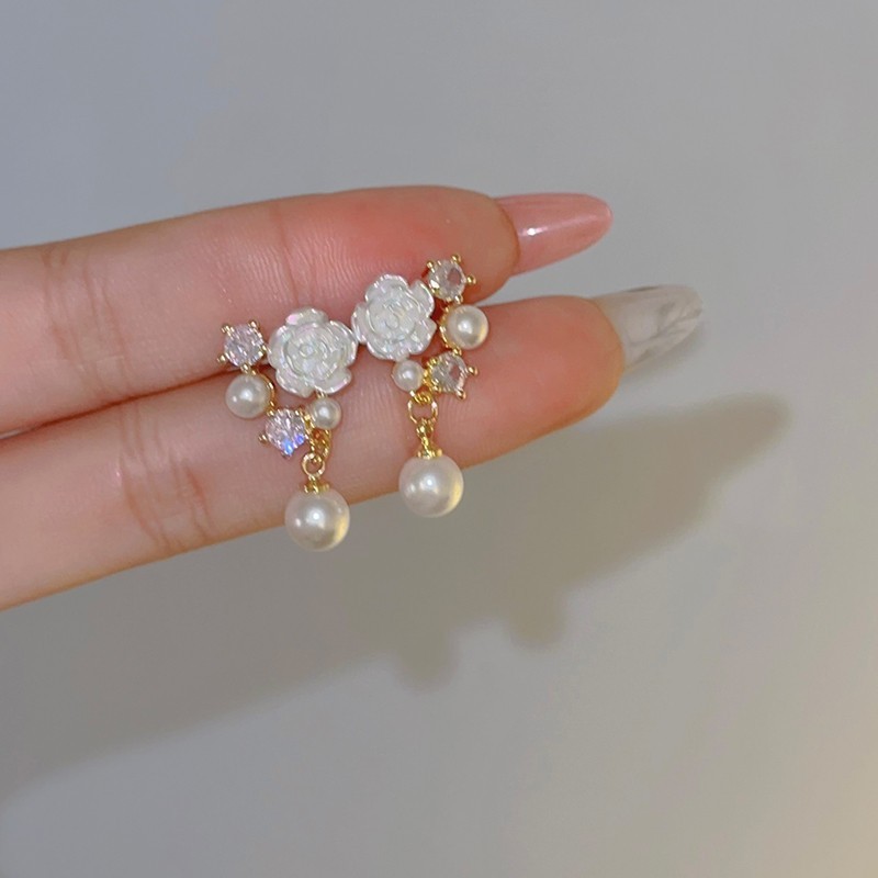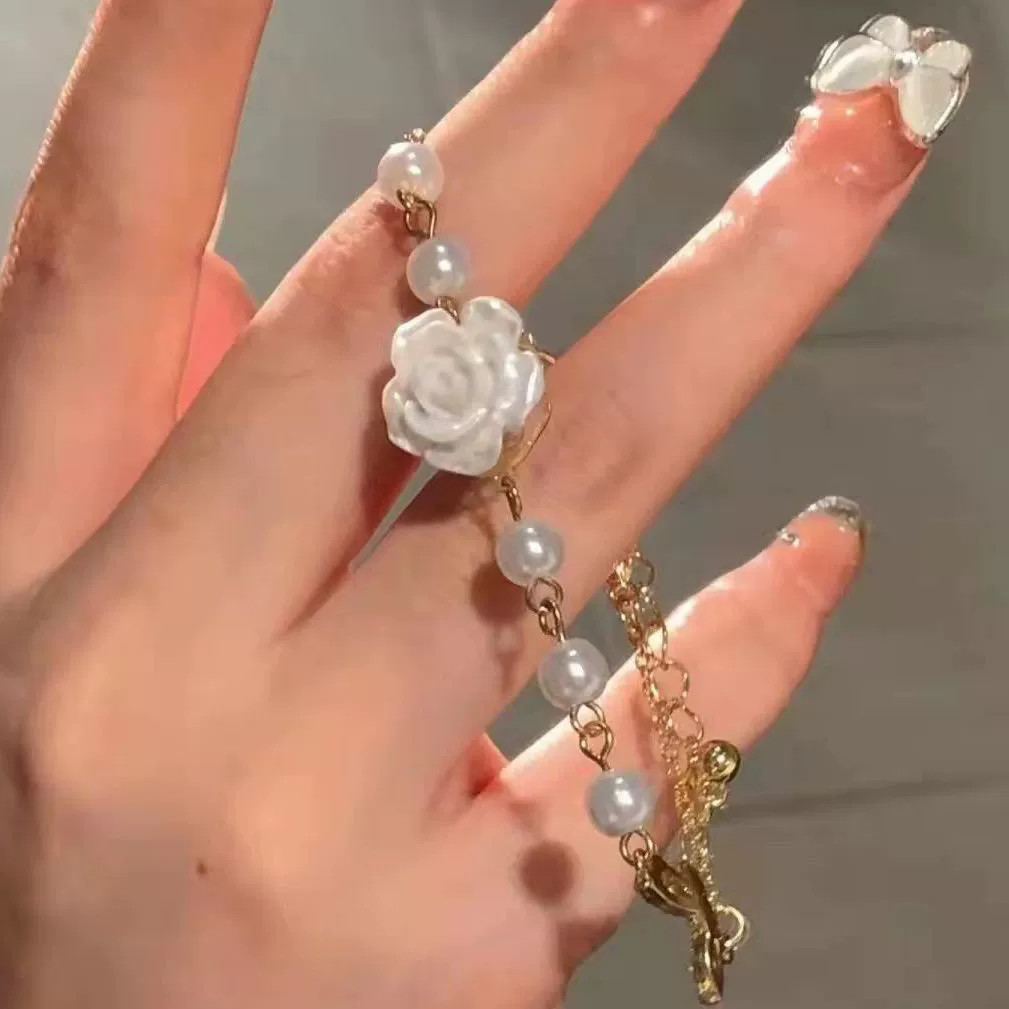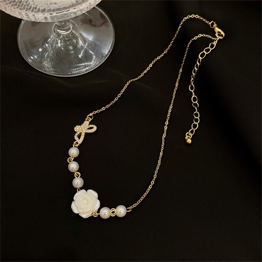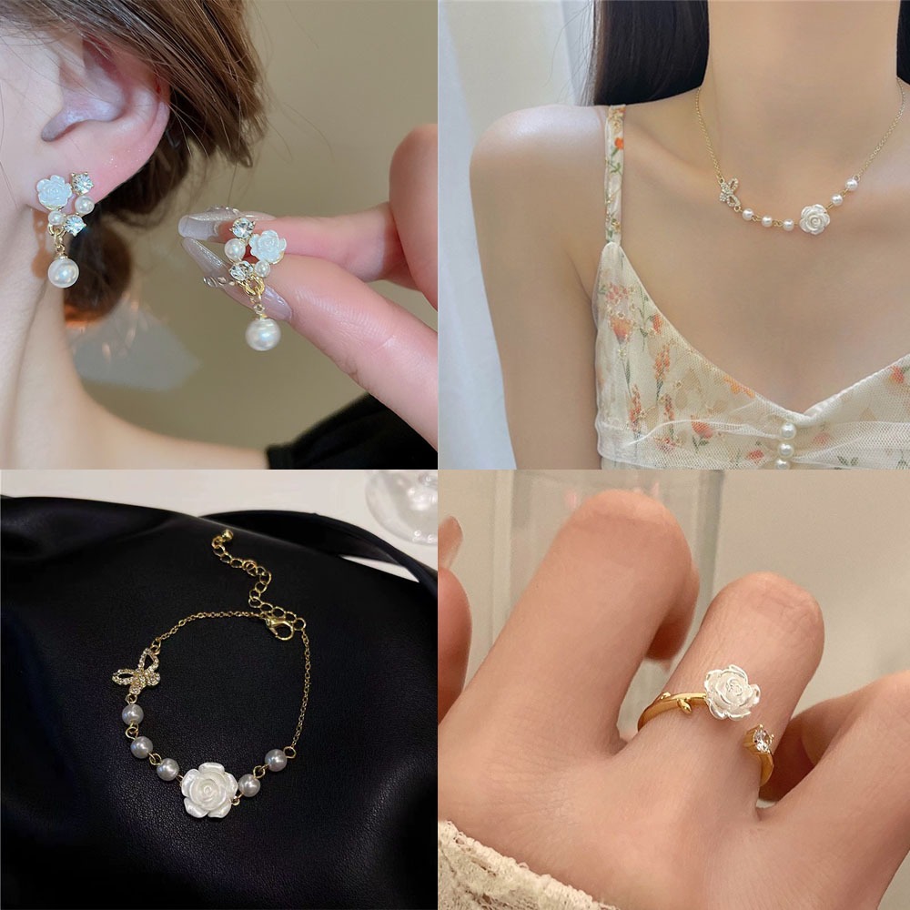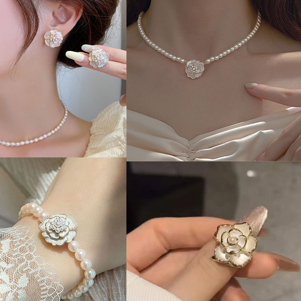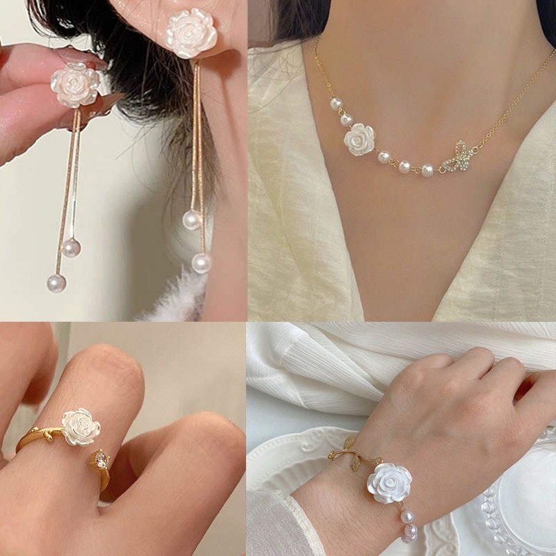 4ชิ้น/เซ็ตสีขาว ดอกเคมีเลีย ชุดเครื่องประดับสําหรับผู้หญิงจี้มุกต่างหูผีเสื้อดอกไม้สร้อยคอแหวนเครื่องประดับที่เรียบง่ายเครื่องประดับแ
