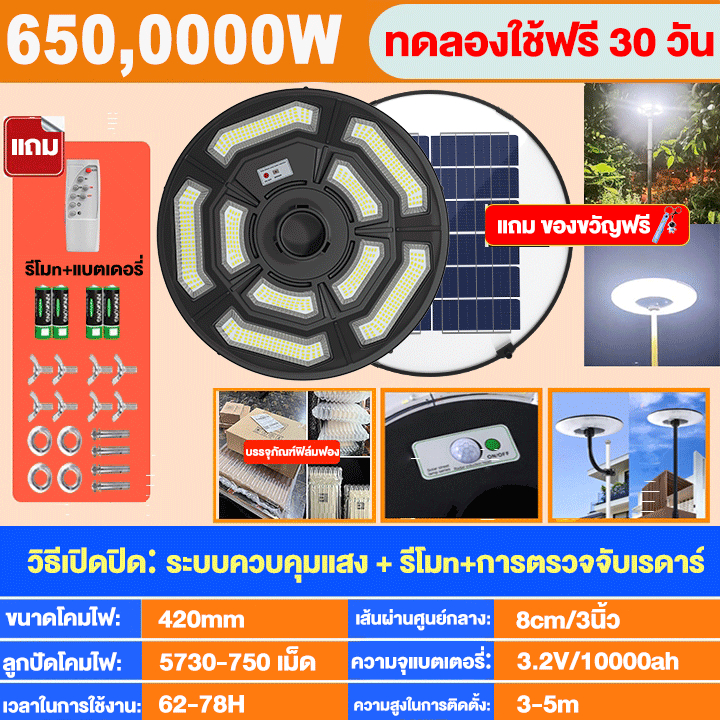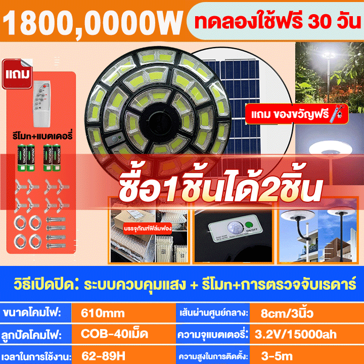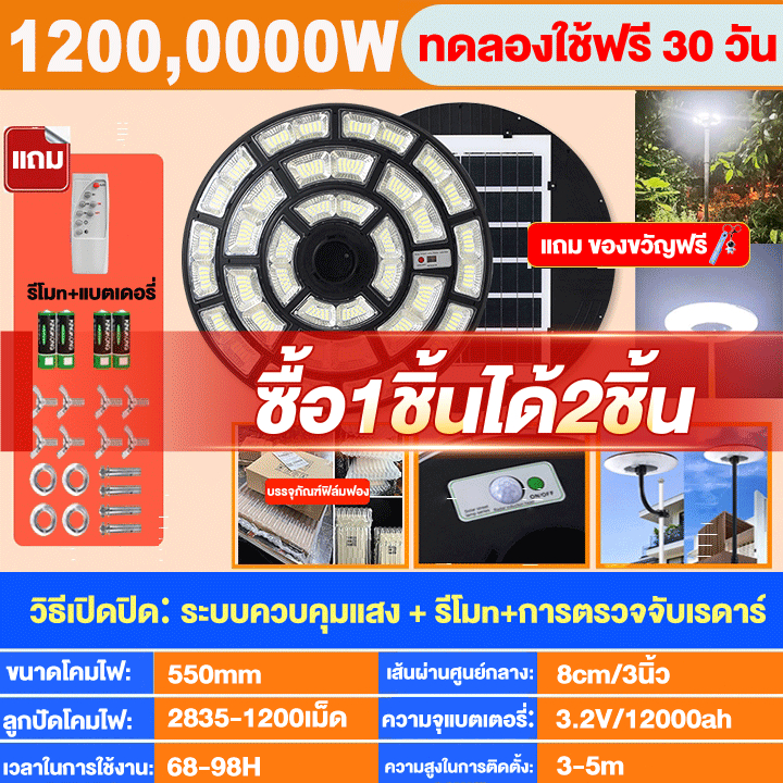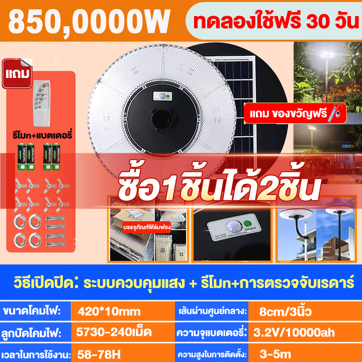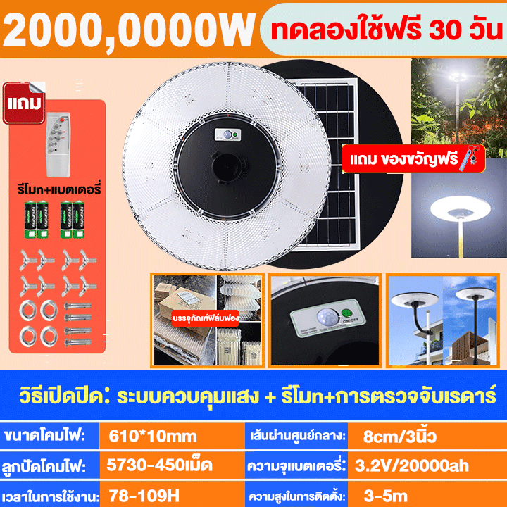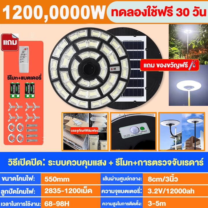 【ซื้อ 1แถม 1】ไฟโซล่าเซลล์ UFO โคมไฟโซล่าเซลล์ 2000000W IP69กันน้ำและป้องกันฟ้าผ่า แสงขาว ไฟสว่างมาก