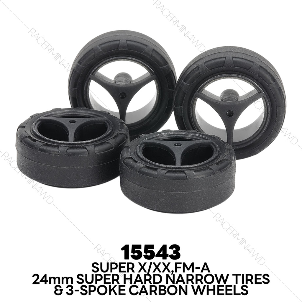 15543 Mini 4WD 24mm Super Hard Narrow Tires & 3-Spoke Carbon Wheels for Super X & XX Chassis ล้อรถทามิย่า