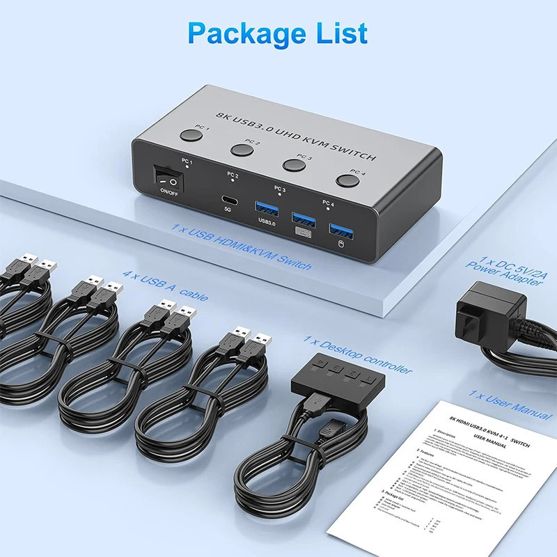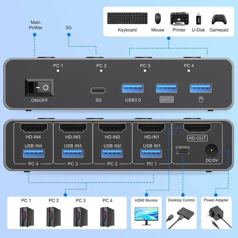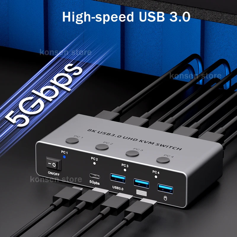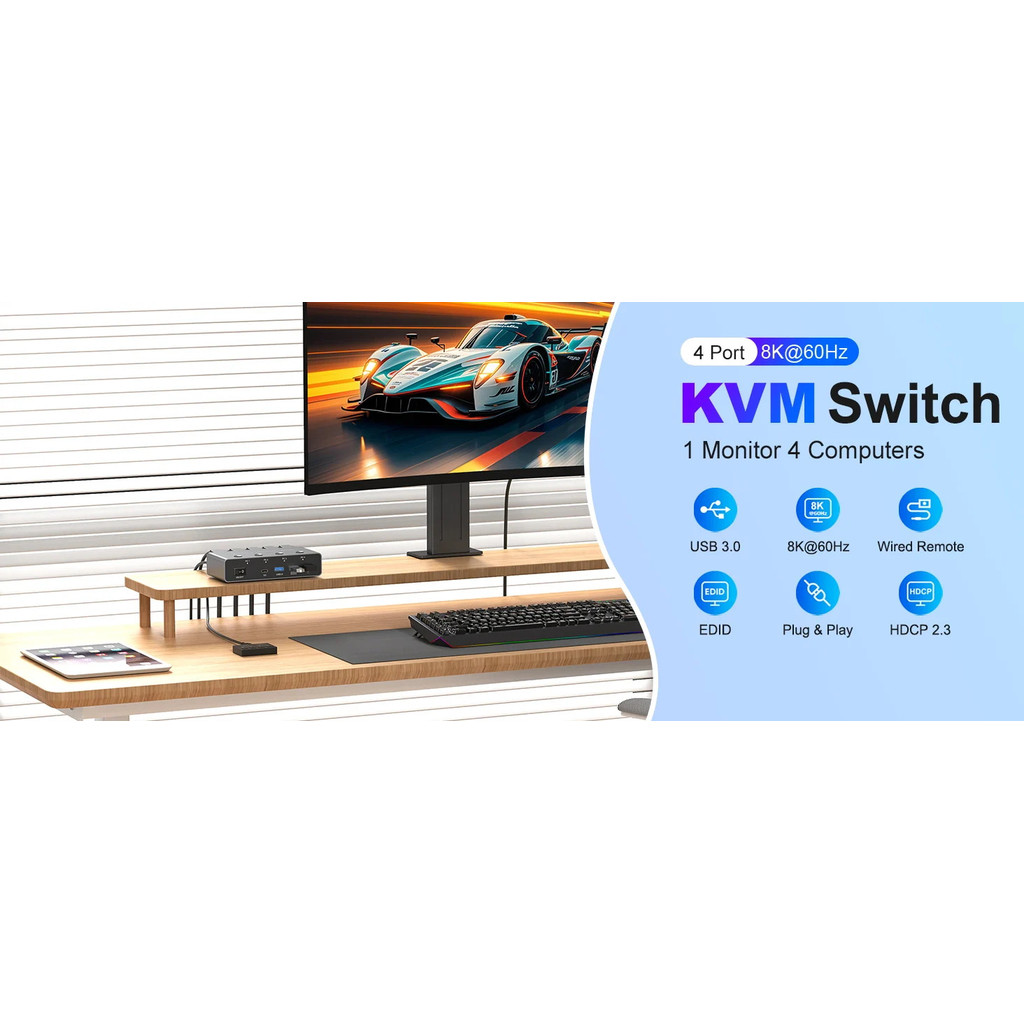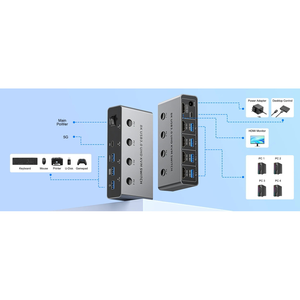 8K 60Hz 4K 120Hz HDMI KVM สวิทช์ 4x1 สําหรับ 4 PC Share 1 Monitor คีย์บอร์ดเมาส์ฮาร์ดไดรฟ์ เครื่องพิมพ์