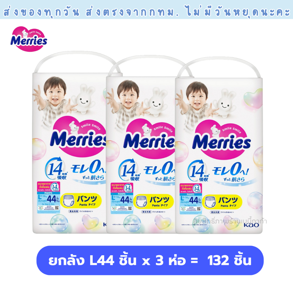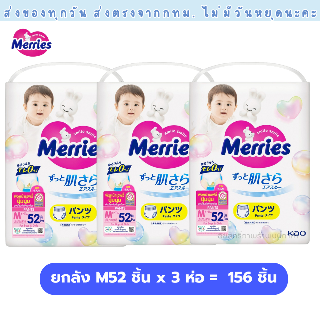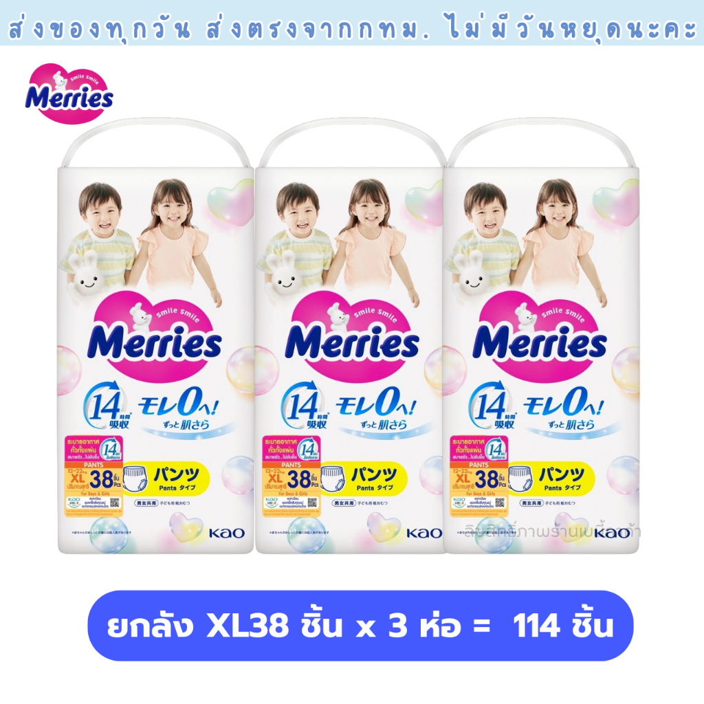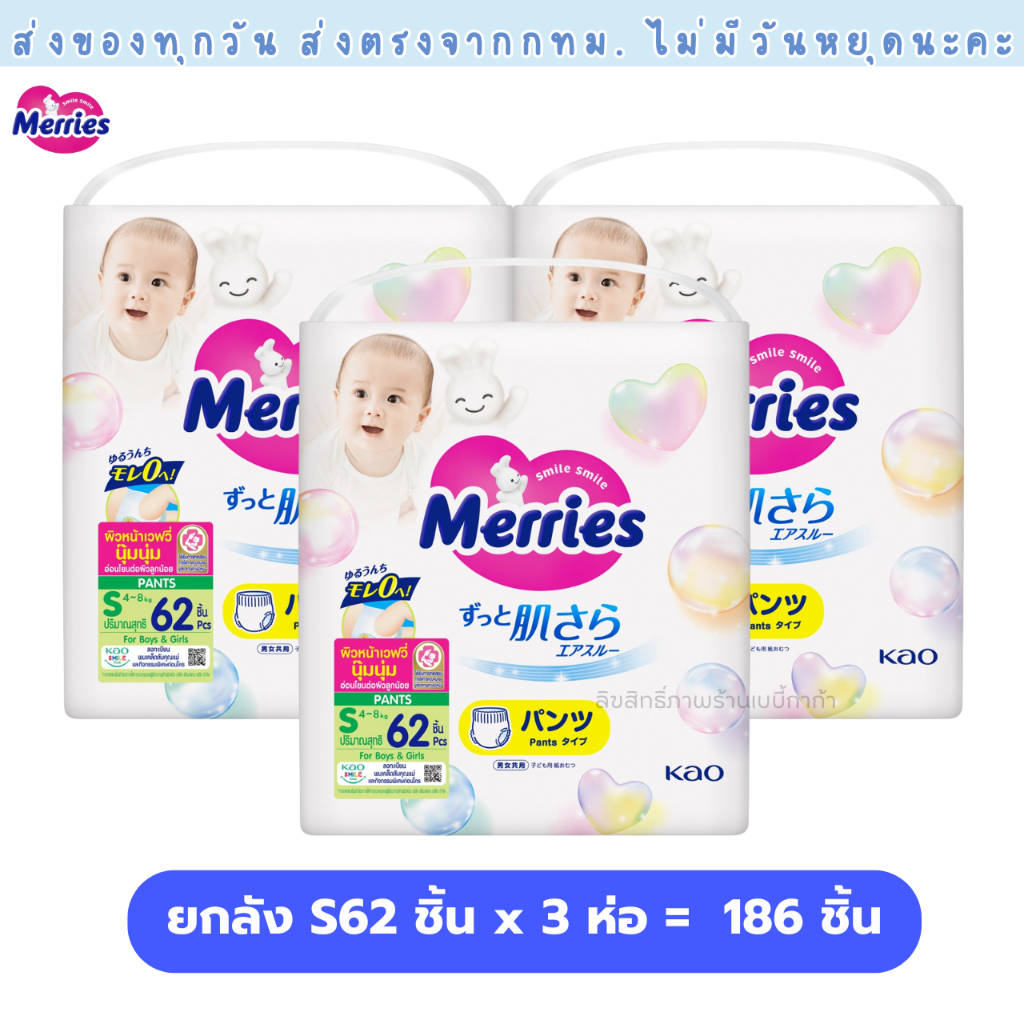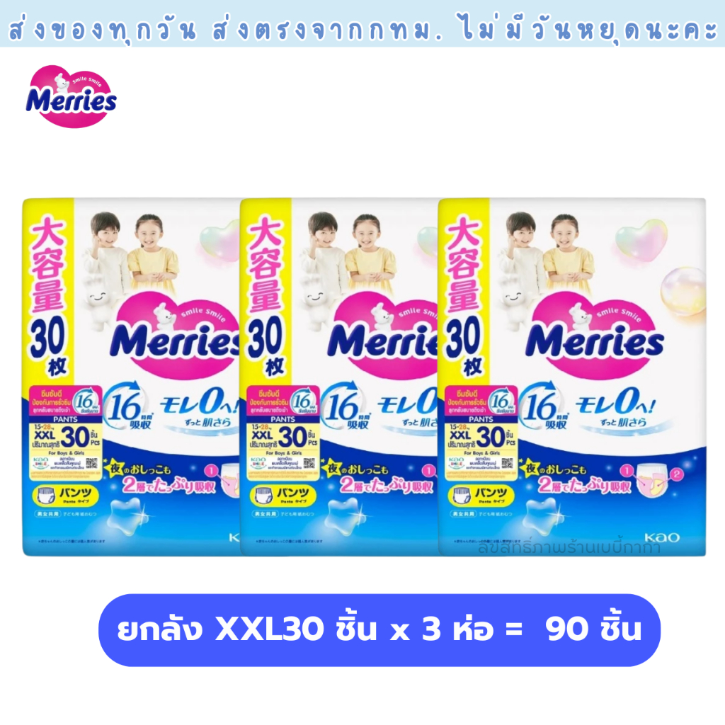 แพมเพิส Merries เมอรรี่ แบบกางเกง มีไซส์ S-XXL Super Jumbo ยกลัง 3 ห่อใหญ่ ของแท้ มีใบรับรองตัวแทน