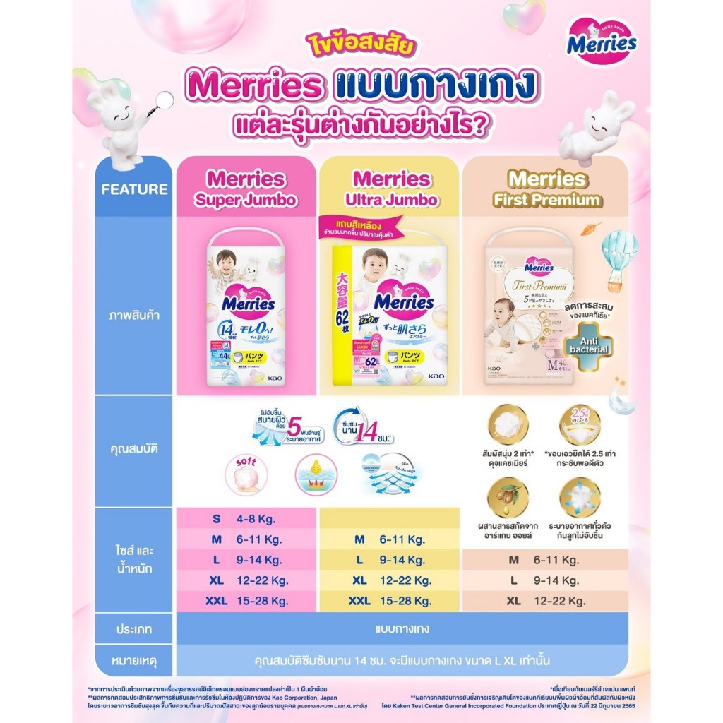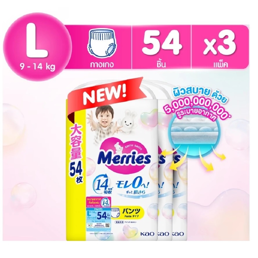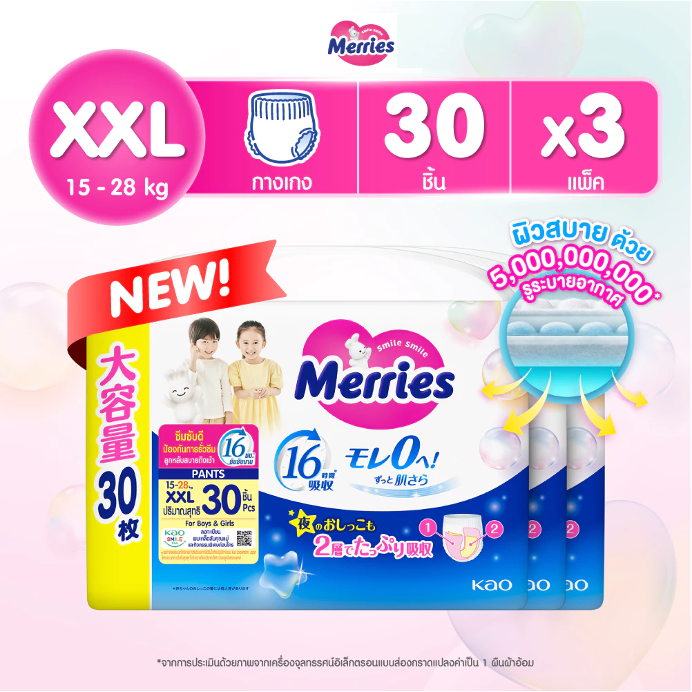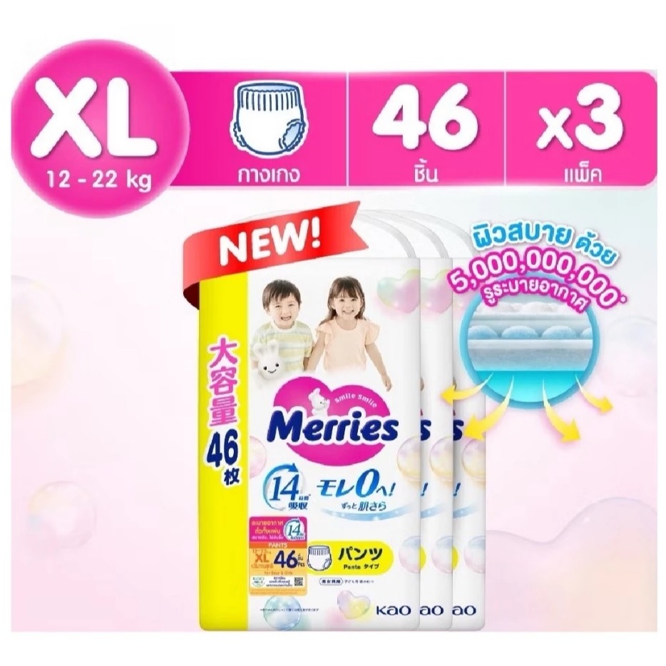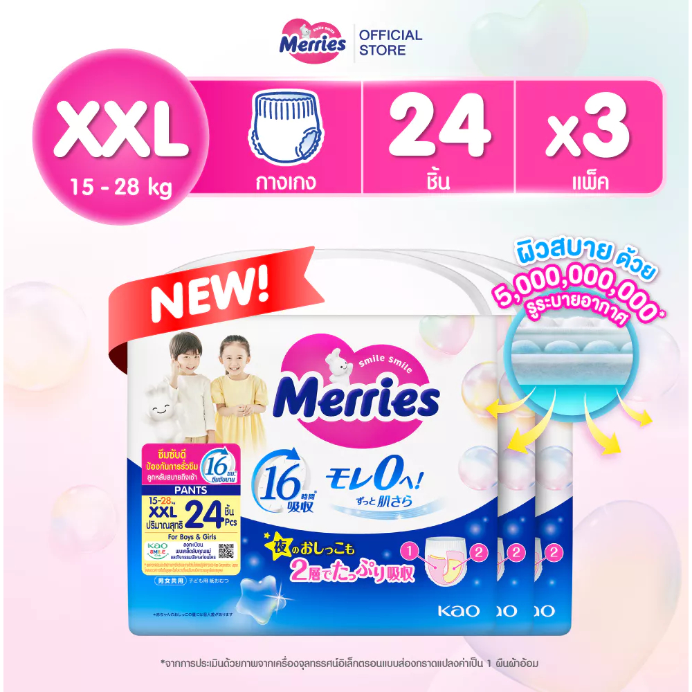 แพมเพิส Merries เมอรรี่ แบบกางเกง มีไซส์ S-XXL Super Jumbo ยกลัง 3 ห่อใหญ่ ของแท้ มีใบรับรองตัวแทน