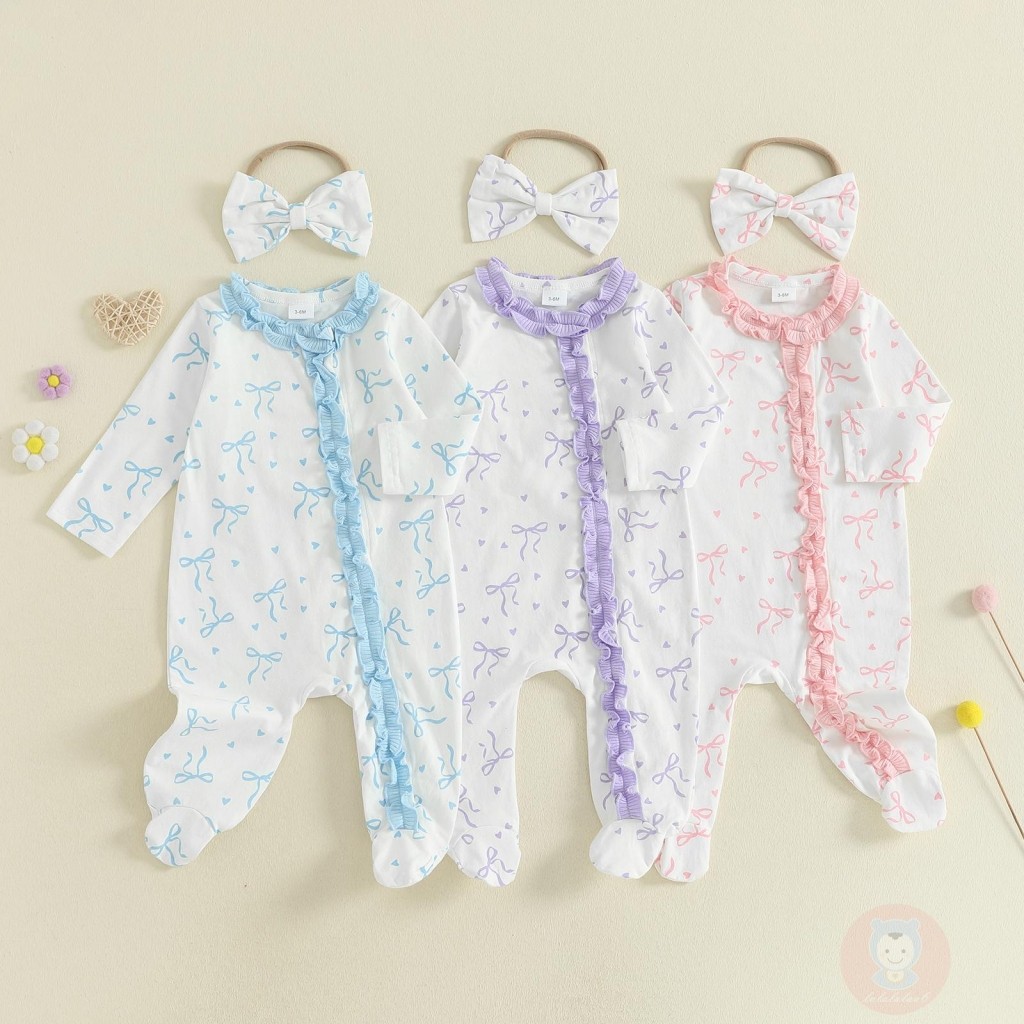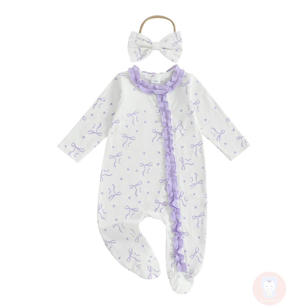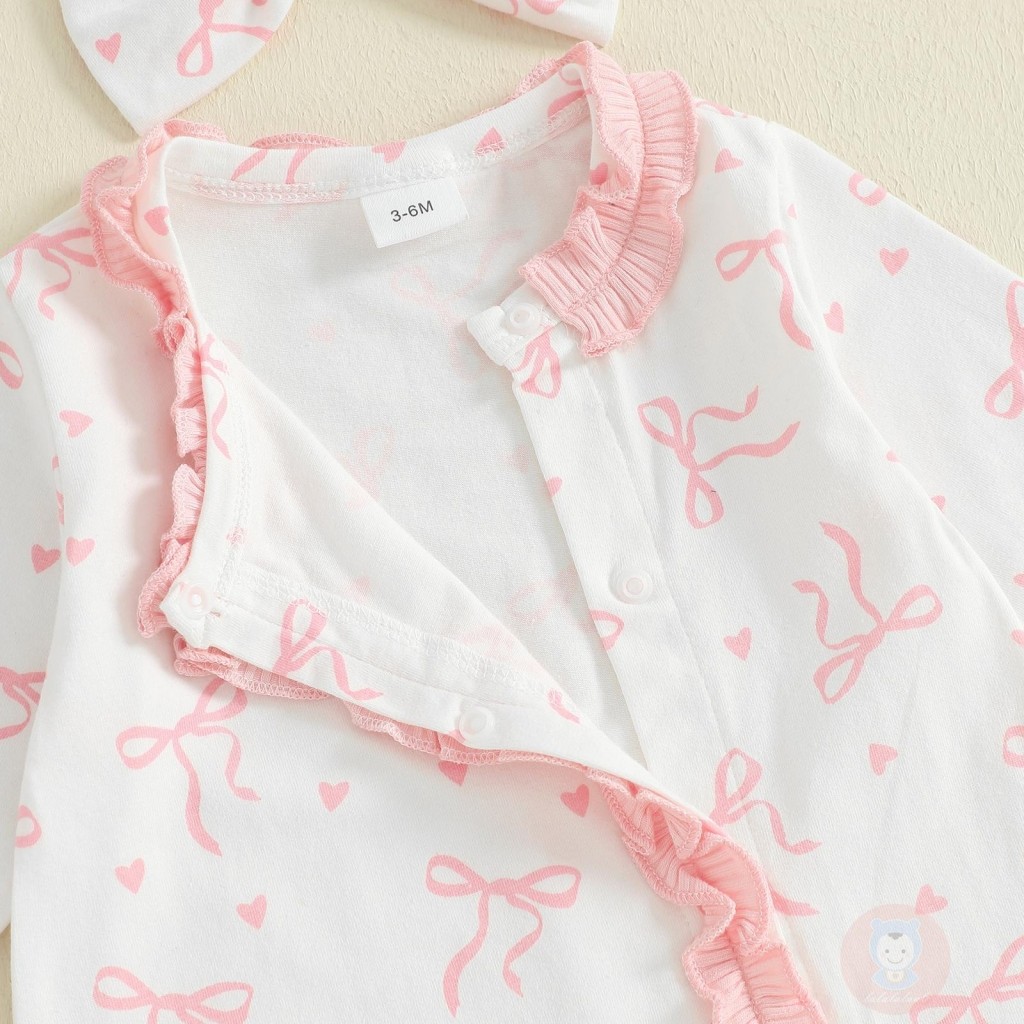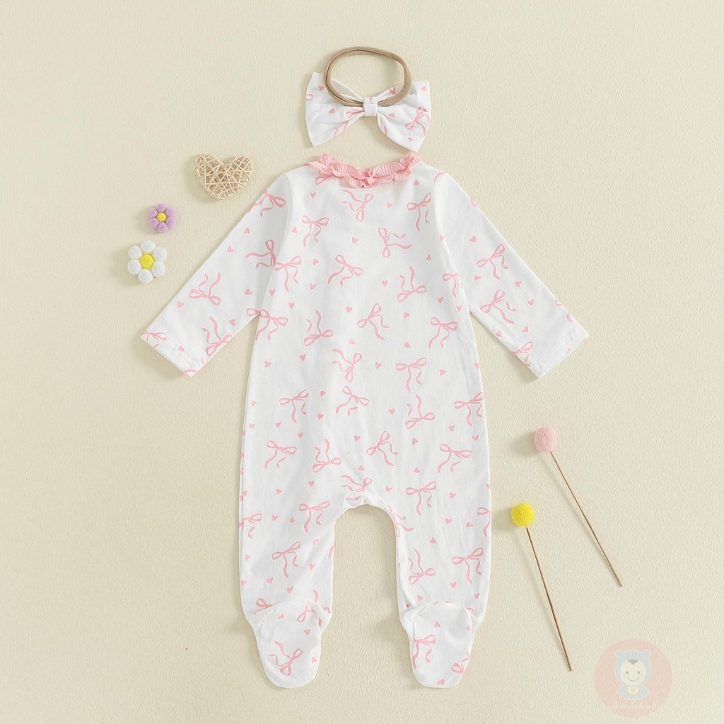 ชุดเสื้อคลุมขาสำหรับทารกแรกเกิด แขนยาว พิมพ์ลายโบว์ ตัดแต่งรอบคอมีซิป และมาพร้อมแถบคาดศีรษะ