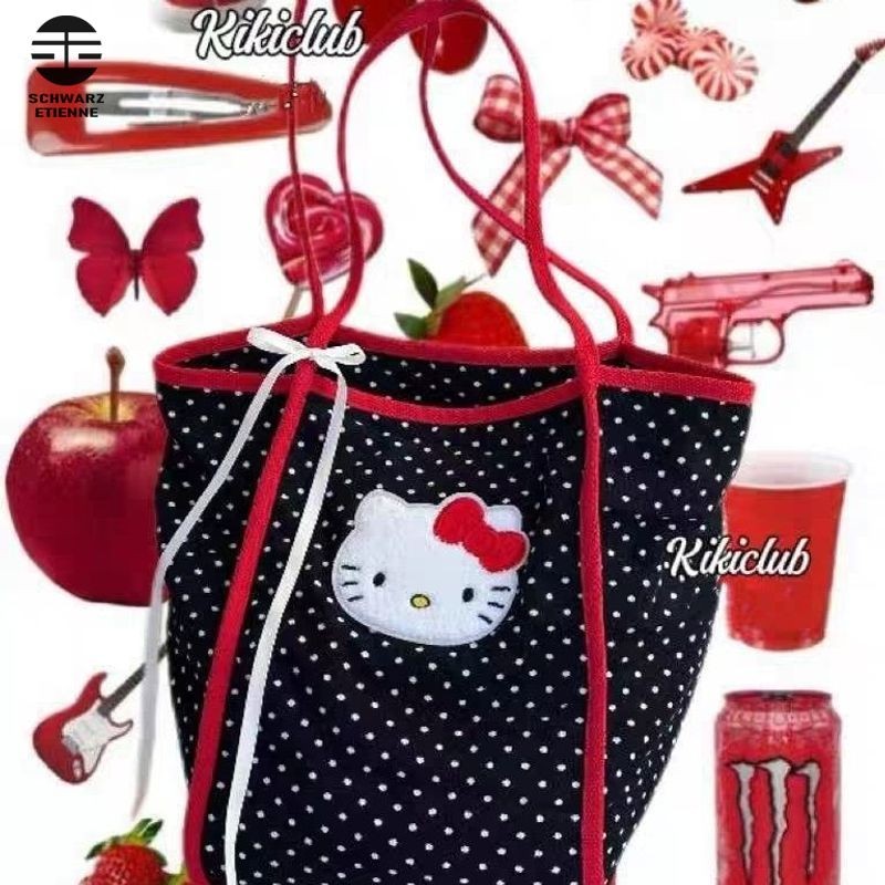 Schwarz ENTEN Hello Kitty Polka Dot Canvas Tote Bag กระเป๋าสะพายความจุขนาดใหญ่