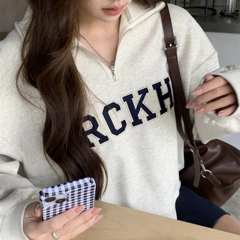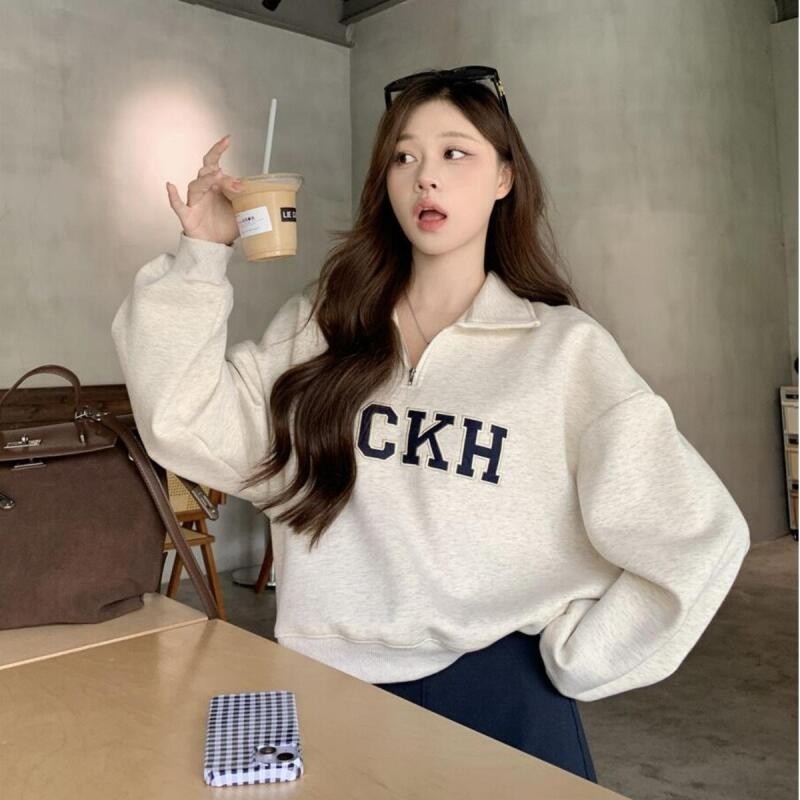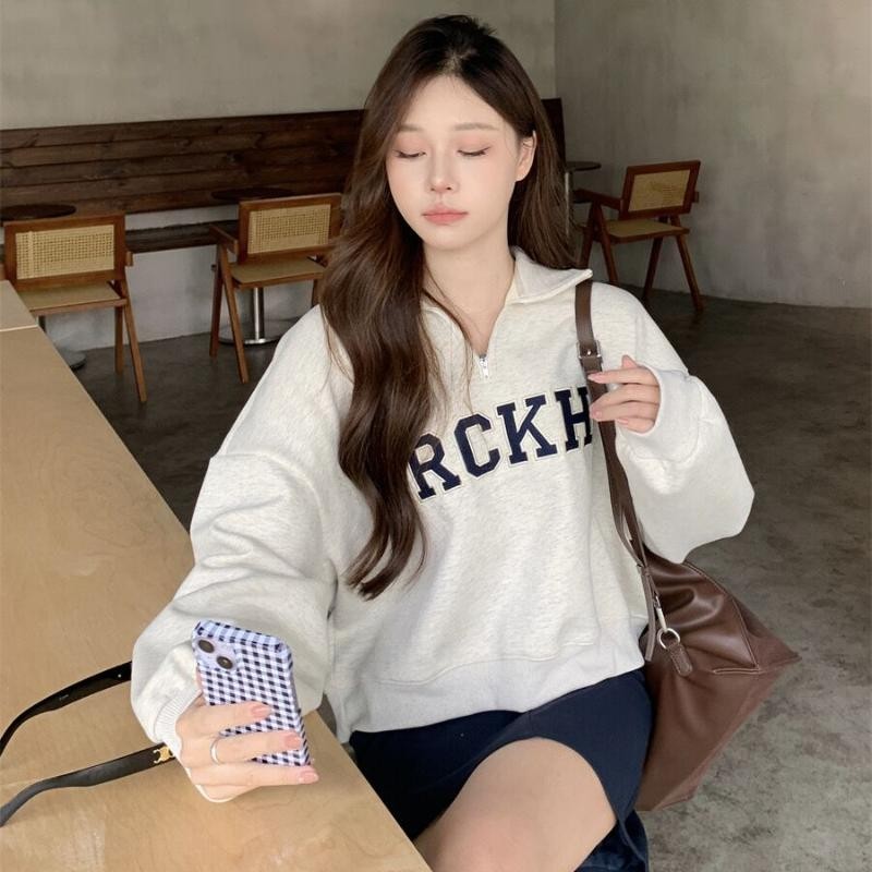 Solovely สไตล์เกาหลี ปัก โปโล สเวตเตอร์ แขนยาว เสื้อสตรี หลวม สเวตเชิ้ต