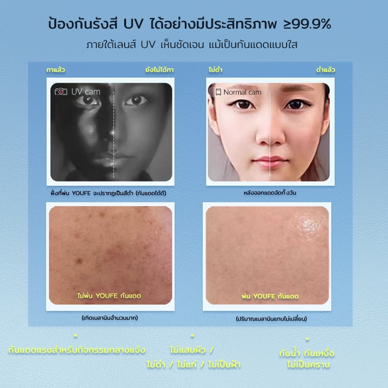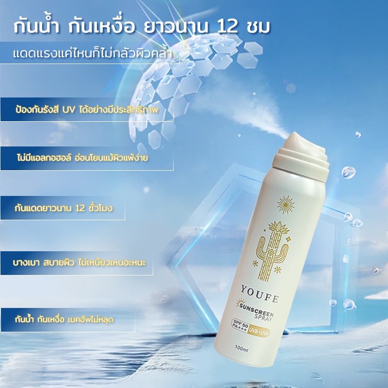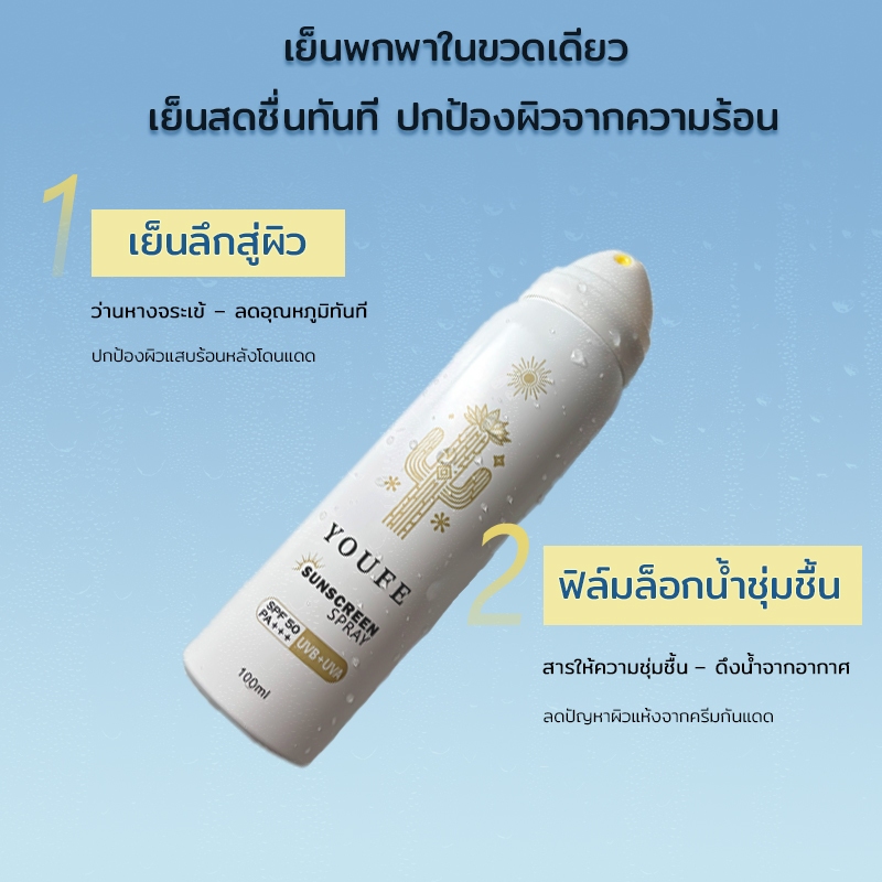YOUFE สเปรย์กันแดด สาระสําคัญจากพืช SPF50 +PA + + ++【100ML】 Sunscreen Spray กันแดดกันน้ำกันเหงื่อ พกพาสะดวก สามารถป้องกันแสงแดดได้12ชม