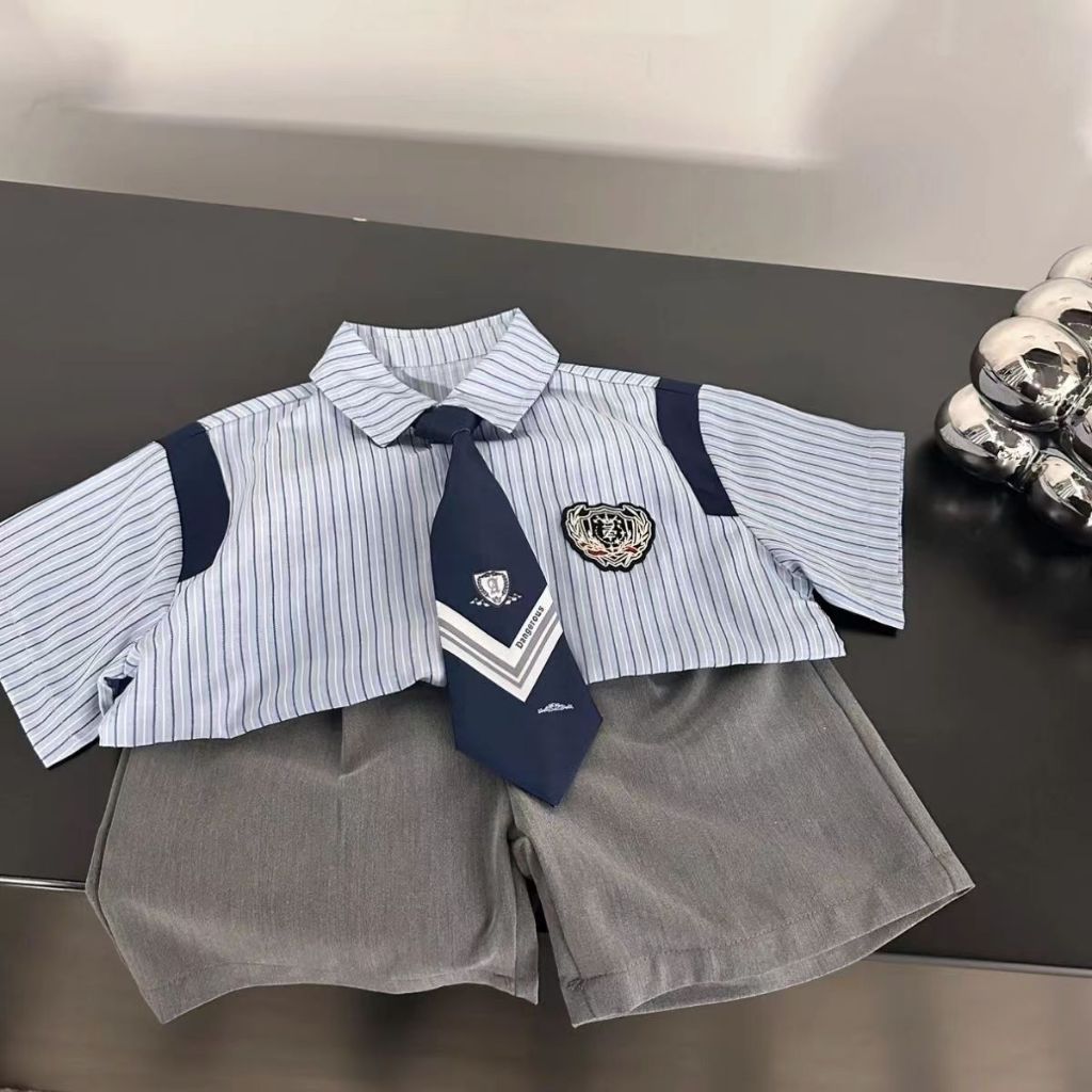 เด็กชายกางเกงขาสั้นแขนสั้นฤดูร้อนสไตล์ใหม่กลางเด็กเล็กชุดฤดูร้อนกระโหลกสไตล์ปักเป้าหล่อทอดถนนเสื้อผูก