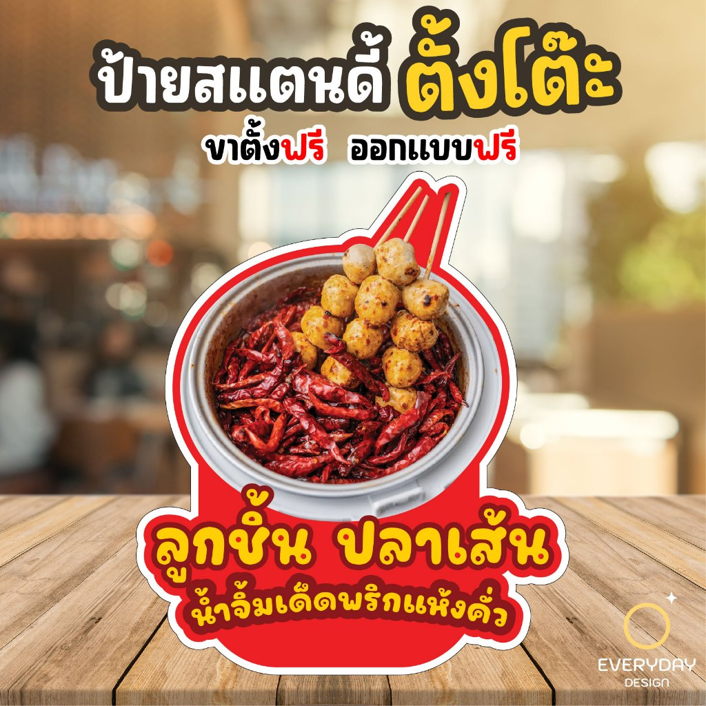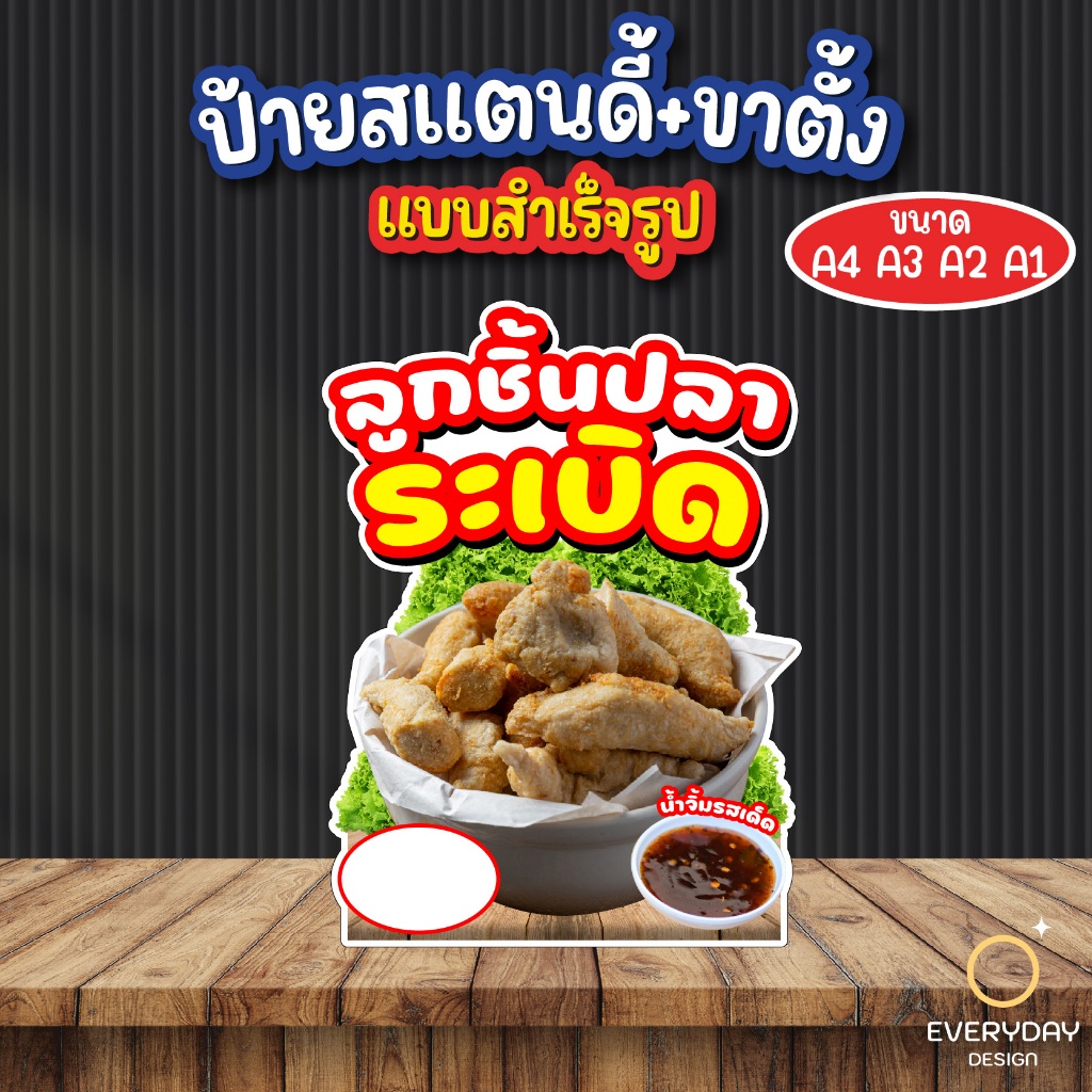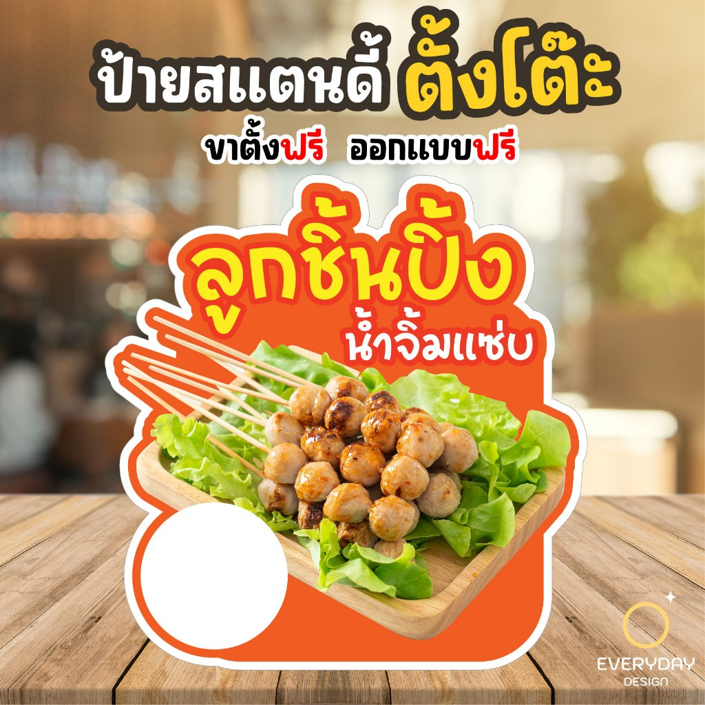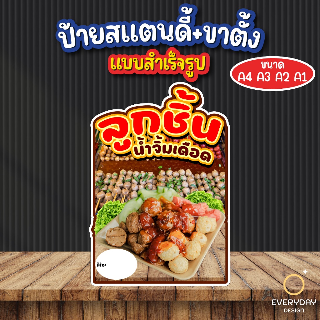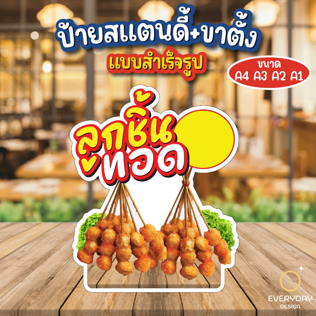 ป้ายลูกชิ้นทอด ลูกชิ้นปิ้ง ป้ายสแตนดี้ตั้งโต๊ะ พร้อมขาตั้ง ขนาด A4 A3 A2 A1 ป้ายฟิวเจอร์บอร์ด พร้อมส่ง