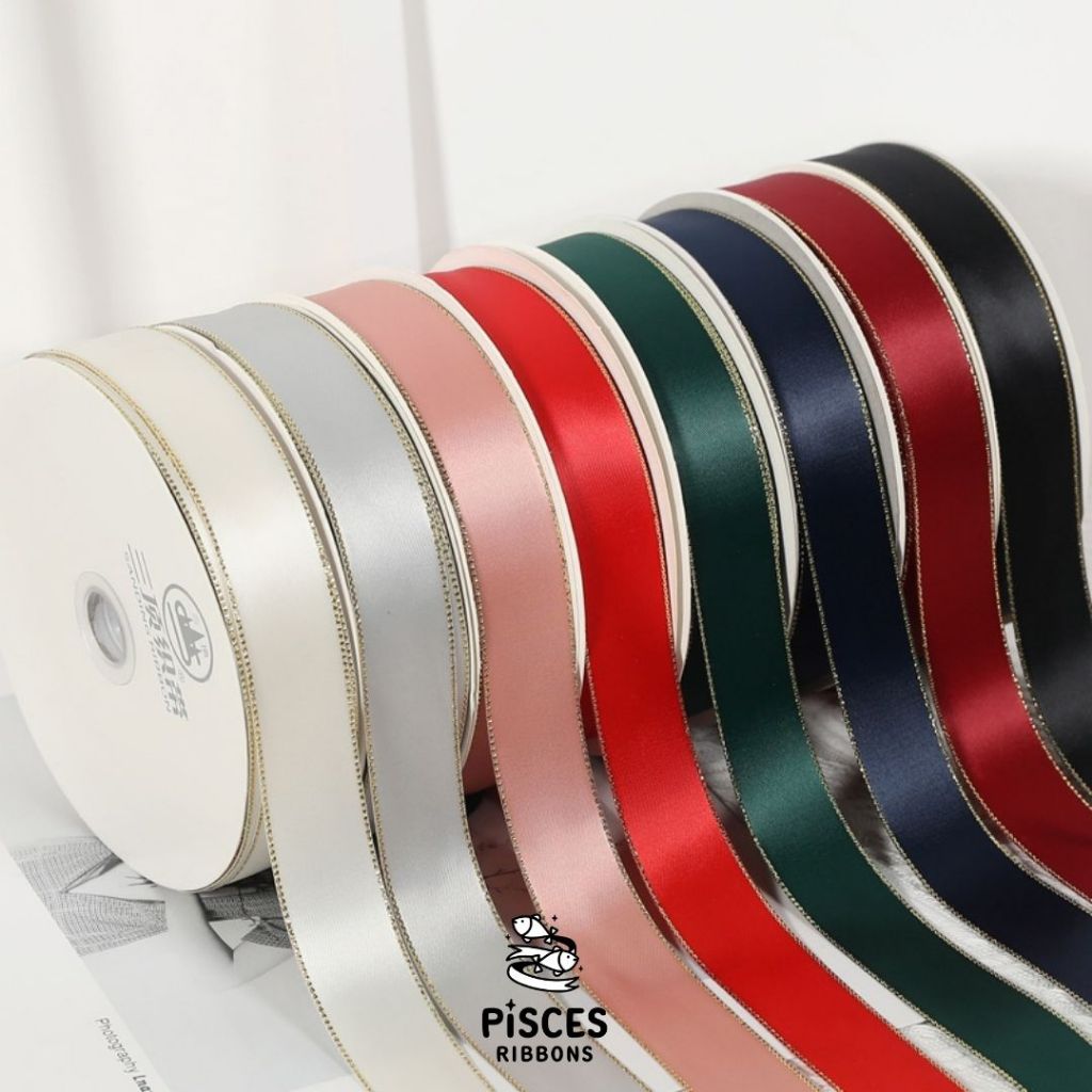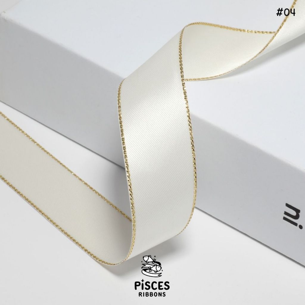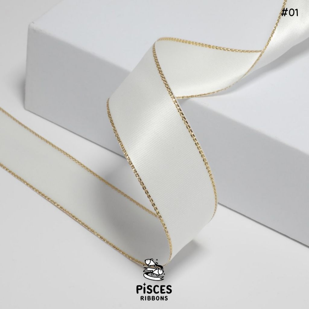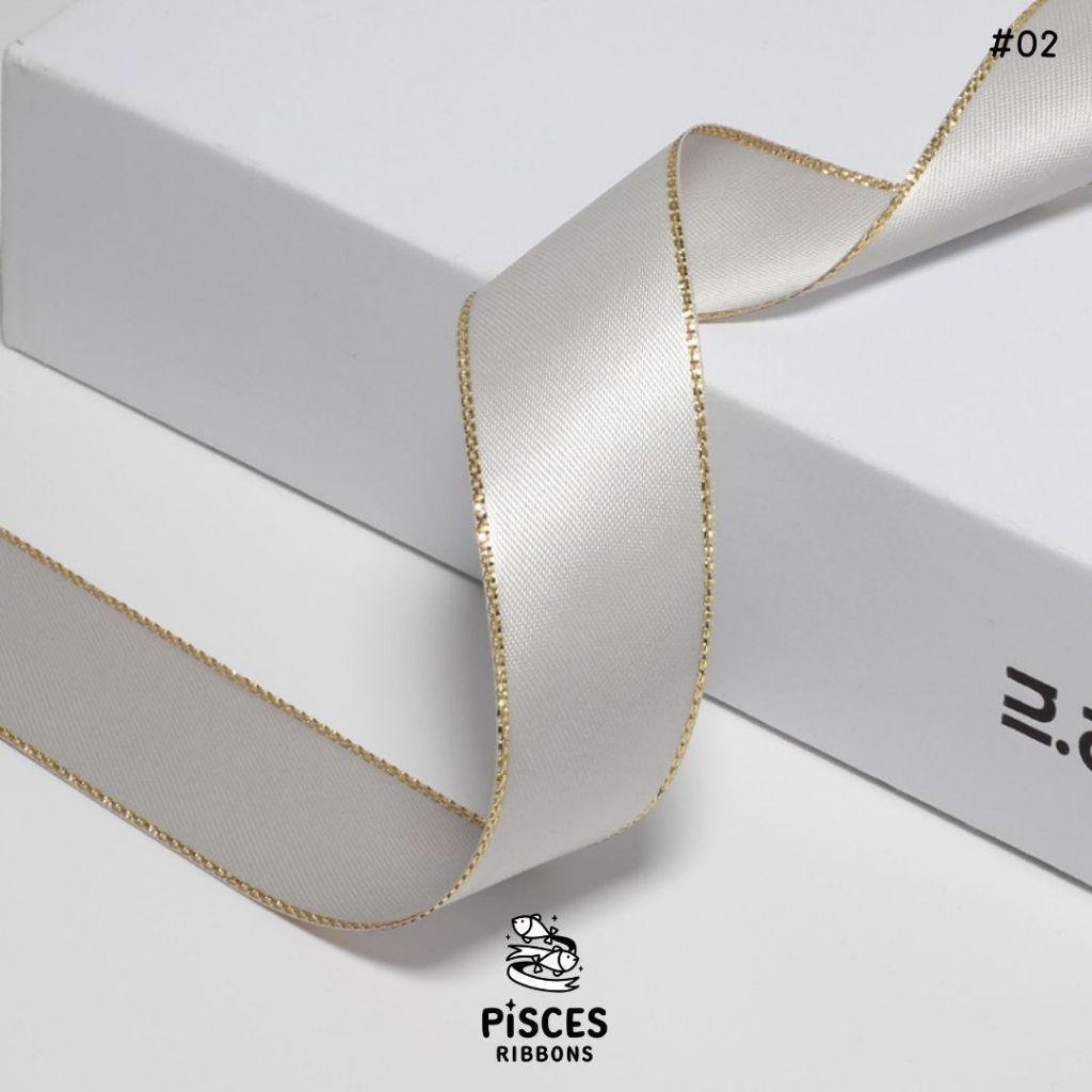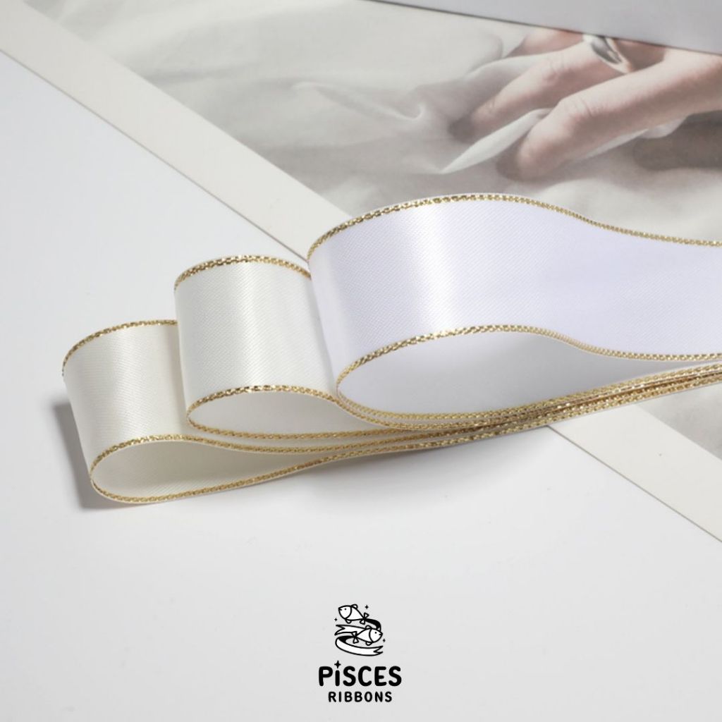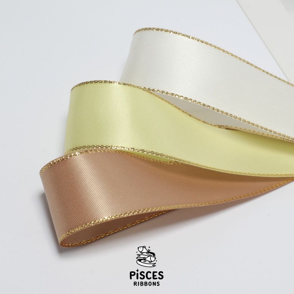 1 ม้วน【50 หลา】* ริบบิ้นซาตินขอบทอง 2.5 ซม. “Golden Edge” – เรียบหรู ดูอบอุ่น สไตล์มินิมอล ผูกของขวัญ ผูกผม[RBR-0064]