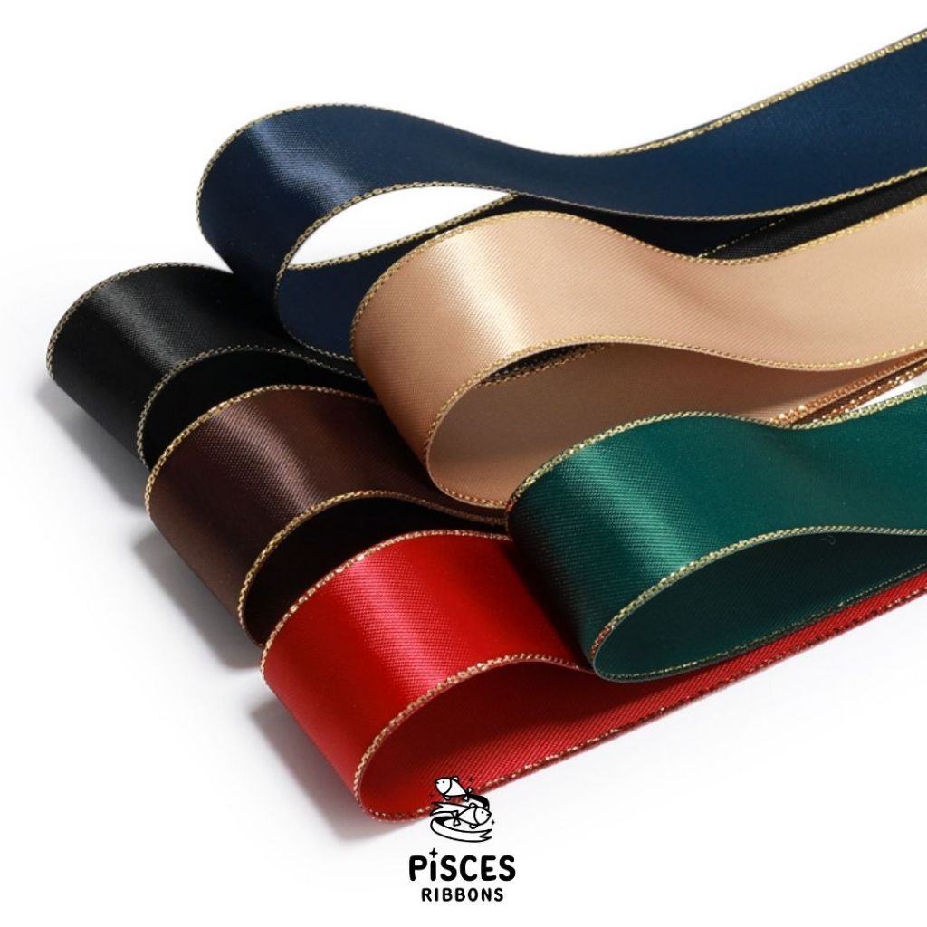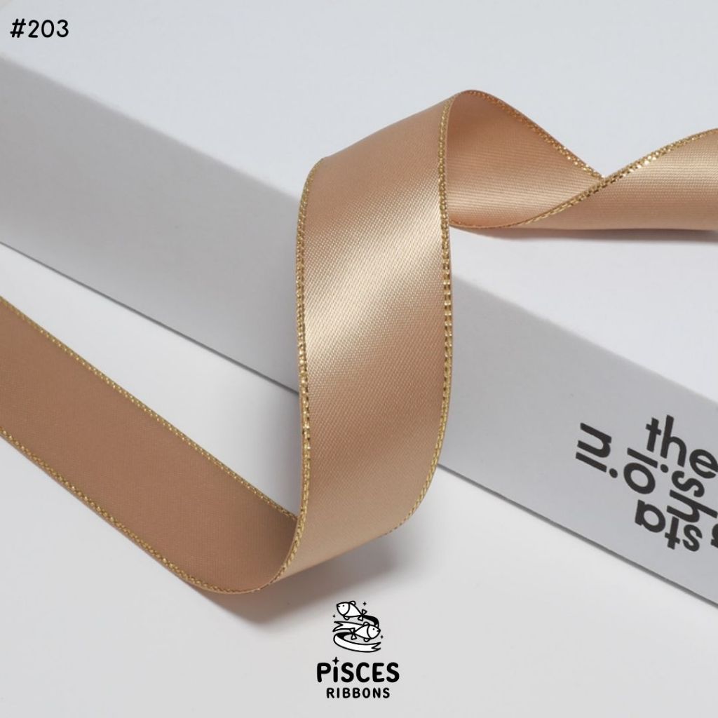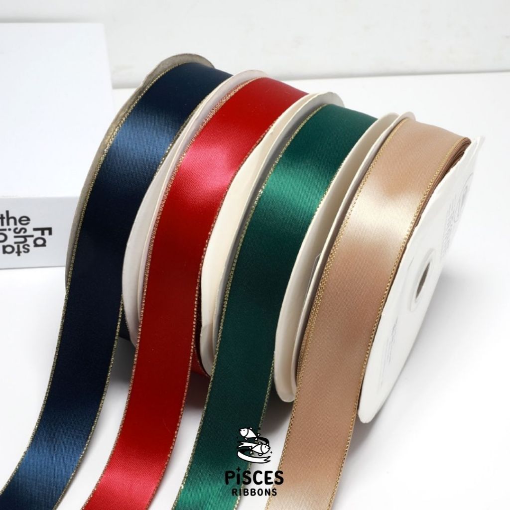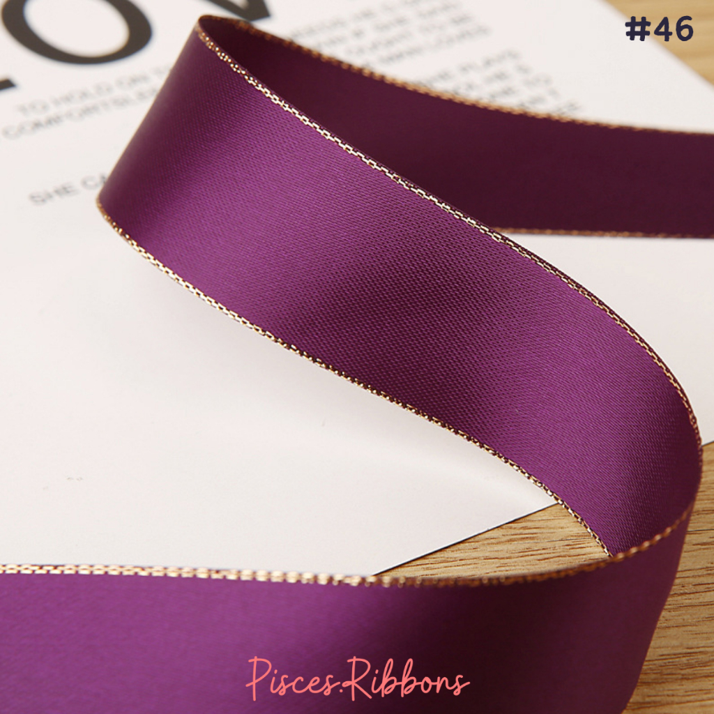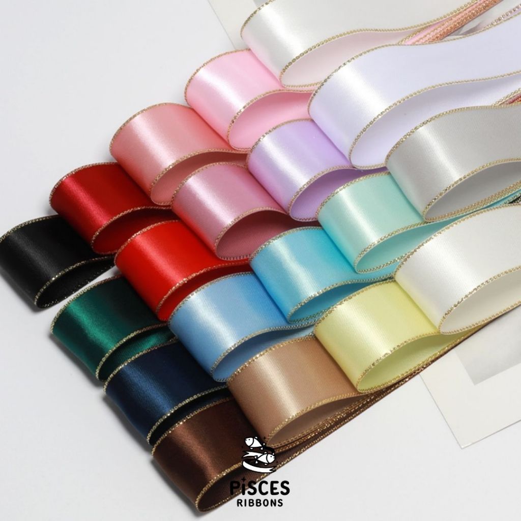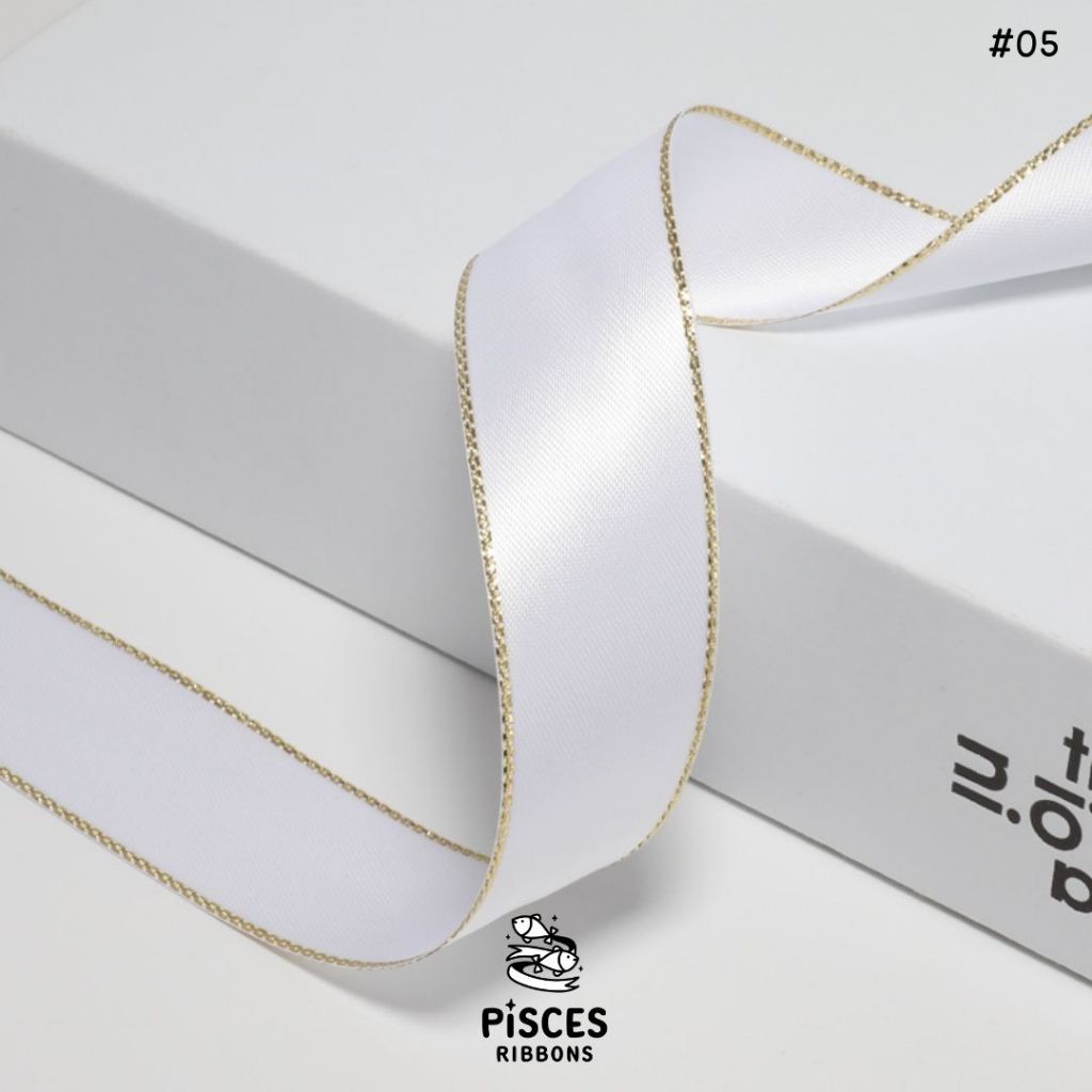 1 ม้วน【50 หลา】* ริบบิ้นซาตินขอบทอง 2.5 ซม. “Golden Edge” – เรียบหรู ดูอบอุ่น สไตล์มินิมอล ผูกของขวัญ ผูกผม[RBR-0064]