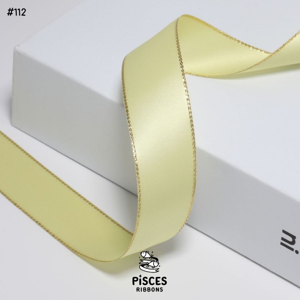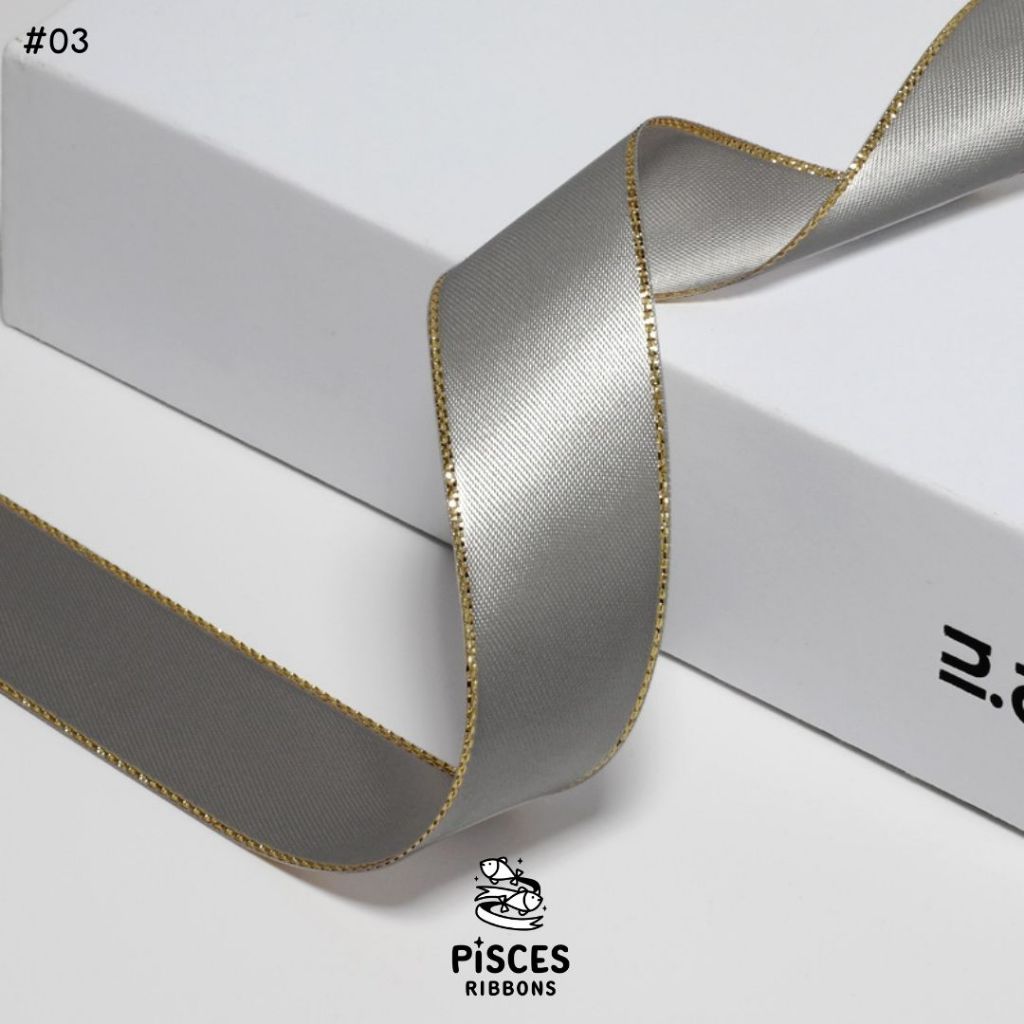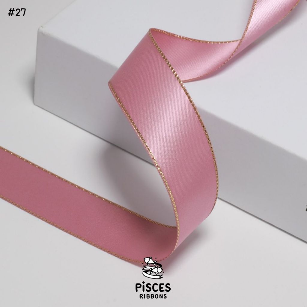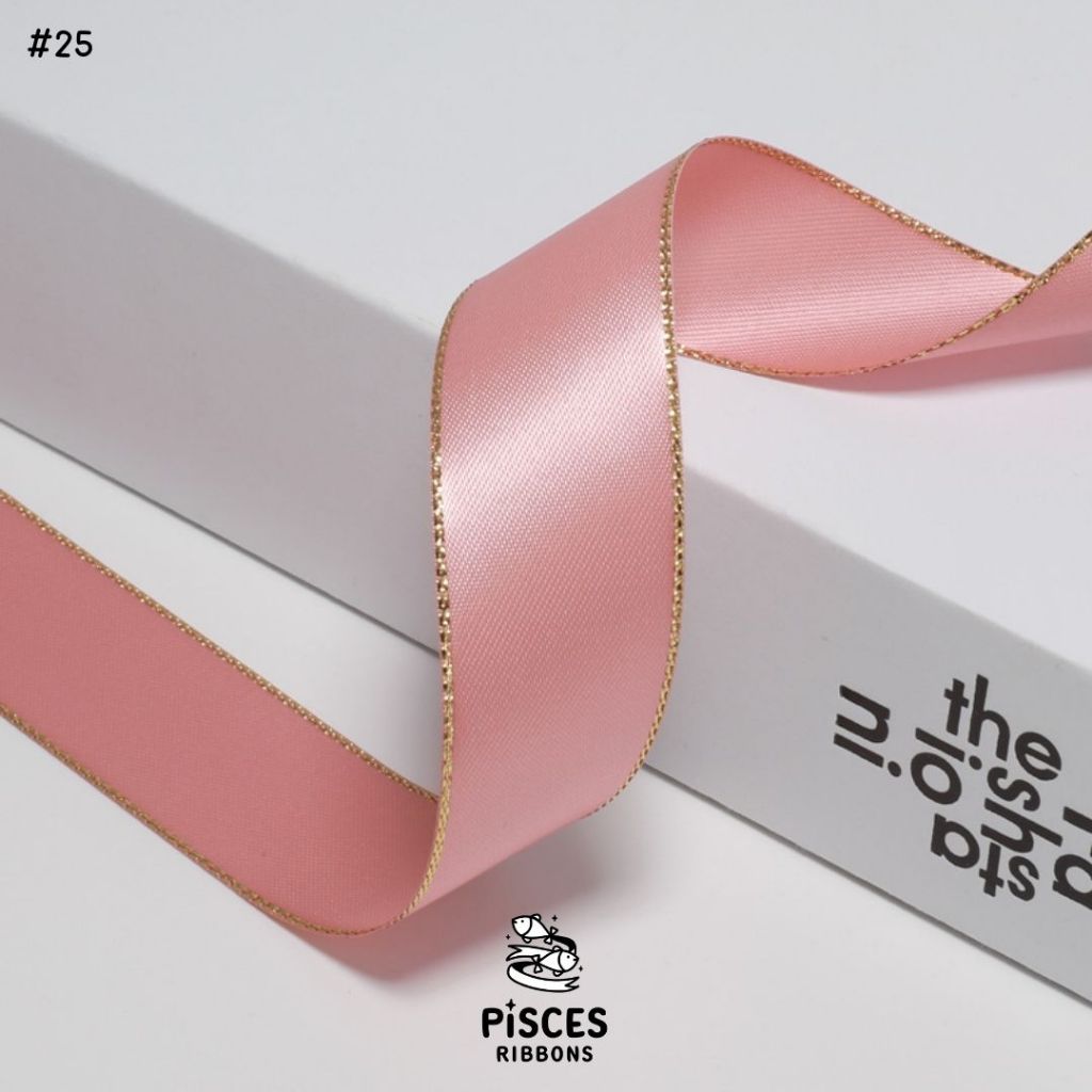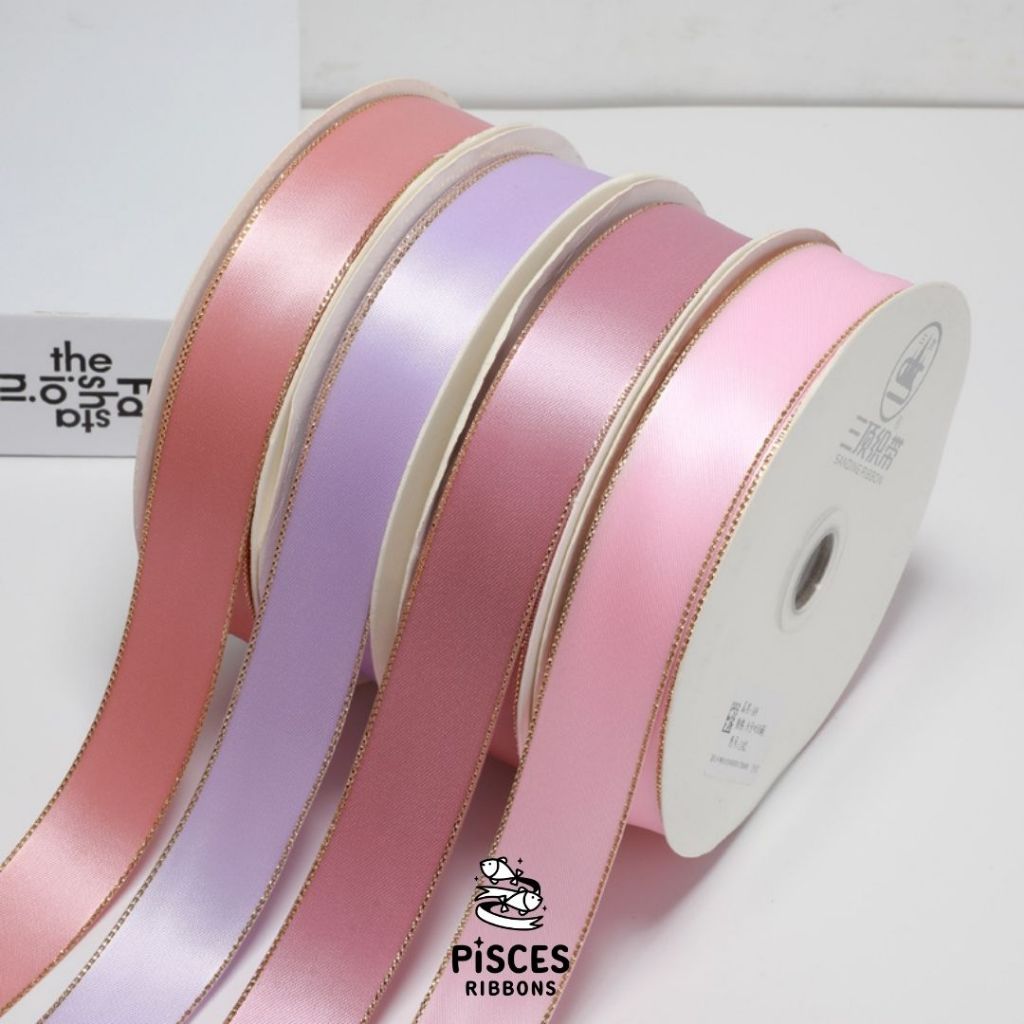 1 ม้วน【50 หลา】* ริบบิ้นซาตินขอบทอง 2.5 ซม. “Golden Edge” – เรียบหรู ดูอบอุ่น สไตล์มินิมอล ผูกของขวัญ ผูกผม[RBR-0064]