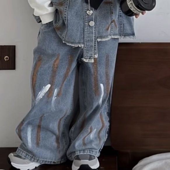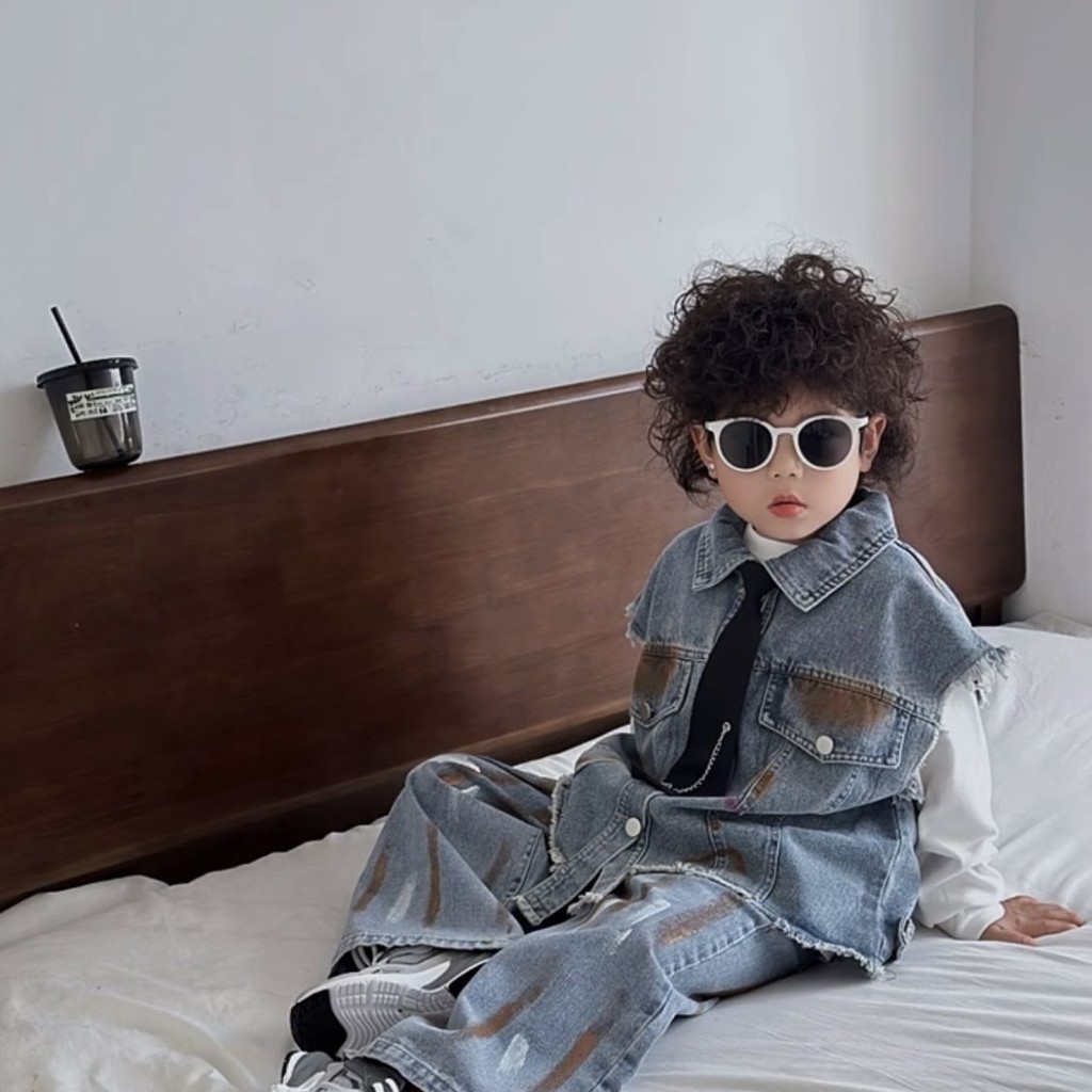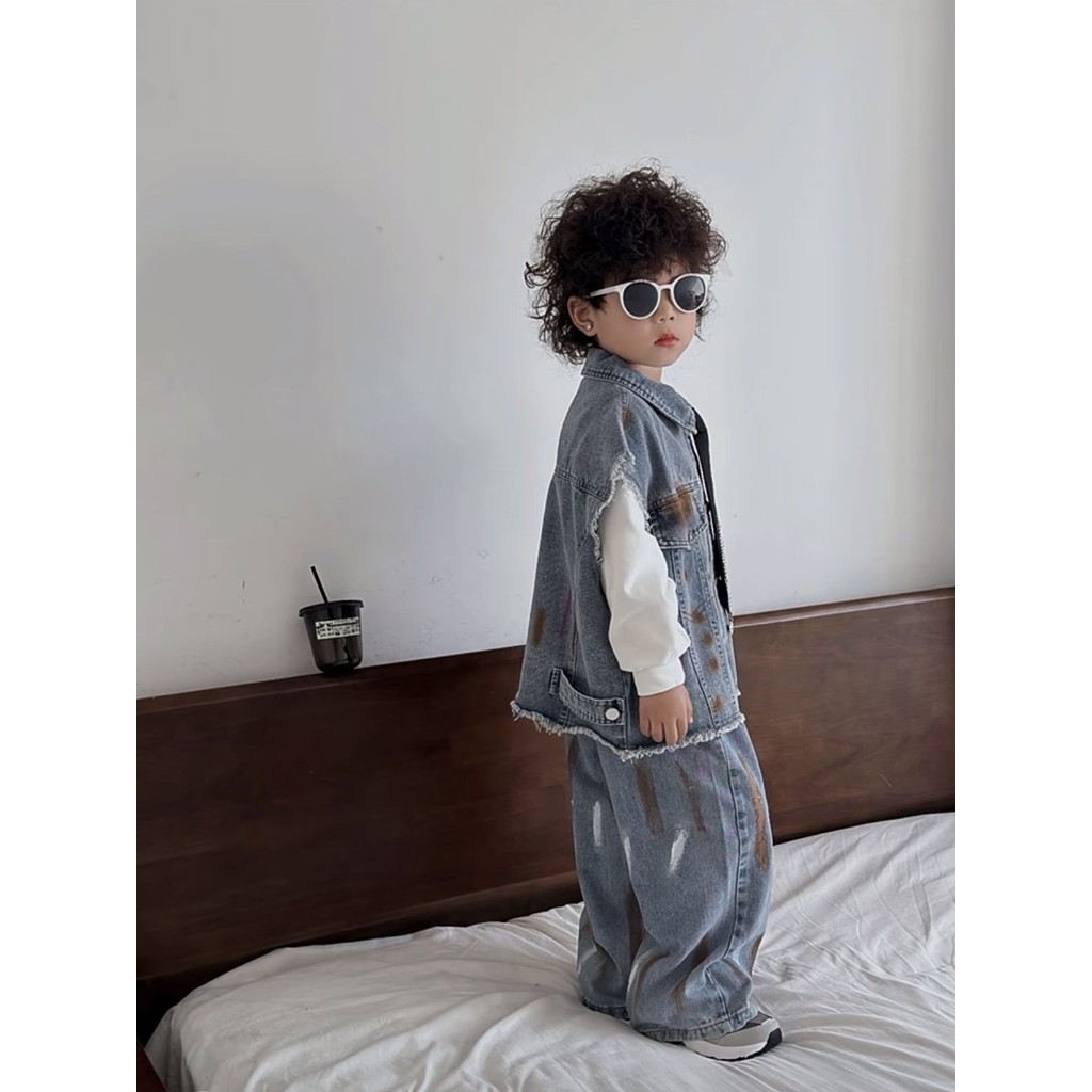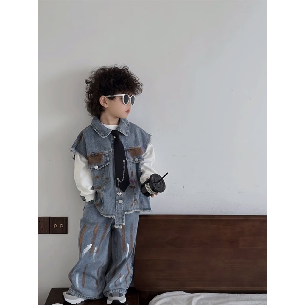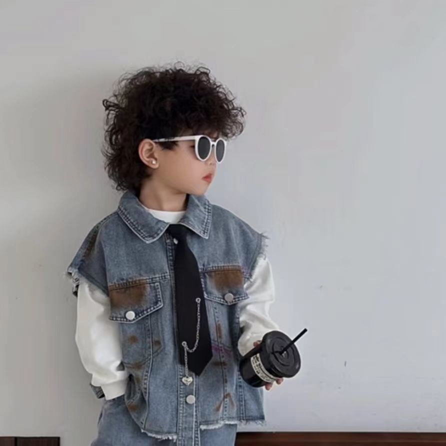 ชุดเสื้อกั๊กยีนส์เด็กชายฤดูใบไม้ผลิและฤดูใบไม้ร่วงสไตล์ร้อนสไตล์ตะวันตกใหม่เด็กลำลองฤดูใบไม้ร่วงกางเกงยีนส์สองชิ้น