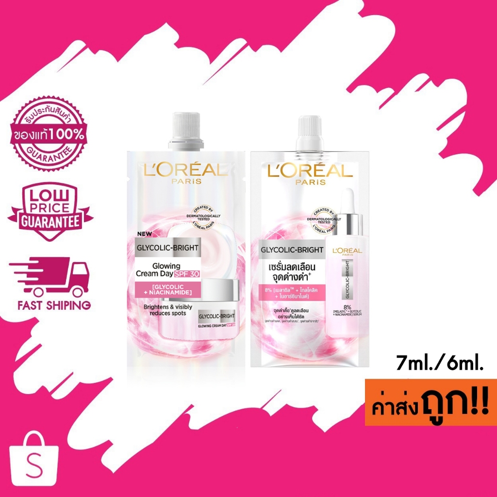 (แบบซอง) L'Oréal Loreal Glycolic-Bright Cream / Serum ลอรีอัล ปารีส ไกลโคลิค-ไบรท์ ครีม / เซรั่ม