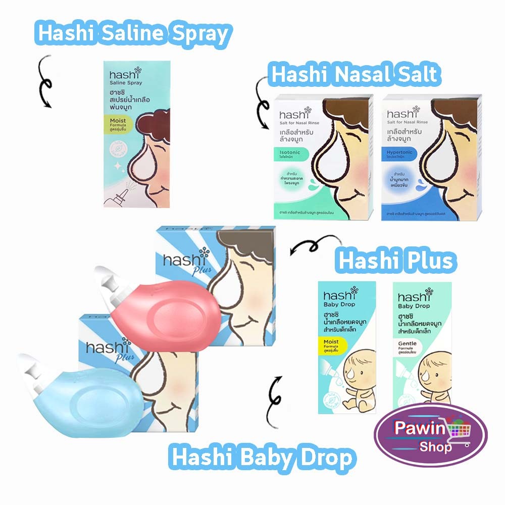 Hashi ฮาชิ รวมอุปกรณ์ล้างจมูก พร้อมซอง [15 ซอง]/ สเปรย์พ่น / น้ำเกลือแบบหยด/ เกลือล้างจมูก [30 ซอง]/ชุดดูดน้ำมูกเด็ก.