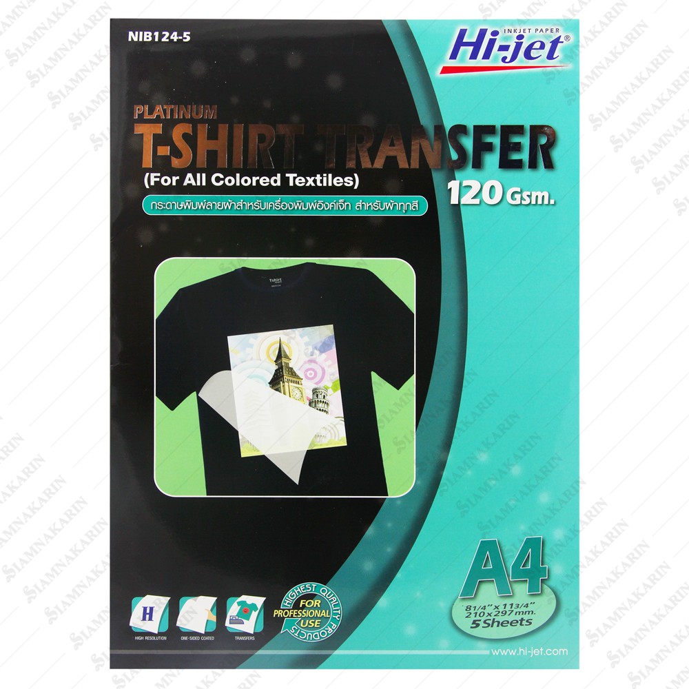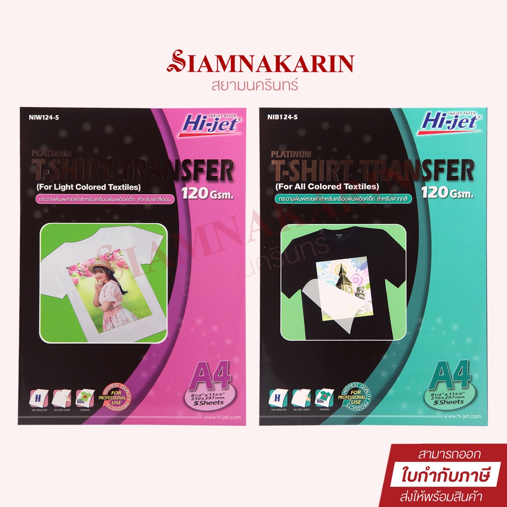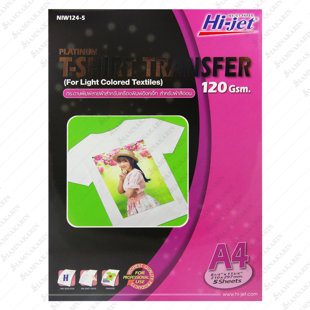 T-SHIRT TRANSFER กระดาษเคมีรีดเสื้อ 120 แกรม สำหรับผ้าทุกสี A4 / สำหรับผ้าสีอ่อน (5 แผ่น)